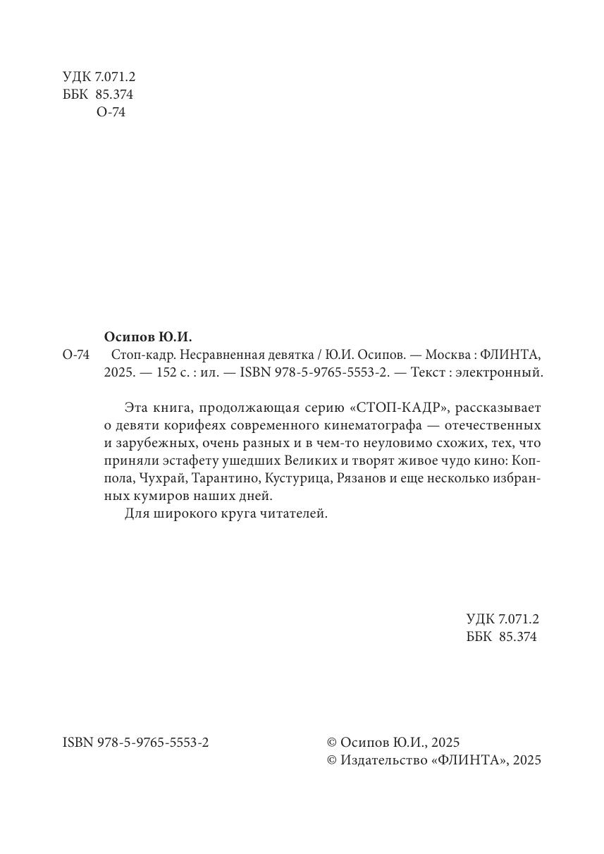 Эта книга, продолжающая серию «СТОП-КАДР», рассказывает о девяти корифеях современного кинематографа — отечественных и зарубежных, очень разных и в чем-то неуловимо схожих, тех, что приняли эстафету ушедших Великих и творят живое чудо кино: Коппола, Чухрай, Тарантино, Кустурица, Рязанов и еще несколько избранных кумиров наших дней. Для широкого круга читателей.