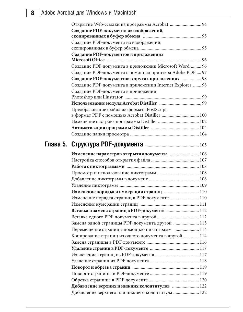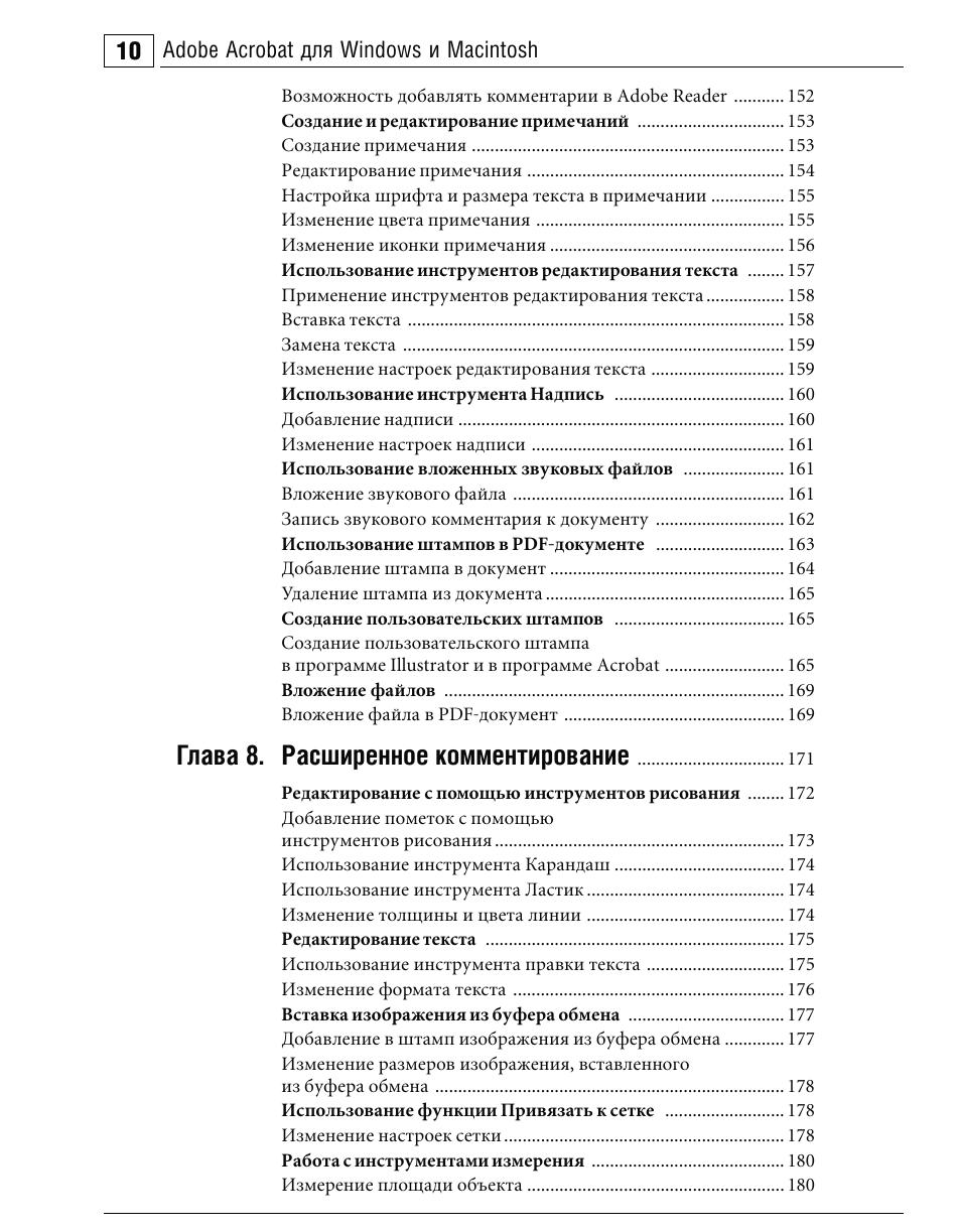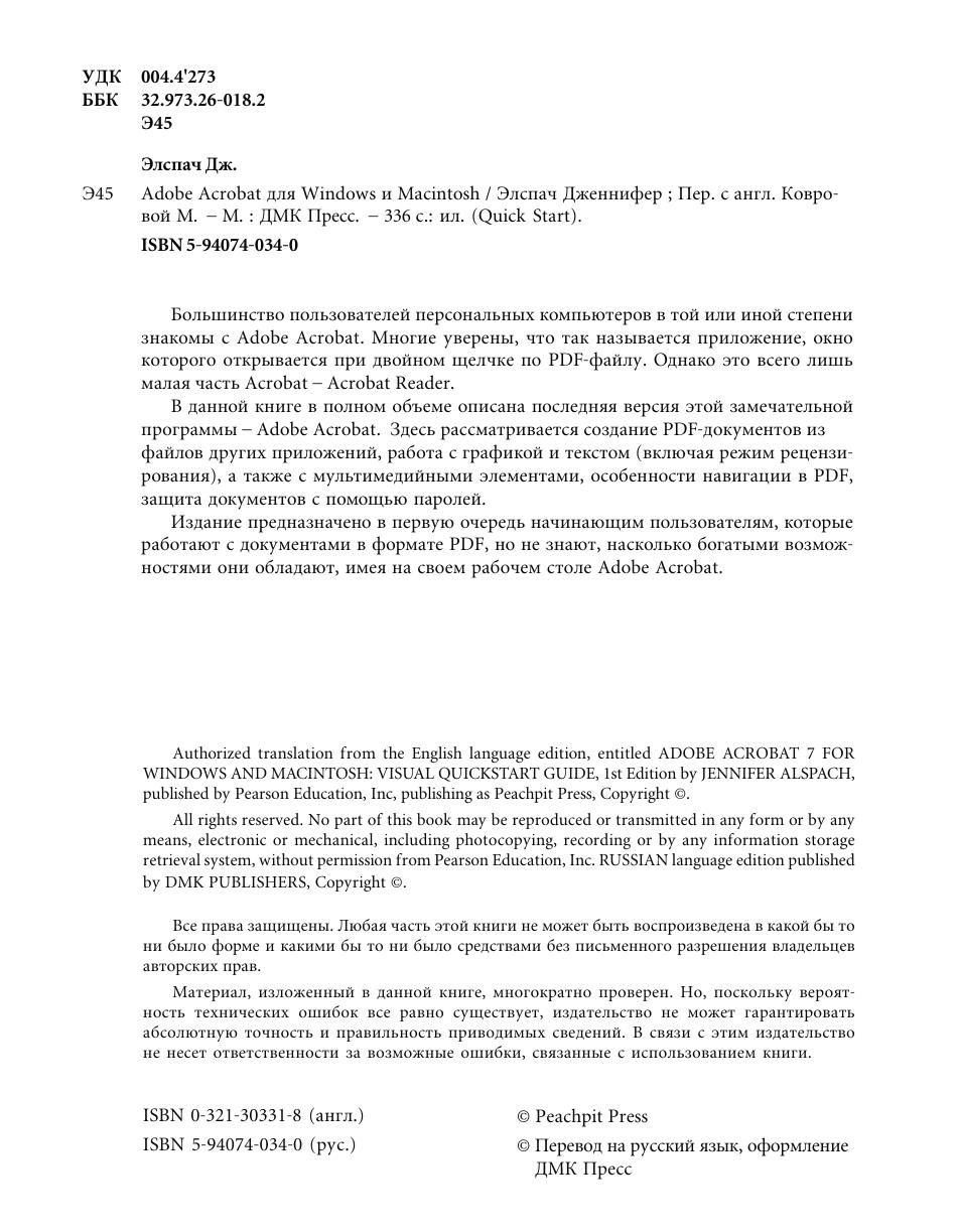 Большинство пользователей персональных компьютеров в той или иной степени знакомы с Adobe Acrobat. Многие уверены, что так называется приложение, окно которого открывается при двойном щелчке по PDF-файлу. Однако это всего лишь малая часть Acrobat – Acrobat Reader. В данной книге в полном объеме описана последняя версия этой замечательной программы – Adobe Acrobat. Здесь рассматривается создание PDF-документов из файлов других приложений, работа с графикой и текстом (включая режим рецензирования), а также с мультимедийными элементами, особенности навигации в PDF, защита документов с помощью паролей. Издание предназначено в первую очередь начинающим пользователям, которые работают с документами в формате PDF, но не знают, насколько богатыми возможностями они обладают, имея на своем рабочем cтоле Adobe Acrobat.
