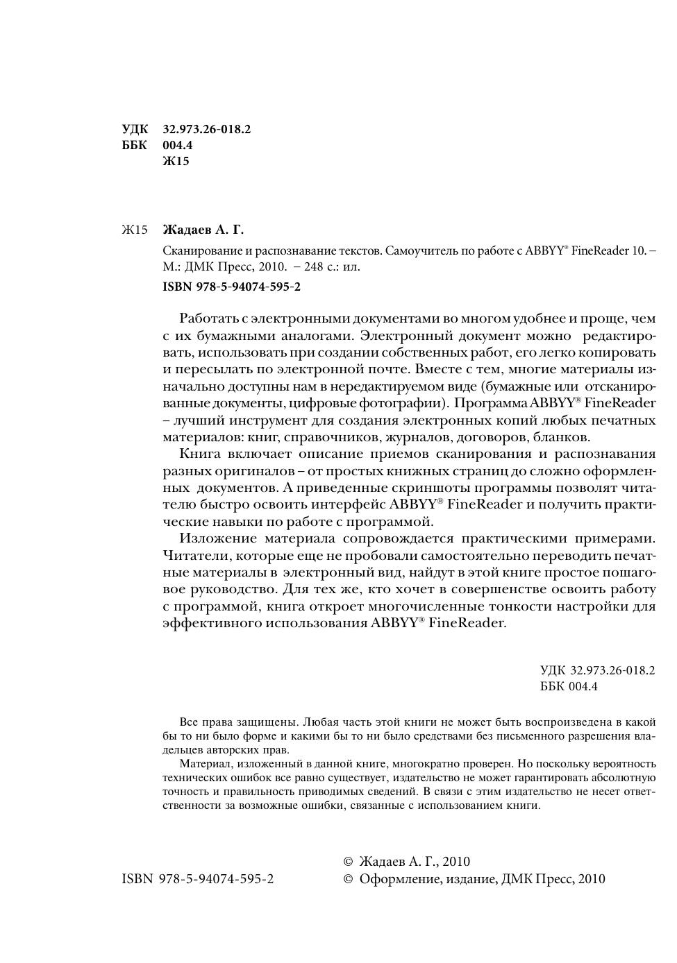 Работать с электронными документами во многом удобнее и проще, чем с их бумажными аналогами. Электронный документ можно редактировать, использовать при создании собственных работ, его легко копировать и пересылать по электронной почте. Вместе с тем, многие материалы изначально доступны нам в нередактируемом виде (бумажные или отсканированные документы, цифровые фотографии). Программа ABBYY® FineReader – лучший инструмент для создания электронных копий любых печатных материалов: книг, справочников, журналов, договоров, бланков. Книга включает описание приемов сканирования и распознавания разных оригиналов – от простых книжных страниц до сложно оформленных документов. А приведенные скриншоты программы позволят читателю быстро освоить интерфейс ABBYY® FineReader и получить практические навыки по работе с программой. Изложение материала сопровождается практическими примерами. Читатели, которые еще не пробовали самостоятельно переводить печатные материалы в электронный вид, найдут в этой книге простое пошаговое руководство. Для тех же, кто хочет в совершенстве освоить работу с программой, книга откроет многочисленные тонкости настройки для эффективного использования ABBYY® FineReader.