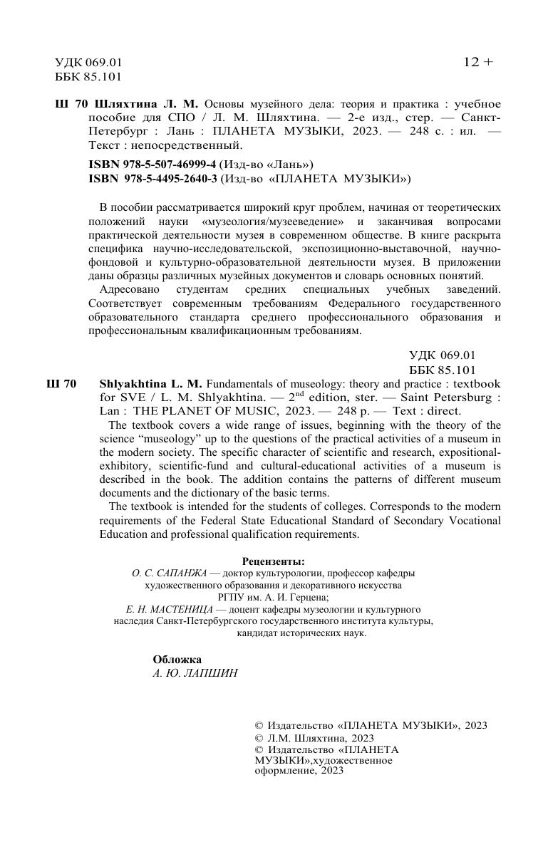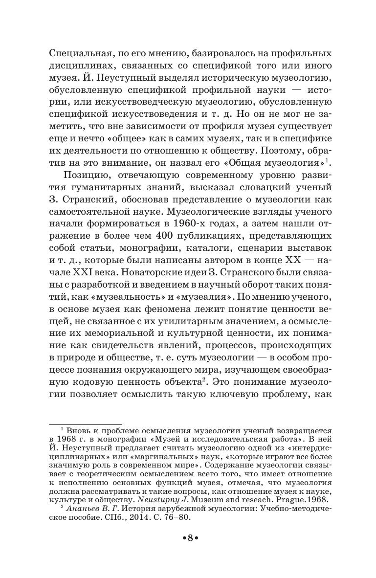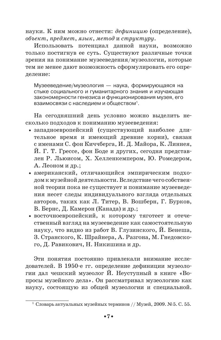 В пособии рассматривается широкий круг проблем, начиная от теоретических положений науки «музеология/музееведение» и заканчивая вопросами практической деятельности музея в современном обществе. В книге раскрыта специфика научно-исследовательской, экспозиционно-выставочной, научно-фондовой и культурно-образовательной деятельности музея. В приложении даны образцы различных музейных документов и словарь основных понятий. Соответствует современным требованиям Федерального государственного образовательного стандарта среднего профессионального образования и профессиональным квалификационным требованиям. Адресовано студентам средних специальных учебных заведений. The textbook covers a wide range of issues, beginning with the theory of the science “museology” up to the questions of the practical activities of a museum in the modern society. The specific character of scientific and research, expositional-exhibitory, scientific-fund and cultural-educational activities of a museum is described in the book. The addition contains the patterns of different museum documents and the dictionary of the basic terms. Corresponds to the modern requirements of the Federal State Educational Standard of Secondary Vocational Education and professional qualification requirements. The textbook is intended for the students of colleges.