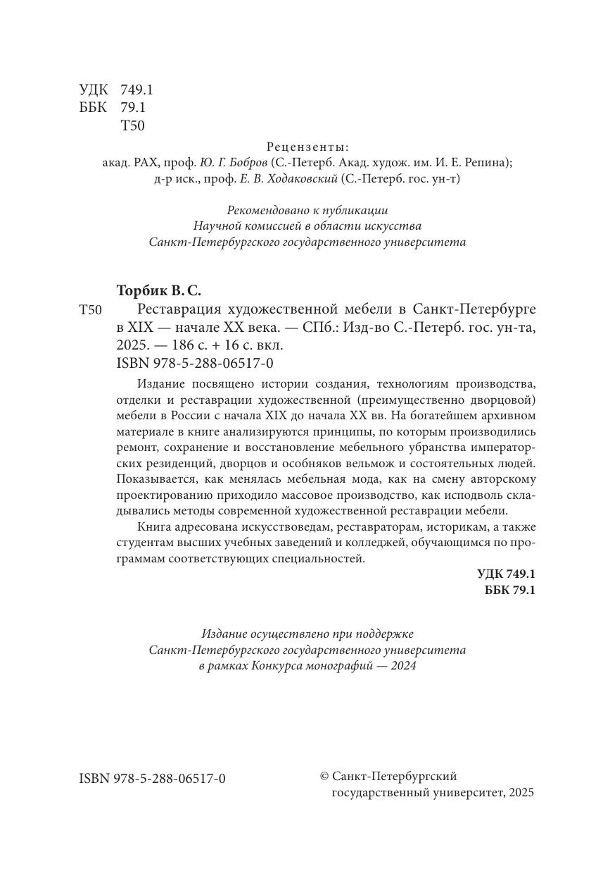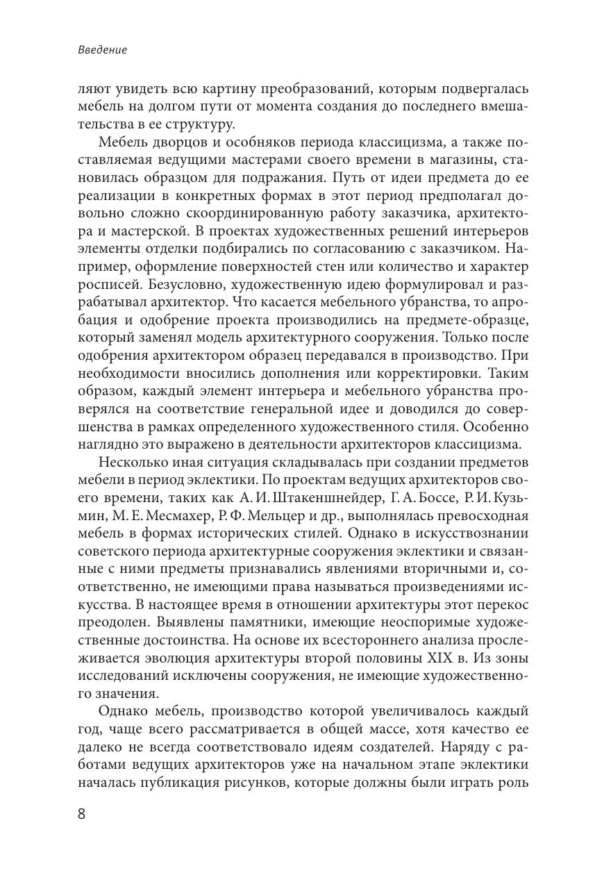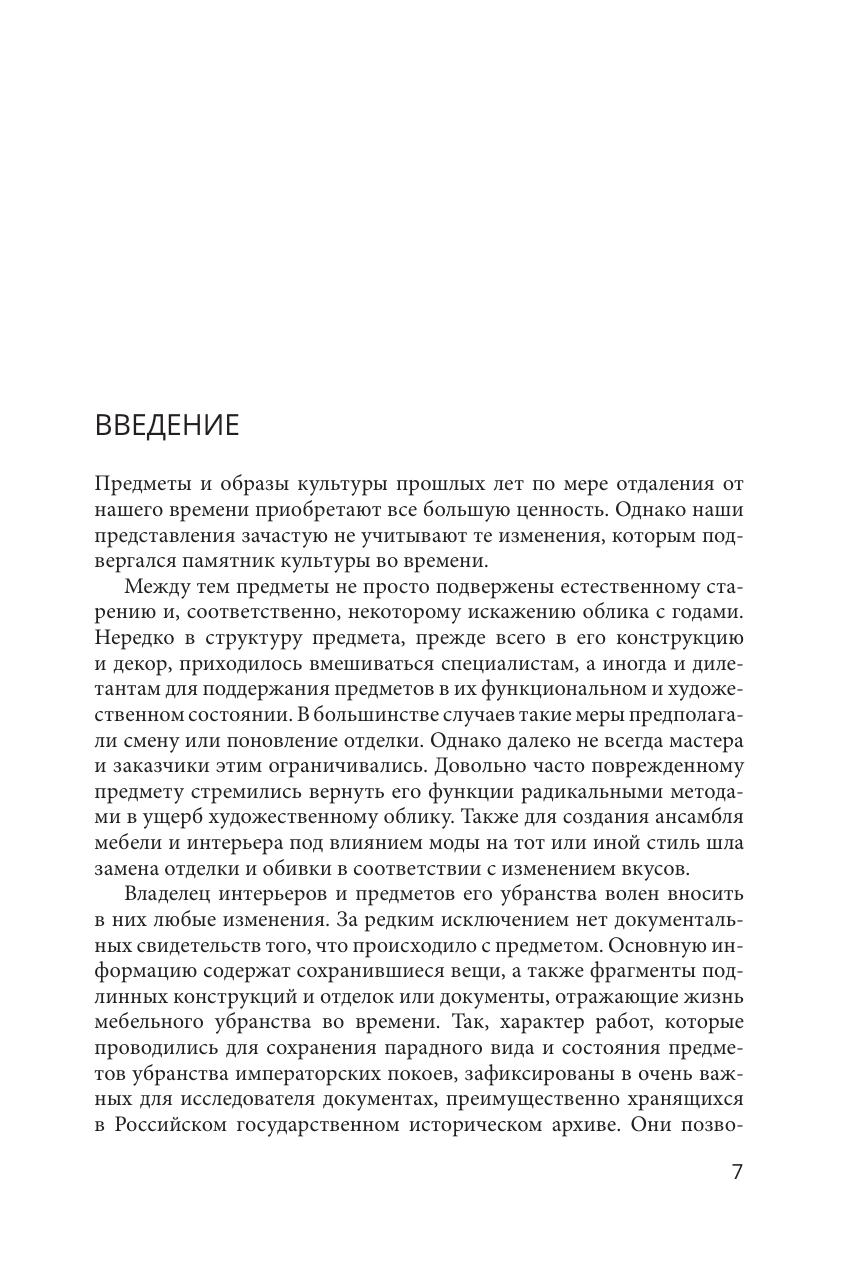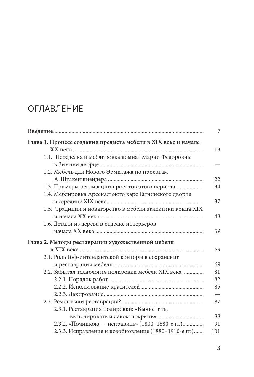 Издание посвящено истории создания, технологиям производства, отделки и реставрации художественной (преимущественно дворцовой) мебели в России с начала XIX до начала XX вв. На богатейшем архивном материале в книге анализируются принципы, по которым производились ремонт, сохранение и восстановление мебельного убранства императорских резиденций, дворцов и особняков вельмож и состоятельных людей. Показывается, как менялась мебельная мода, как на смену авторскому проектированию приходило массовое производство, как исподволь складывались методы современной художественной реставрации мебели. Книга адресована искусствоведам, реставраторам, историкам, а также студентам высших учебных заведений и колледжей, обучающимся по программам соответствующих специальностей.