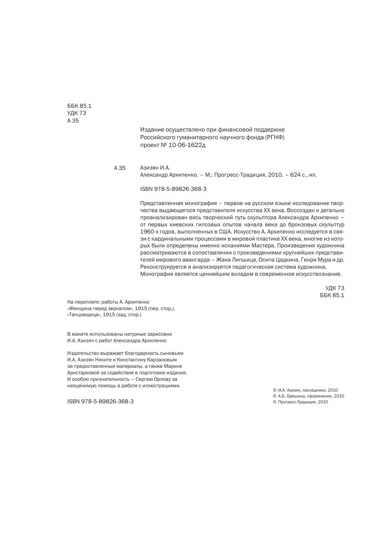 Представленная монография – первое на русском языке исследование творчества выдающегося представителя искусства XX века. Воссоздан и детально проанализирован весь творческий путь скульптора Александра Архипенко – от первых киевских гипсовых опытов начала века до бронзовых скульптур 1960-х годов, выполненных в США. Искусство А. Архипенко исследуется в связи с кардинальными процессами в мировой пластике XX века, многие из которых были определены именно исканиями Мастера. Произведения художника рассматриваются в сопоставлении с произведениями крупнейших представителей мирового авангарда – Жака Липшица, Осипа Цадкина, Генри Мура и др. Реконструируется и анализируется педагогическая система художника.
