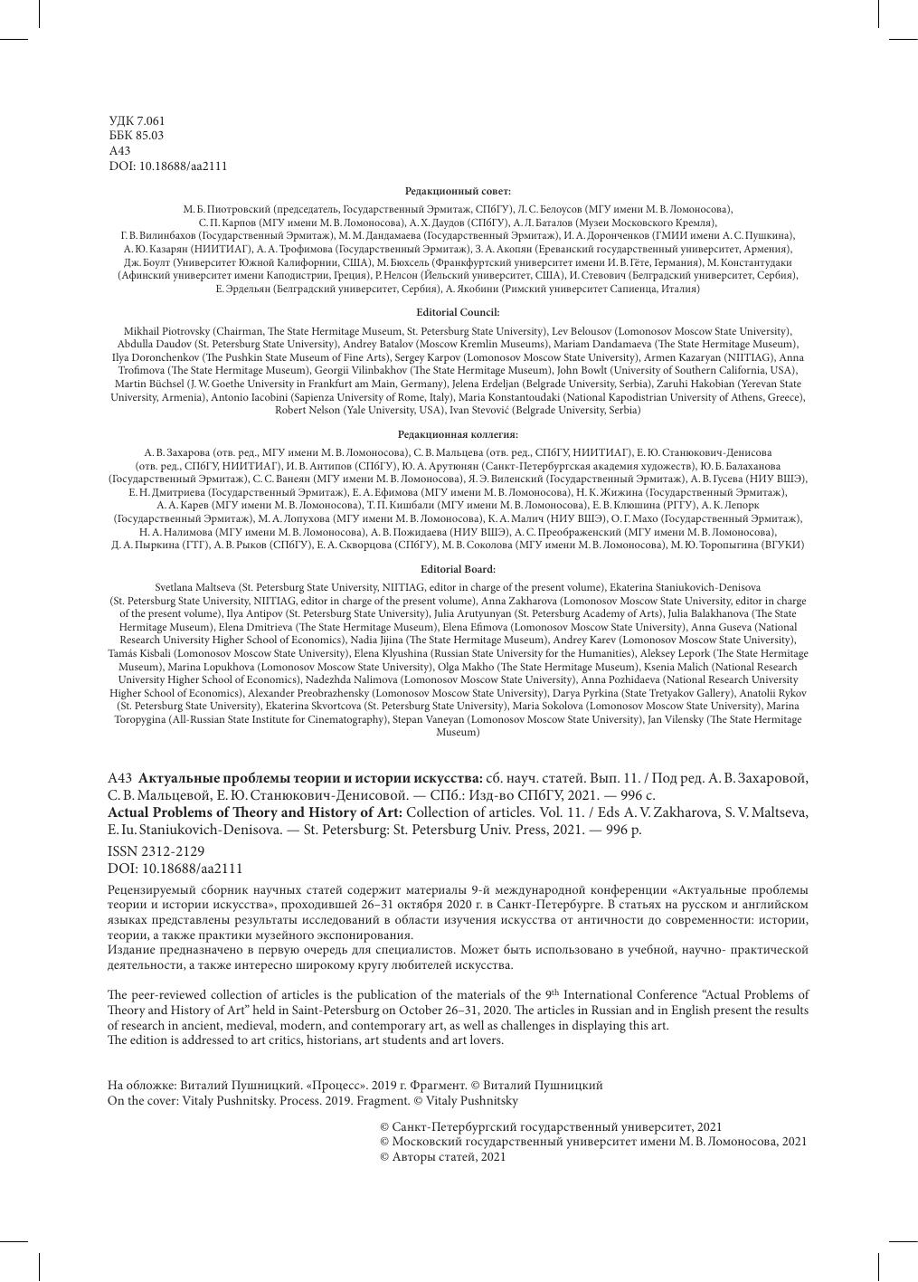 Рецензируемый сборник научных статей содержит материалы 9-й международной конференции "Актуальные проблеммы теории и истории искусства", проходившей 26-31 октября 2020 г. в Санкт-Петербурге. В статьях на русском и английском языках представлены результатф исследований в области изучения искусства античности до современности: истории, теории, а также практики музейного экспонирования.