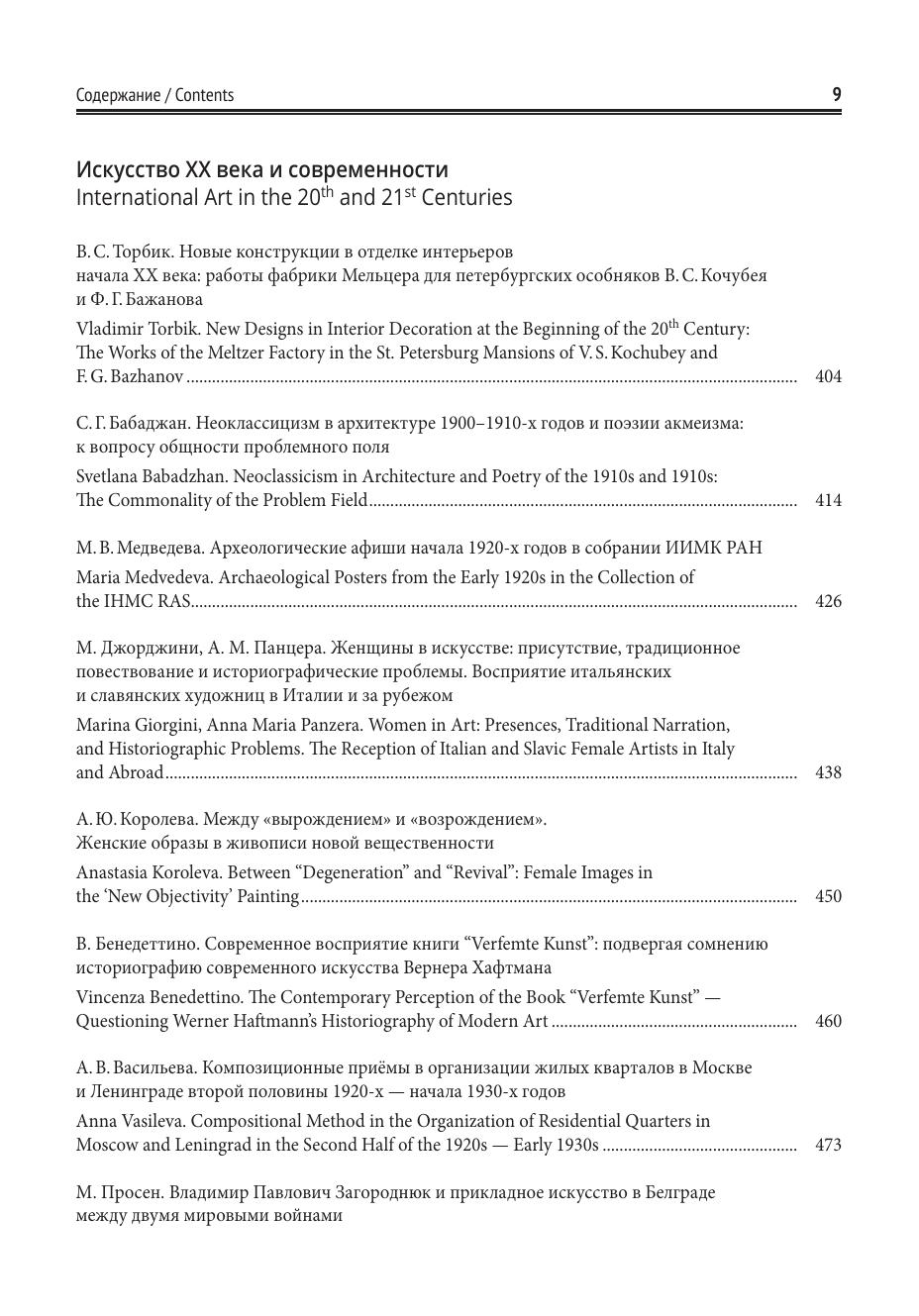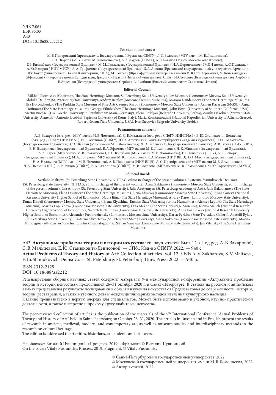 Рецензируемый сборник научных статей содержит материалы 9-й международной конференции "Актуальные проблемы теории и истории искусства", проходившей 26-31 октября 2020 г. в Санкт-Петербурге. В статьях на русском и английском языках представлены результаты исследований в области изучения искусства от Средневековья до современности: истории, теории, реставрации, а также музейного дела и междисциплинарных методов изучения культурного наследия. Издание предназначено в первую очередь для специалистов. Может быть использовано в учебной, научно-практической деятельности, а также интересно широкому кругу любителей искусства.
