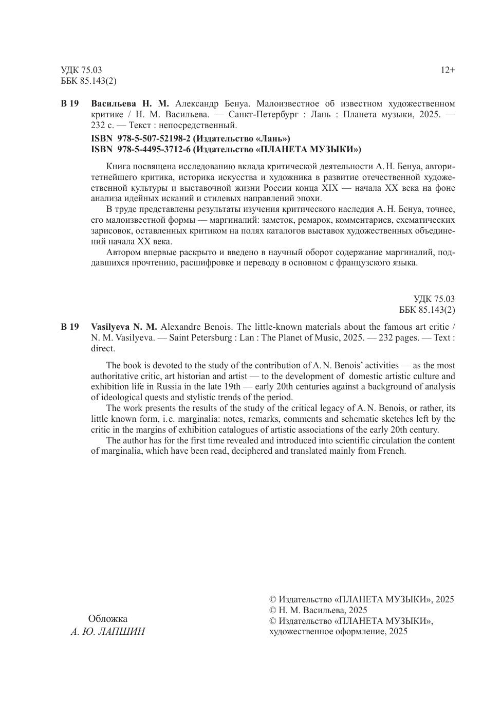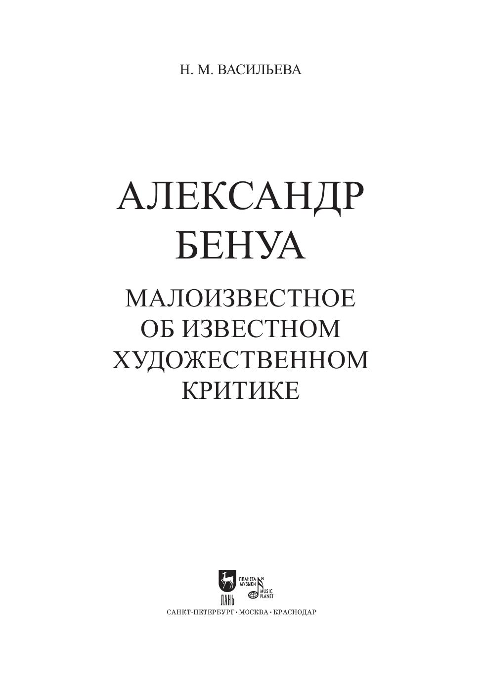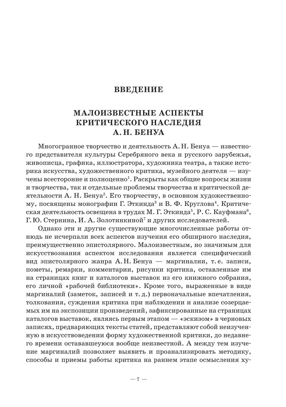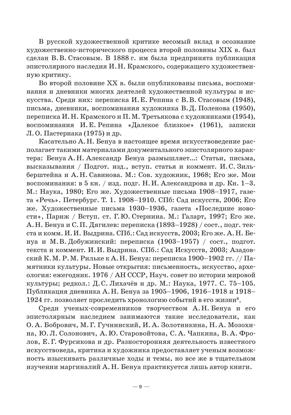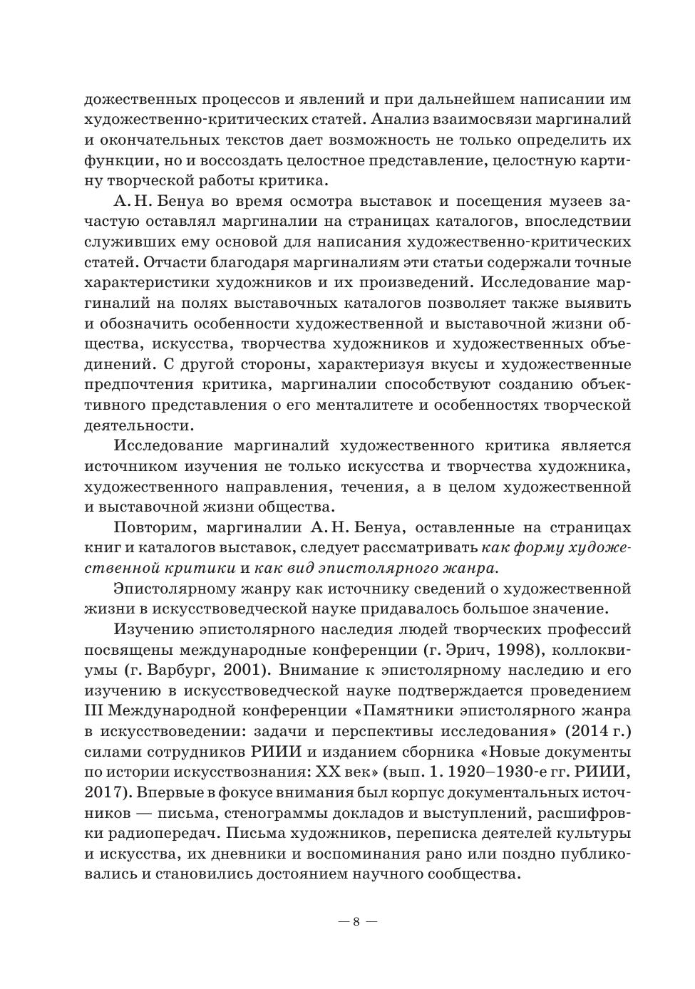 Книга посвящена исследованию вклада критической деятельности А. Н. Бенуа, авторитетнейшего критика, историка искусства и художника в контексте развития отечественной художественной культуры и выставочной жизни России конца XIX – начала ХХ века на фоне анализа идейных исканий и стилевых направлений эпохи. В труде представлены результаты изучения критического наследия А. Н. Бенуа, точнее, его малоизвестной формы — маргиналий: заметок, ремарок, комментариев, схематических зарисовок, оставленных критиком на полях каталогов выставок художественных объединений начала ХХ века. Автором впервые раскрыто и введено в научный оборот содержание маргиналий, поддавшихся прочтению, расшифровке и переводу в основном с французского языка. The book is devoted to the study of the contribution of A. N. Benois’ activities — as the most authoritative critic, art historian and artist — to the development of domestic artistic culture and exhibition life in Russia in the late 19th — early 20th centuries against a background of analysis of ideological quests and stylistic trends of the period. The work presents the results of the study of the critical legacy of A. N. Benois, or rather, its little known form, i. e. marginalia: notes, remarks, comments and schematic sketches left by the critic in the margins of exhibition catalogues of artistic associations of the early 20th century. The author has for the first time revealed and introduced into scientific circulation the content of marginalia, which have been read, deciphered and translated mainly from French.