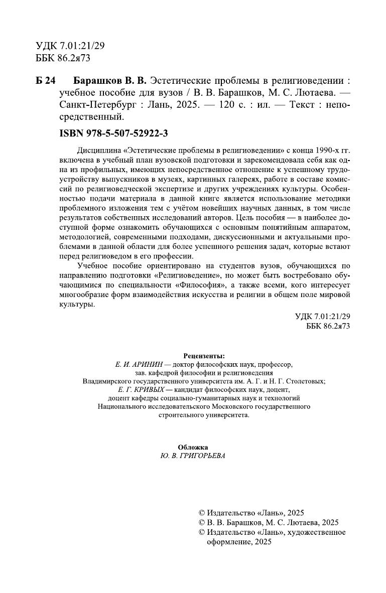 Дисциплина «Эстетические проблемы в религиоведении» с конца 1990-х гг. включена в учебный план вузовской подготовки и зарекомендовала себя как одна из профильных, имеющих непосредственное отношение к успешному трудоустройству выпускников в музеях, картинных галереях, работе в составе комиссий по религиоведческой экспертизе и других учреждениях культуры. Особенностью подачи материала в данной книге является использование методики проблемного изложения тем с учётом новейших научных данных, в том числе результатов собственных исследований авторов. Цель пособия — в наиболее доступной форме ознакомить обучающихся с основным понятийным аппаратом, методологией, современными подходами, дискуссионными и актуальными проблемами в данной области для более успешного решения задач, которые встают перед религиоведом в его профессии. Учебное пособие ориентировано на студентов вузов, обучающихся по направлению подготовки «Религиоведение», но может быть востребовано обучающимися по специальности «Философия», а также всеми, кого интересует многообразие форм взаимодействия искусства и религии в общем поле мировой культуры.