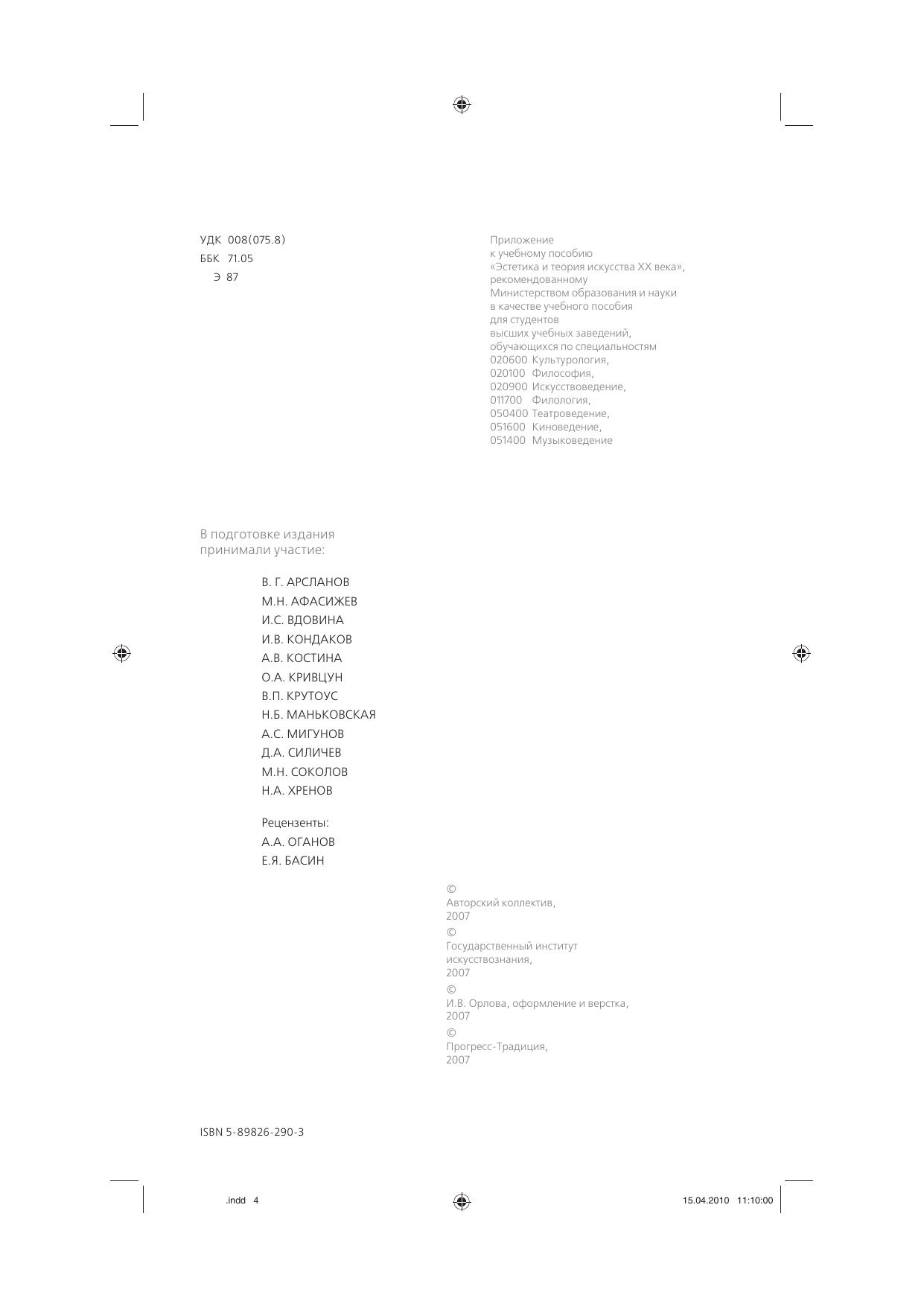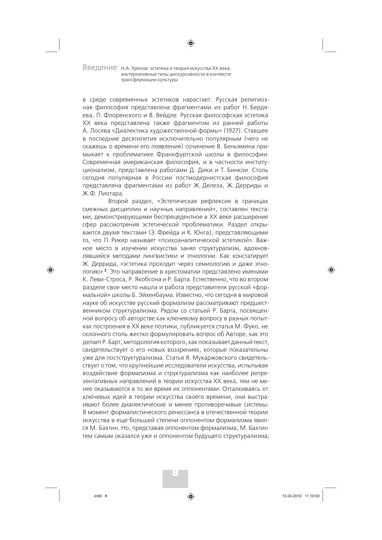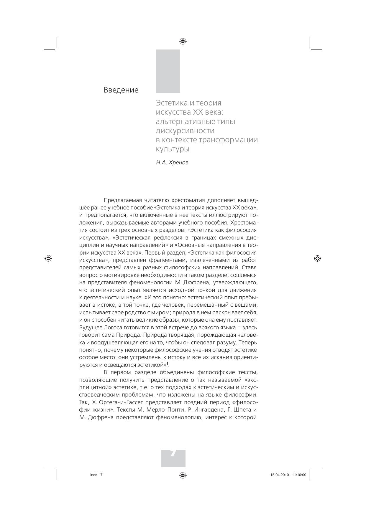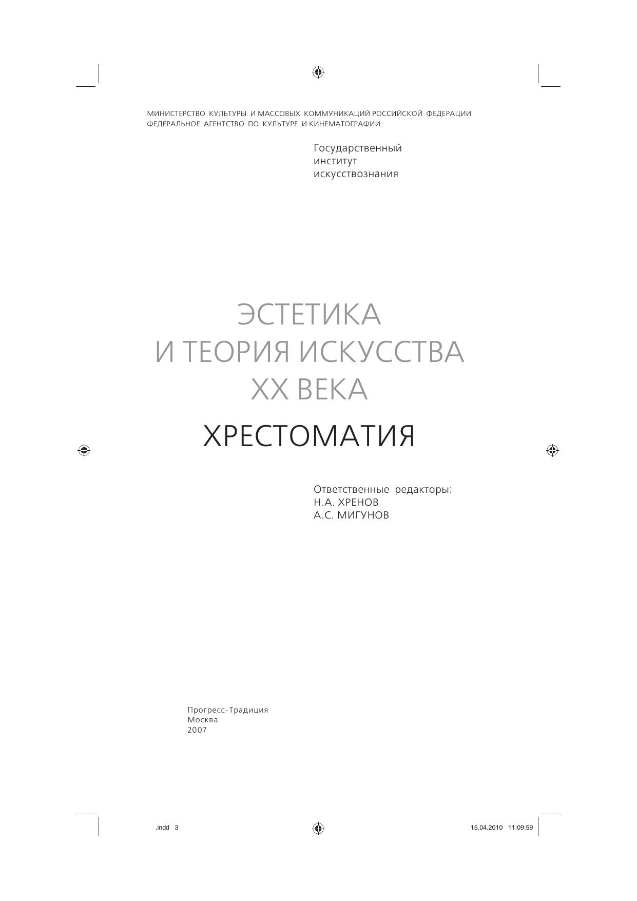 Данная хрестоматия является приложением к учебному пособию "Эстетика и теория искусства ХХ века", в котором философско-искусствоведческая рефлексия об искусстве рассматривается в историко-культурном аспекте. Структура хрестоматии состоит из трех разделов. Первый раздел составлен из текстов, которые являются репрезентативными для традиционного в эстетической и теоретической мысли направления – философии искусства. Второй раздел состоит из текстов, свидетельствующих о существовании теоретических концепций искусства, возникших в границах смежных с эстетикой и искусствознанием дисциплин. Для третьего раздела отобраны некоторые тексты, представляющие собственно теорию искусства и позволяющие представить, как она развивалась в границах не только философии и эксплицитной эстетики, но и в границах искусствознания.