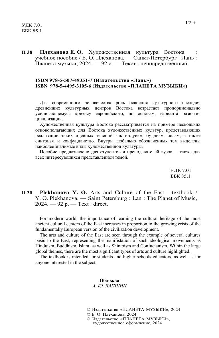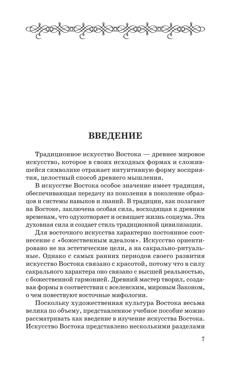 Для современного человечества роль освоения культурного наследия древнейших культурных центров Востока возрастает пропорционально усиливающемуся кризису европейского, по основам, варианта развития цивилизации. Художественная культура Востока рассматривается на примере нескольких, основополагающих для Востока художественных культур, представляющих реализации таких идейных течений как индуизм, буддизм, ислам, а также синтоизм и конфуцианство. Внутри глобально обозначенных тем выделены наиболее значимые виды художественной культуры. человеком, как неотъемлемая часть его внутреннего духовного мира. Пособие предназначено для студентов и преподавателей вузов, а также для всех интересующихся представленной темой. For modern world, the importance of learning the cultural heritage of the most ancient cultural centers of the East increases in proportion to the growing crisis of the fundamentally European version of the civilization development. The arts and culture of the East are seen through the example of several cultures basic to the East, representing the manifistation of such ideological movements as Hinduism, Buddhism, Islam, as well as Shintoism and Confucianism. Within the large global themes, there are the most significant types of arts and culture highlighted. The textbook is intended for students and higher schools educators, as well as for anyone interested in the subject.