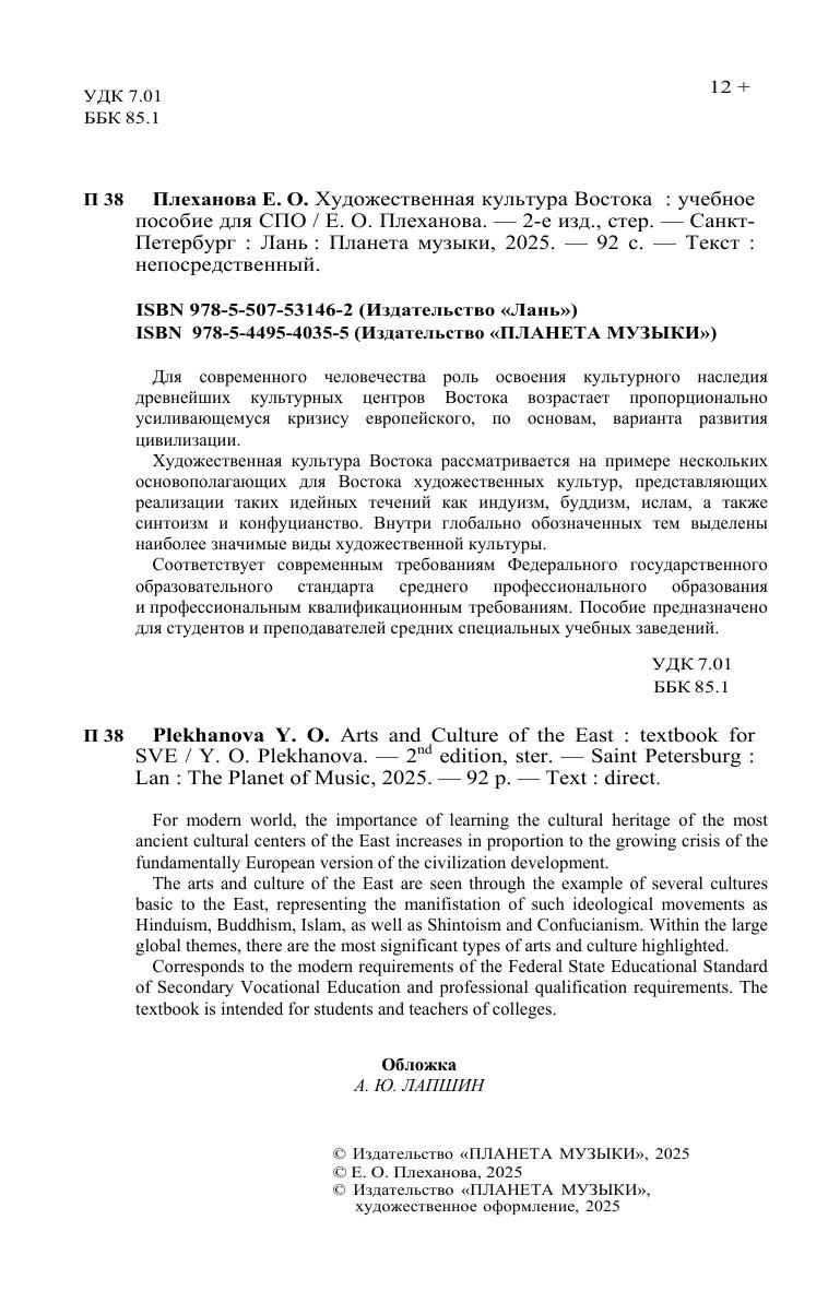 Для современного человечества роль освоения культурного наследия древнейших культурных центров Востока возрастает пропорционально усиливающемуся кризису европейского, по основам, варианта развития цивилизации. Художественная культура Востока рассматривается на примере нескольких, основополагающих для Востока художественных культур, представляющих реализации таких идейных течений как индуизм, буддизм, ислам, а также синтоизм и конфуцианство. Внутри глобально обозначенных тем выделены наиболее значимые виды художественной культуры. человеком, как неотъемлемая часть его внутреннего духовного мира. Соответствует современным требованиям Федерального государственного образовательного стандарта среднего профессионального образования и профессиональным квалификационным требованиям. Пособие предназначено для студентов и преподавателей средних специальных учебных заведений. For modern world, the importance of learning the cultural heritage of the most ancient cultural centers of the East increases in proportion to the growing crisis of the fundamentally European version of the civilization development. The arts and culture of the East are seen through the example of several cultures basic to the East, representing the manifistation of such ideological movements as Hinduism, Buddhism, Islam, as well as Shintoism and Confucianism. Within the large global themes, there are the most significant types of arts and culture highlighted. Corresponds to the modern requirements of the Federal State Educational Standard of Secondary Vocational Education and professional qualification requirements. The textbook is intended for students and teachers of colleges.