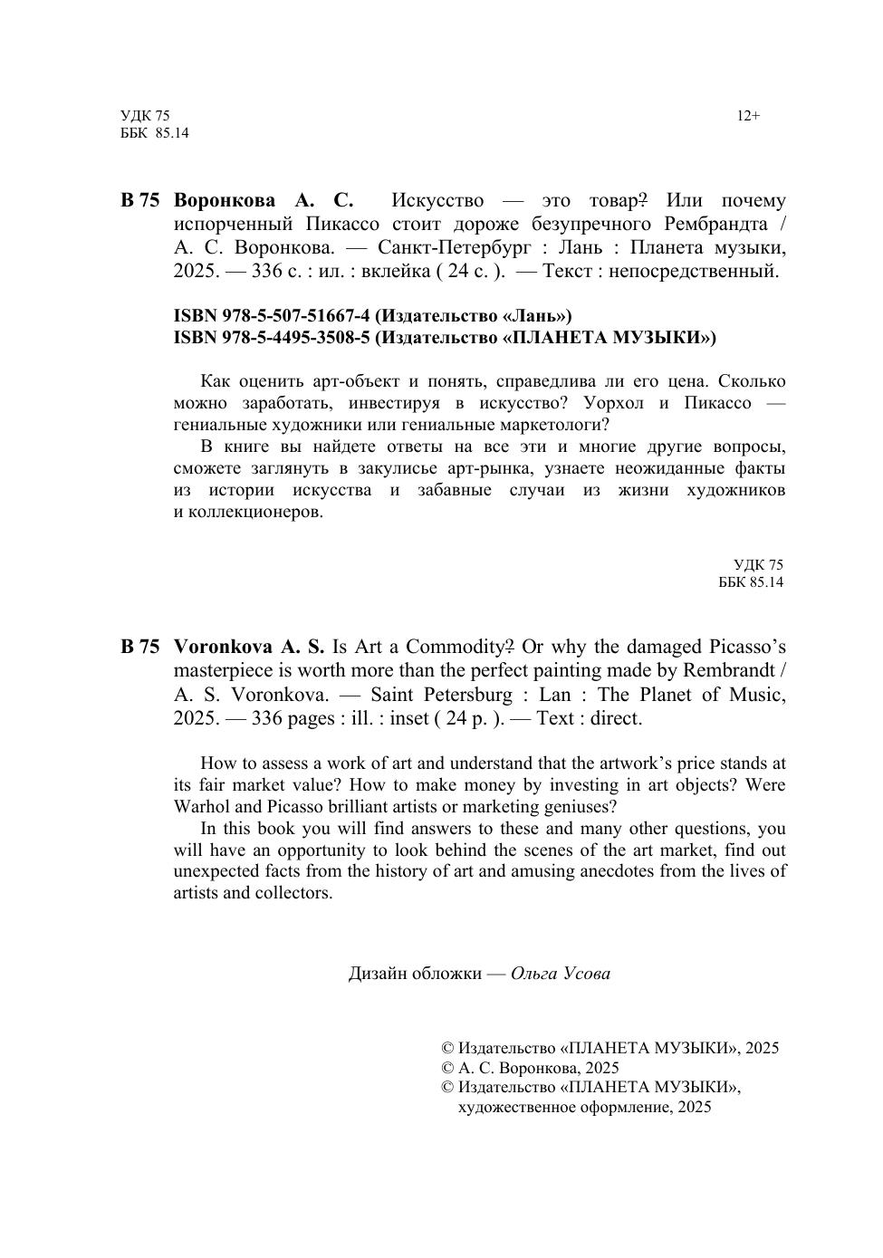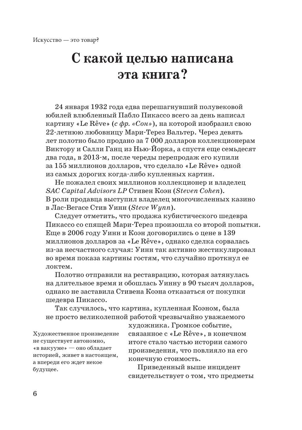 Как оценить арт-объект и понять, справедлива ли его цена. Сколько можно заработать, инвестируя в искусство? Уорхол и Пикассо — гениальные художники или гениальные маркетологи? В книге вы найдете ответы на все эти и многие другие вопросы, сможете заглянуть в закулисье арт-рынка, узнаете неожиданные факты из истории искусства и забавные случаи из жизни художников и коллекционеров. How to assess a work of art and understand that the artwork’s price stands at its fair market value? How to make money by investing in art objects? Were Warhol and Picasso brilliant artists or marketing geniuses? In this book you will find answers to these and many other questions, you will have an opportunity to look behind the scenes of the art market, find out unexpected facts from the history of art and amusing anecdotes from the lives of artists and collectors.