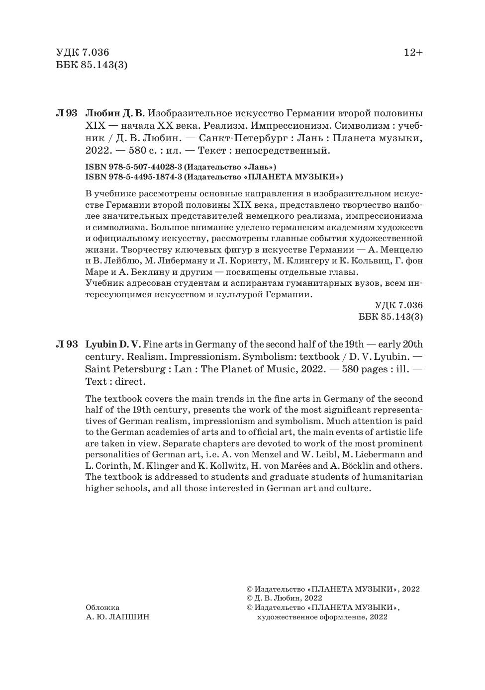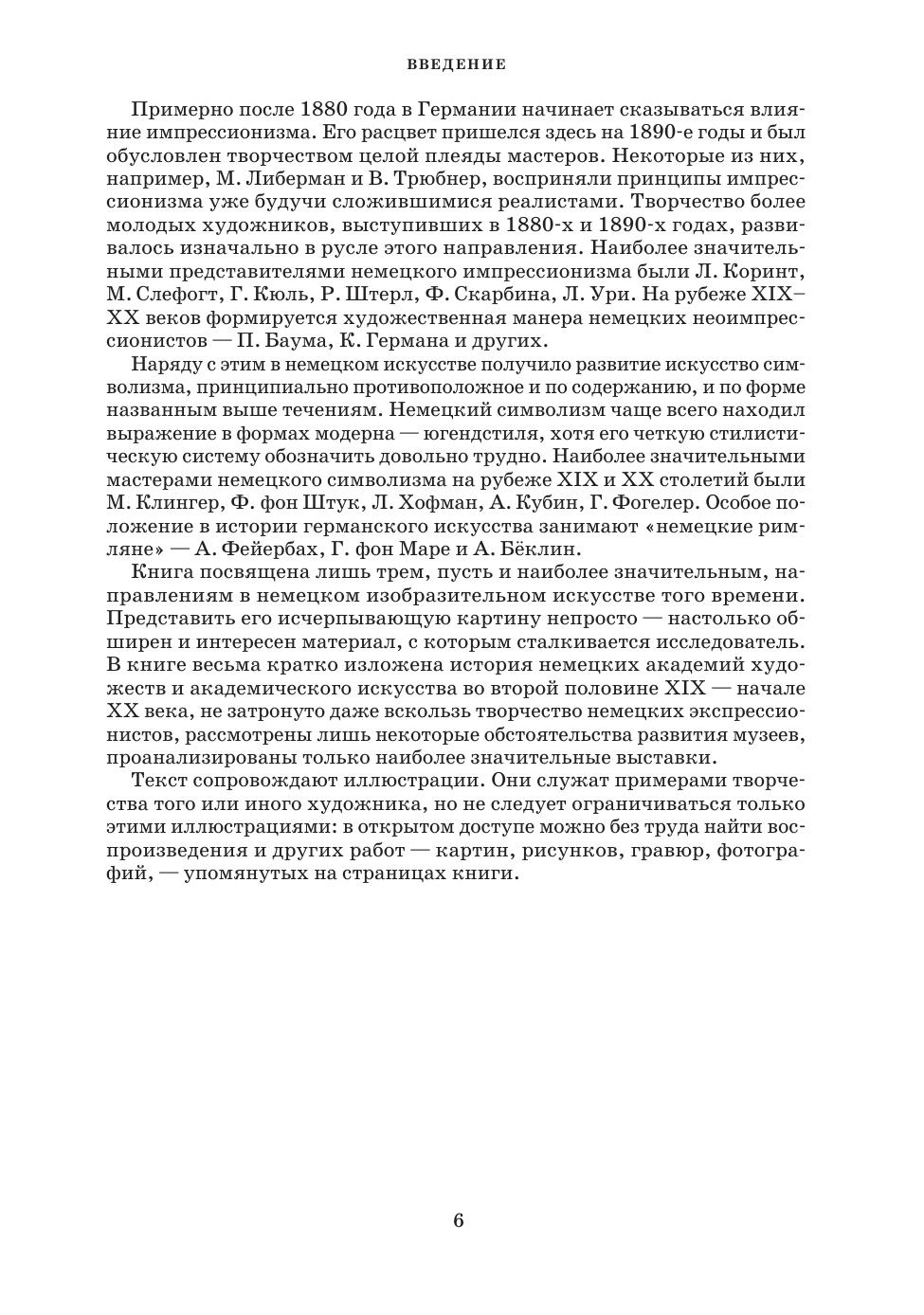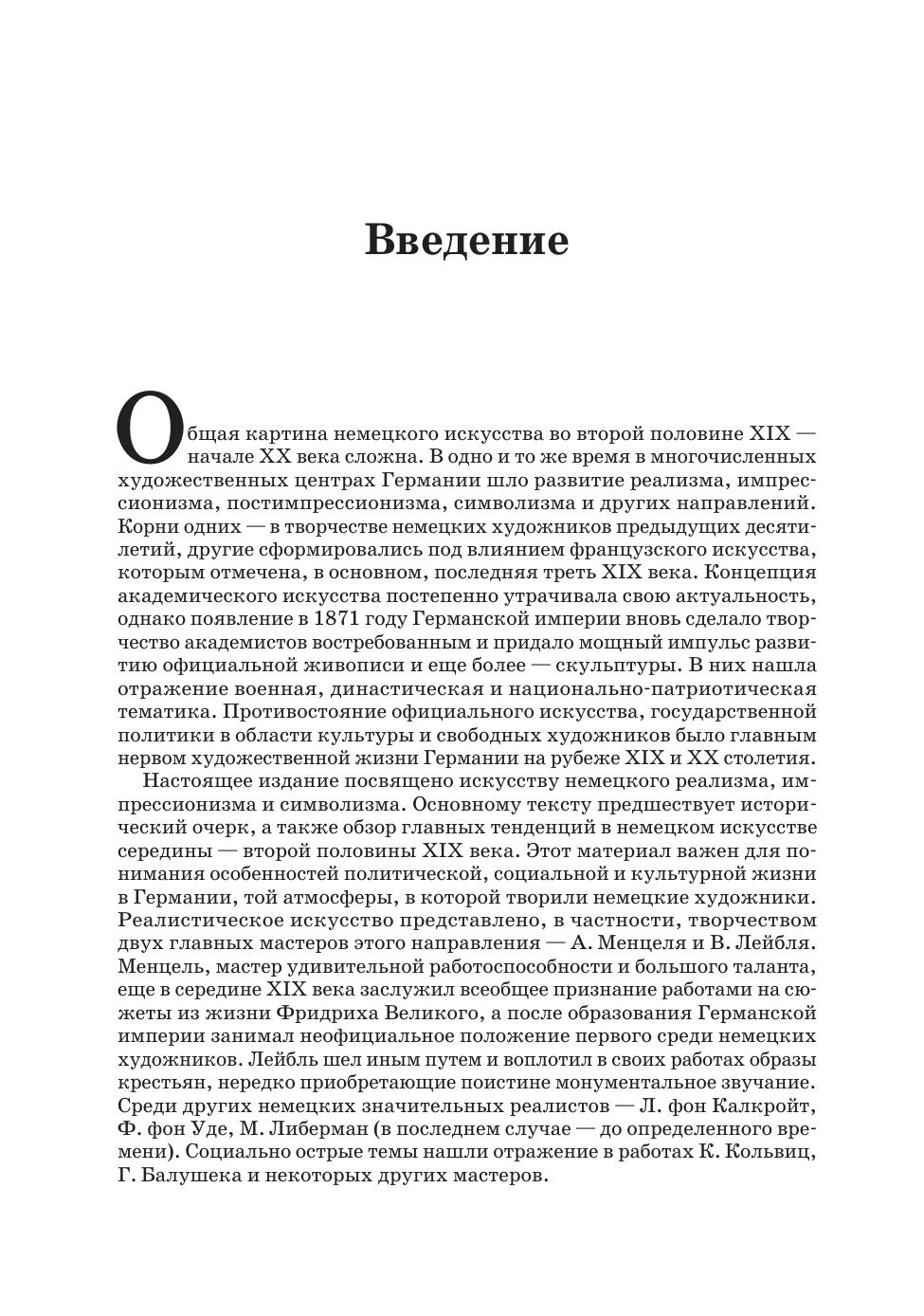 В учебнике рассмотрены основные направления в изобразительном искусстве Германии второй половины XIX века, представлено творчество наиболее значительных представителей немецкого реализма, импрессионизма и символизма. Большое внимание уделено германским академиям художеств и официальному искусству, рассмотрены главные события художественной жизни. Творчеству ключевых фигур в искусстве Германии – А. Менцелю и В. Лейблю, М. Либерману и Л. Коринту, М. Клингеру и К. Кольвиц, Г. фон Маре и А. Беклину и другим посвящены отдельные главы.