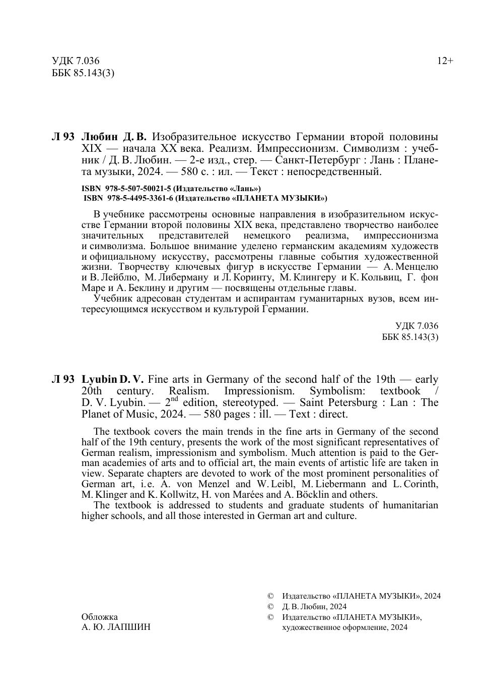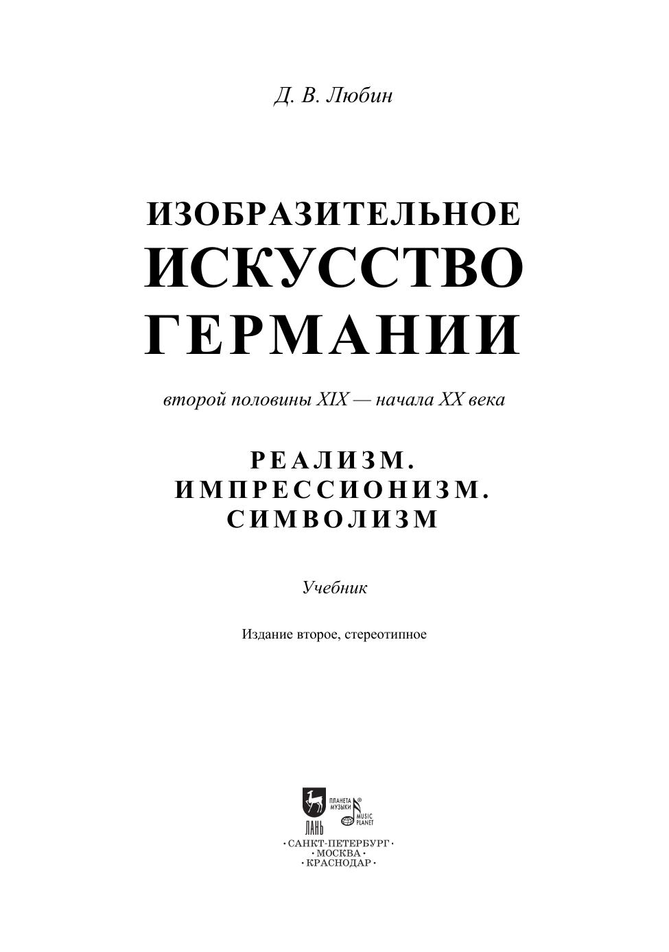 В учебнике рассмотрены основные направления в изобразительном искусстве Германии второй половины XIX века, представлено творчество наиболее значительных представителей немецкого реализма, импрессионизма и символизма. Большое внимание уделено германским академиям художеств и официальному искусству, рассмотрены главные события художественной жизни. Творчеству ключевых фигур в искусстве Германии – А. Менцелю и В. Лейблю, М. Либерману и Л. Коринту, М. Клингеру и К. Кольвиц, Г. фон Маре и А. Беклину и другим посвящены отдельные главы. Учебник адресован студентам и аспирантам гуманитарных вузов, всем интересующимся искусством и культурой Германии.