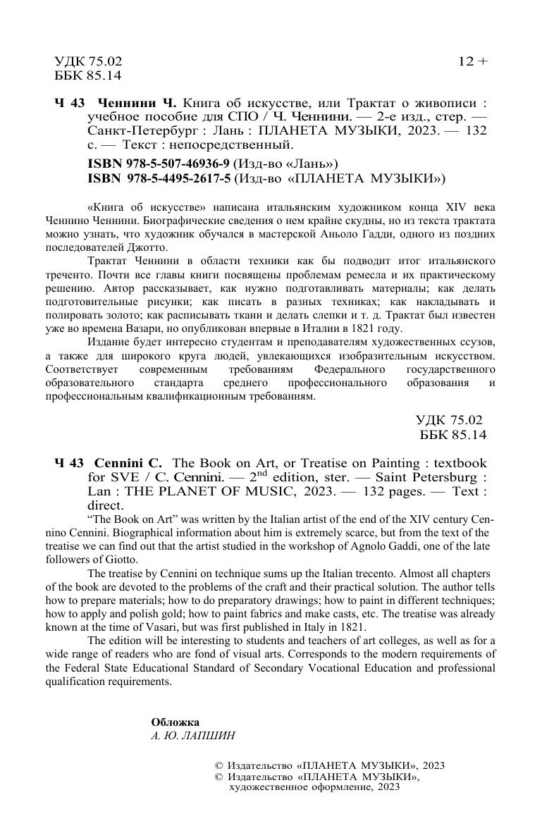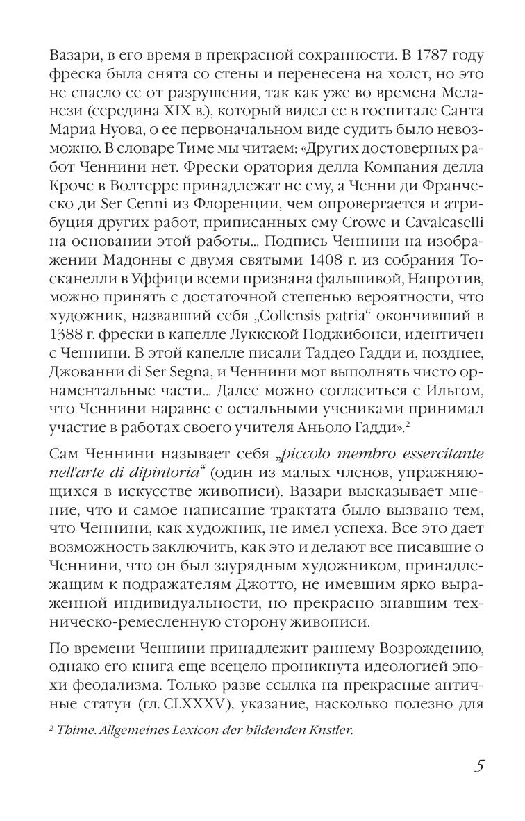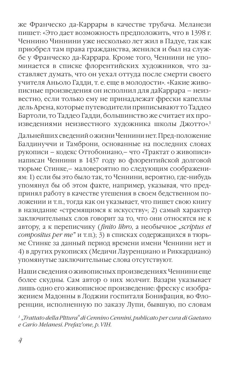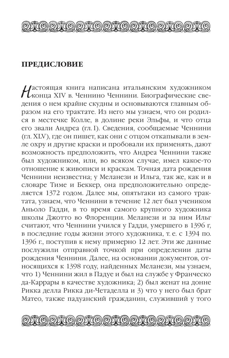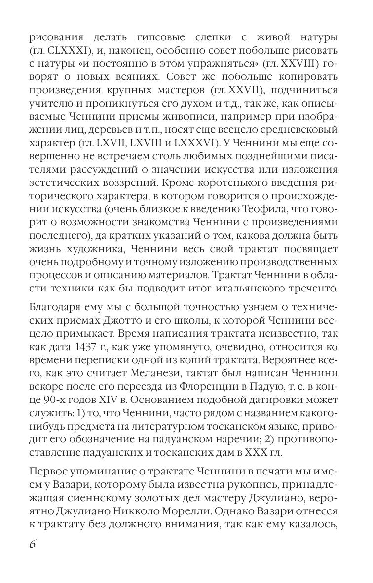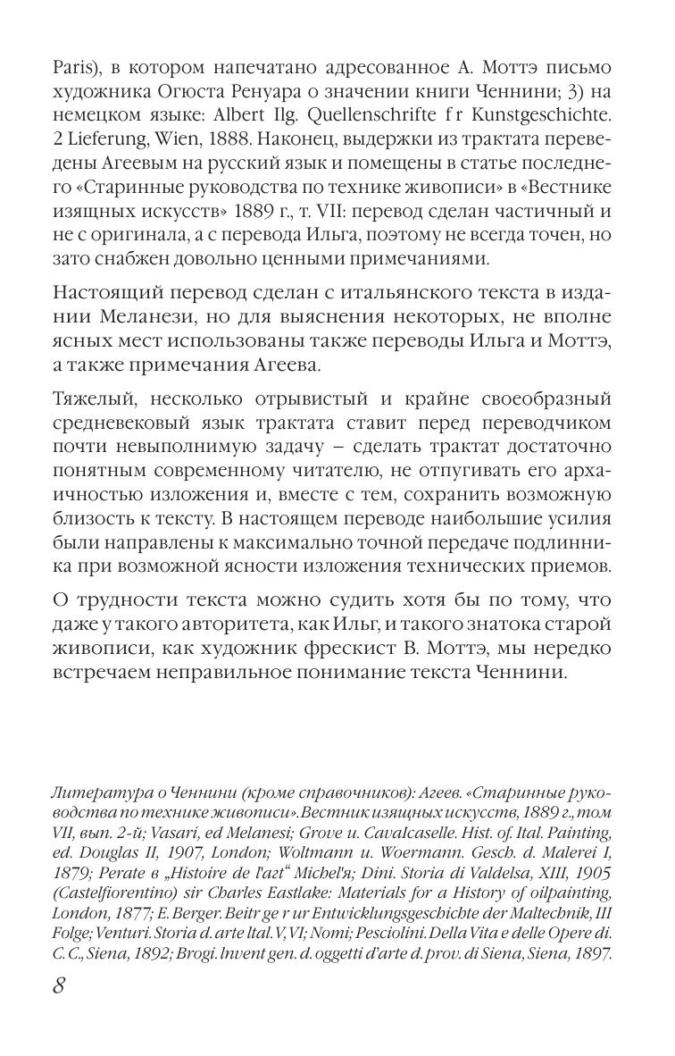 Книга об искусстве написана итальянским художником конца XIV века Ченнино Ченнини. Биографические сведения о нём крайне скудны, но из текста трактата можно узнать, что художник обучался в мастерской Аньоло Гадди, одного из поздних последователей Джотто. Трактат Ченнини в области техники как бы подводит итог итальянского треченто. Почти все главы книги посвящены проблемам ремесла и их практическому решению. Автор рассказывает, как нужно подготавливать материалы, как делать подготовительные рисунки, как писать в разных техниках, как накладывать и полировать золото, как расписывать ткани и делать слепки и т. д. Трактат был известен уже во времена Вазари, но опубликован впервые в Италии в 1821 году. Издание будет интересно студентам и преподавателям художественных ссузов, а также для широкого круга людей, увлекающихся изобразительным искусством. "The Book on Art" was written by the Italian artist of the end of the XIV century Cennino Cennini. Biographical information about him is extremely scarce, but from the text of the treatise we can find out that the artist studied in the workshop of Agnolo Gaddi, one of the late followers of Giotto. The treatise by Cennini on technique sums up the Italian trecento. Almost all chapters of the book are devoted to the problems of the craft and their practical solution. The author tells how to prepare materials, how to do preparatory drawings, how to paint in different techniques, how to apply and polish gold, how to paint fabrics and make casts, etc. The treatise was already known at the time of Vasari, but was first published in Italy in 1821. The edition will be interesting to students and teachers of art colleges, as well as for a wide range of readers who are fond of visual arts.