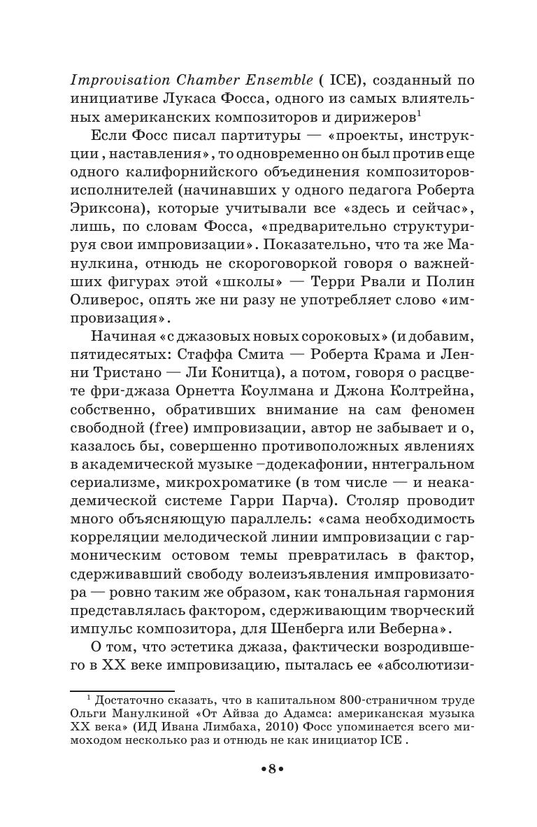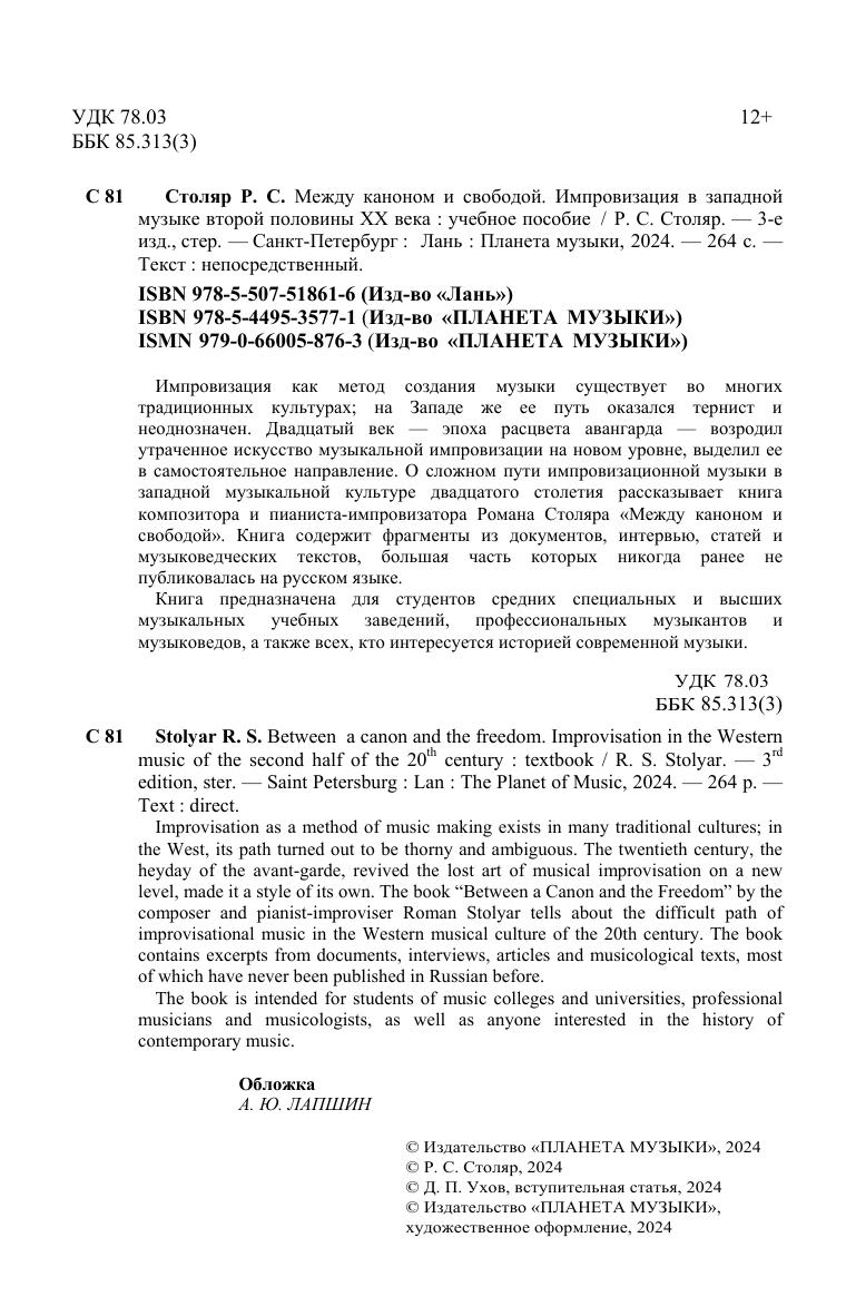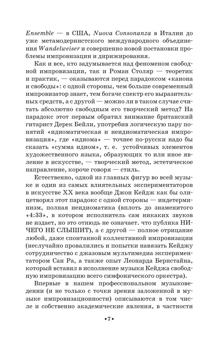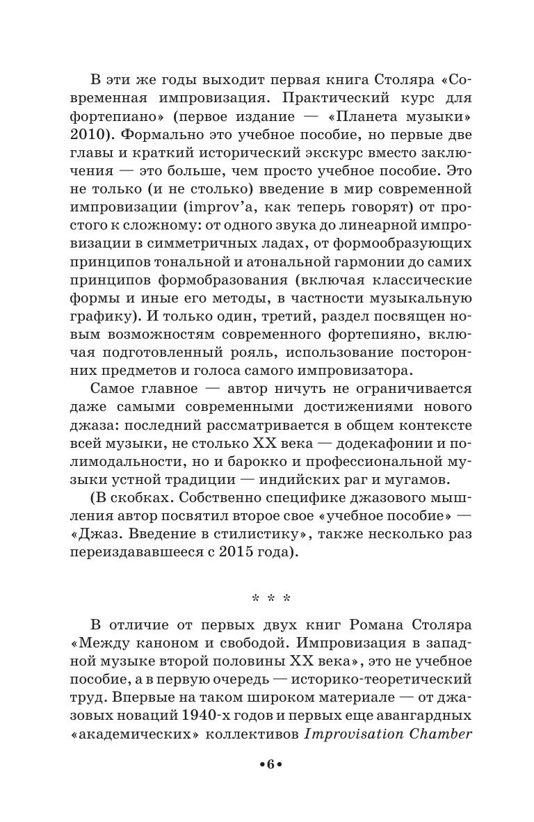 Импровизация как метод создания музыки существует во многих традиционных культурах, на Западе же ее путь оказался тернист и неоднозначен. Двадцатый век — эпоха расцвета авангарда — возродил утраченное искусство музыкальной импровизации на новом уровне, выделил ее в самостоятельное направление. О сложном пути импровизационной музыки в западной музыкальной культуре двадцатого столетия рассказывает книга композитора и пианиста-импровизатора Романа Столяра «Между каноном и свободой». Книга содержит фрагменты из документов, интервью, статей и музыковедческих текстов, большая часть которых никогда ранее не публиковалась на русском языке. Книга предназначена для студентов средних специальных и высших музыкальных учебных заведений, профессиональных музыкантов и музыковедов, а также всех, кто интересуется историей современной музыки.
