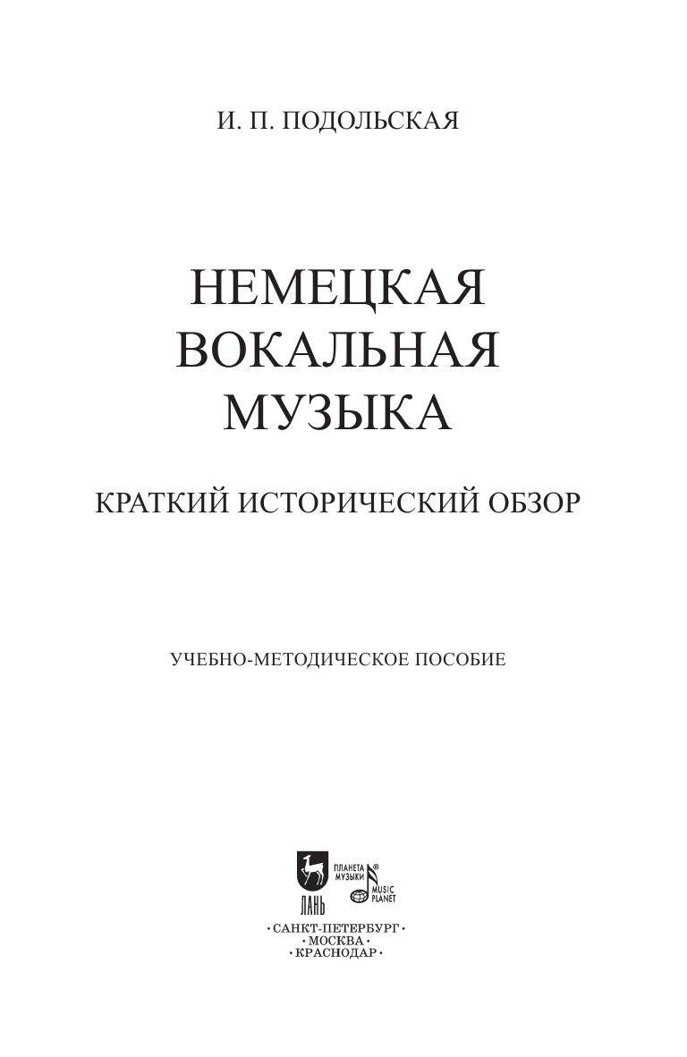 Учебно-методическое пособие охватывает большой период развития немецкой камерной вокальной музыки вплоть до XX века. Он включает в себя анализ жанровых, национальных особенностей немецкой песни, ее истоки, пути формирования и развития, а также характерные черты национальной немецкой школы пения. Учебно-методическое пособие многогранно — по охвату фактического материала, детальной разработке стилевых особенностей каждого композитора, а также с точки зрения постановки концертмейстерских задач и может быть рекомендовано учащимся различных уровней. The methodical textbook covers a large period of German chamber vocal music history until the 20th century. It includes the analysis of the genre and national characteristics of German song (Lied), its origins, ways of formation and development, as well as the characteristic features of the national German singing school. The methodical textbook is versatile due to its coverage of factual content, thorough study of the stylistic features of each composer, as well as from the point of view of a accompanist’s work, it may be recommended to students of a different level.