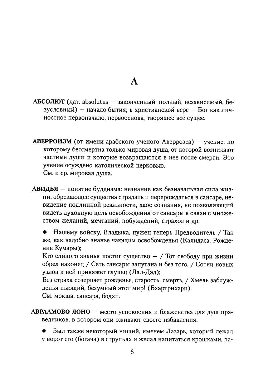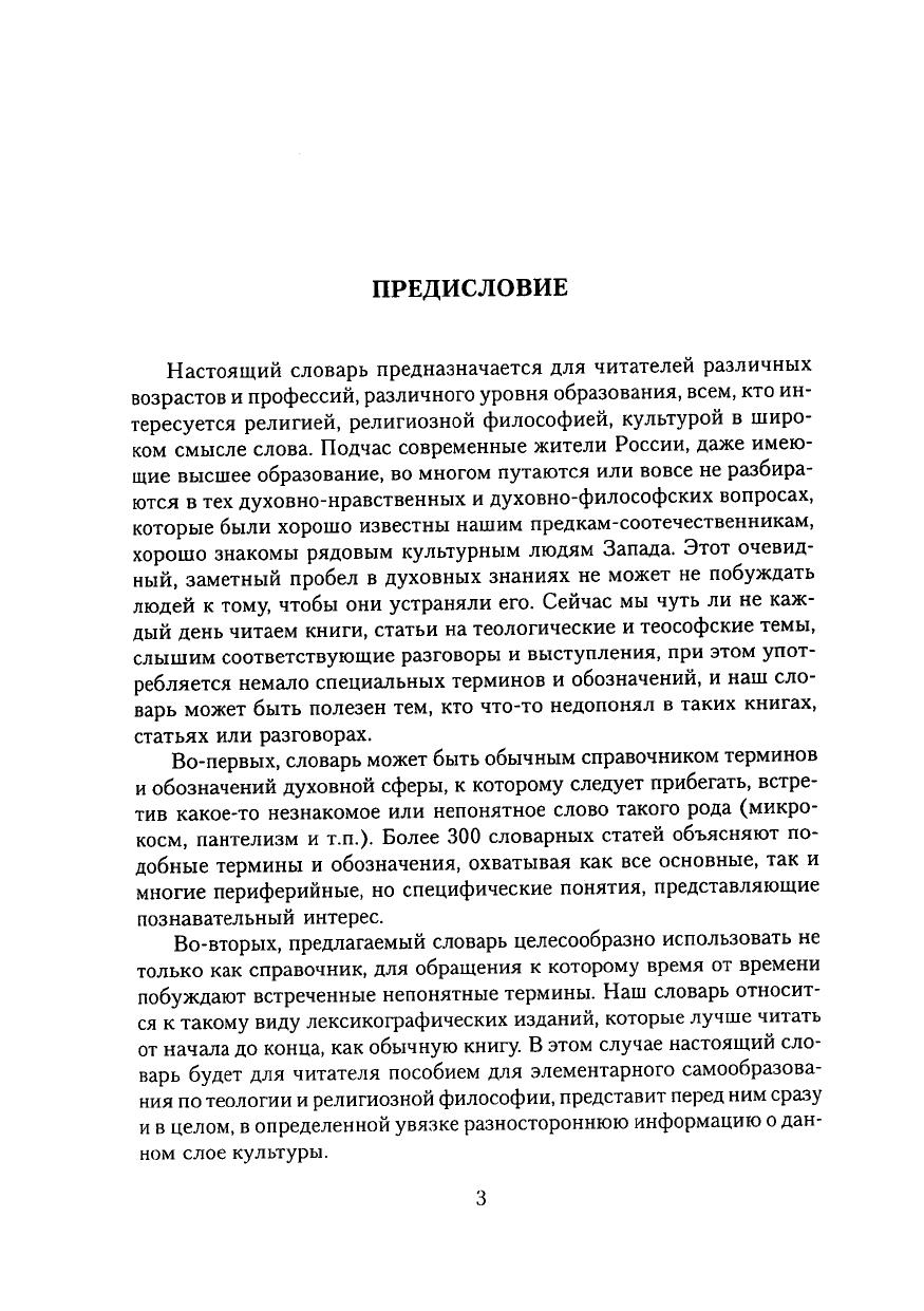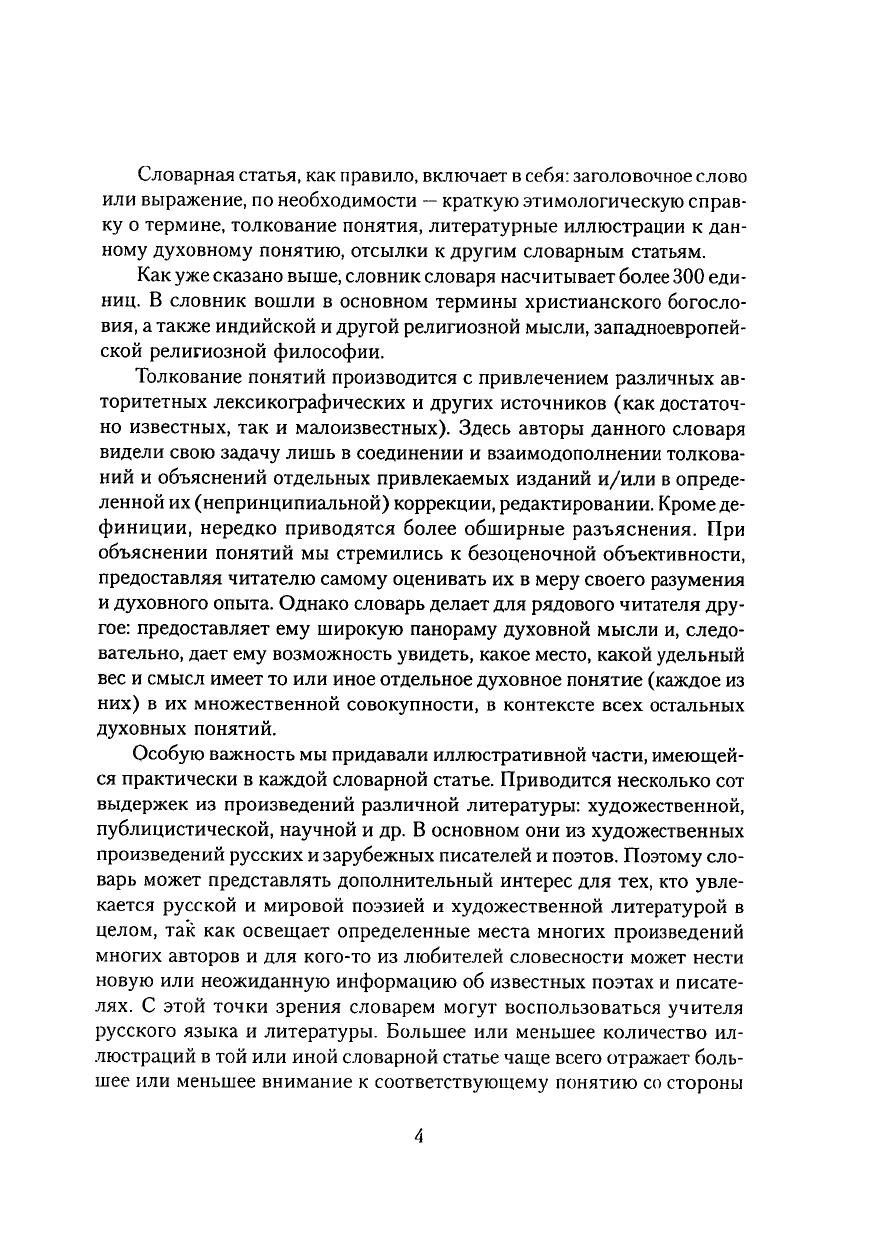 В словаре содержится более 300 словарных статей, освещающих термины и понятия, относящиеся к духовной сфере человеческого сознания: христианского богословия, индийской, древнеегипетской, буддистской и другой религиозной мысли, западноевропейской религиозной философии. Приводятся соответствующие многочисленные иллюстрации из произведений художественной, религиозной, философской и другой литературы.