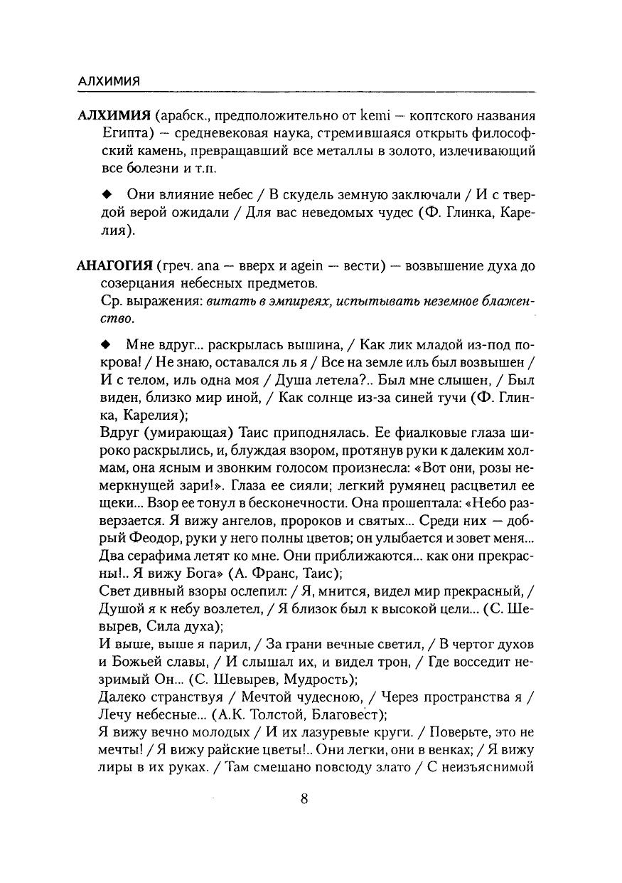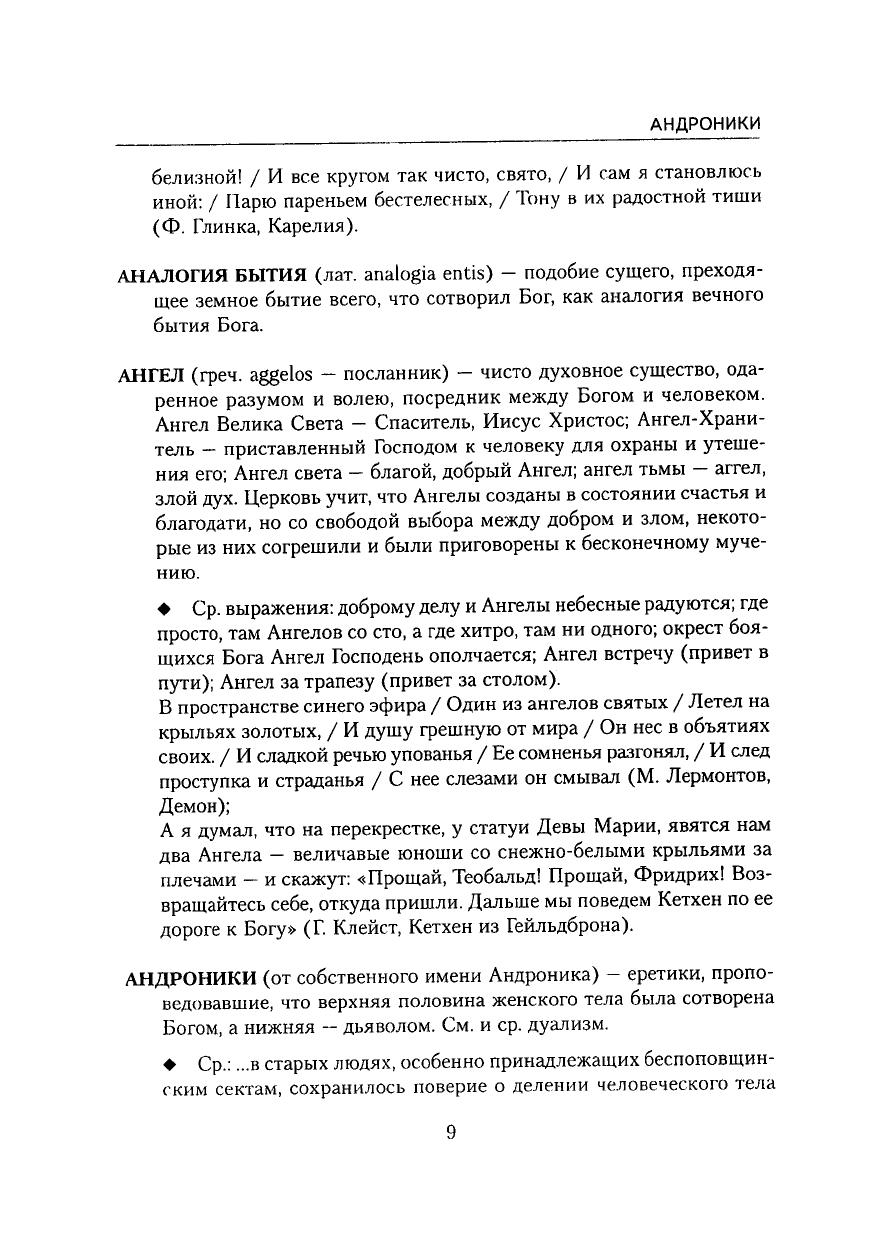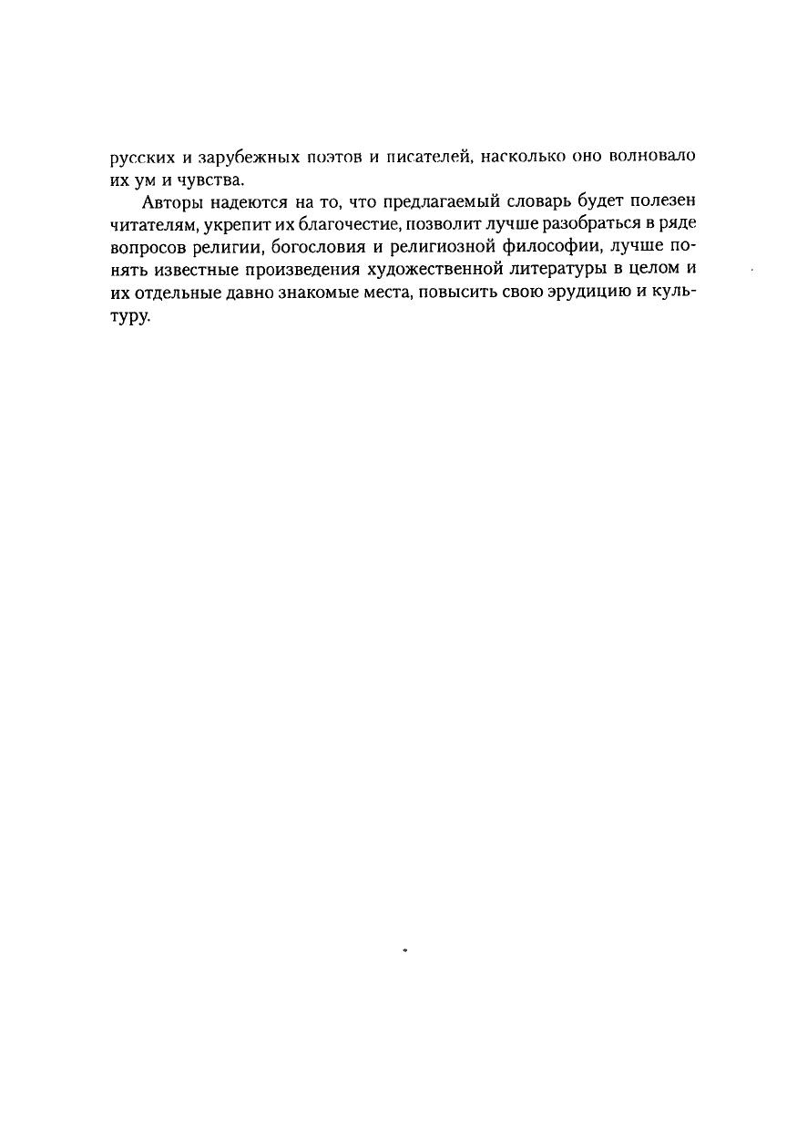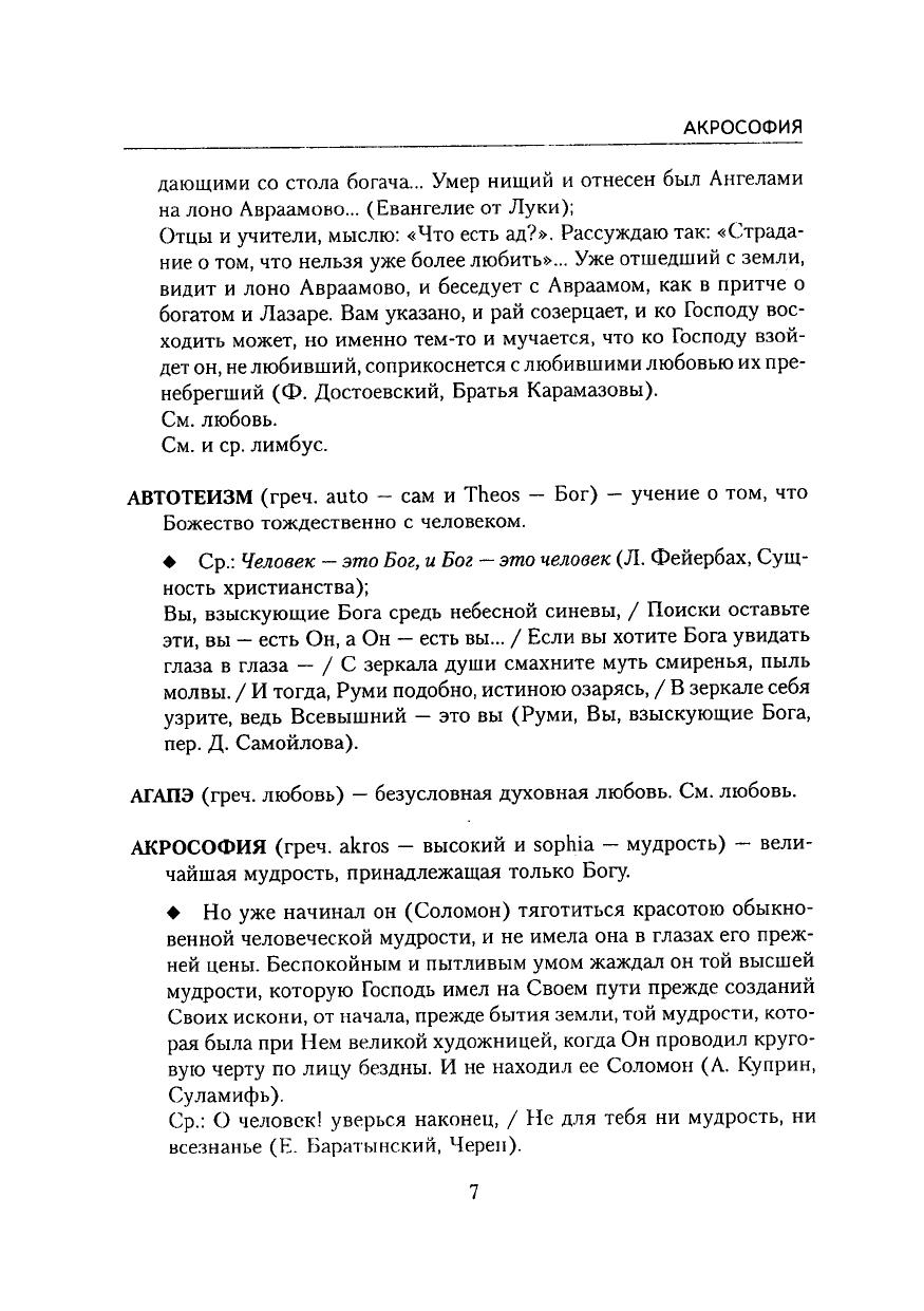 В словаре содержится более 300 словарных статей, освещающих термины и понятия, относящиеся к духовной сфере человеческого сознания: христианского богословия, индийской, древнеегипетской, буддистской и другой религиозной мысли, западноевропейской религиозной философии. Приводятся соответствующие многочисленные иллюстрации из произведений художественной, религиозной, философской и другой литературы.