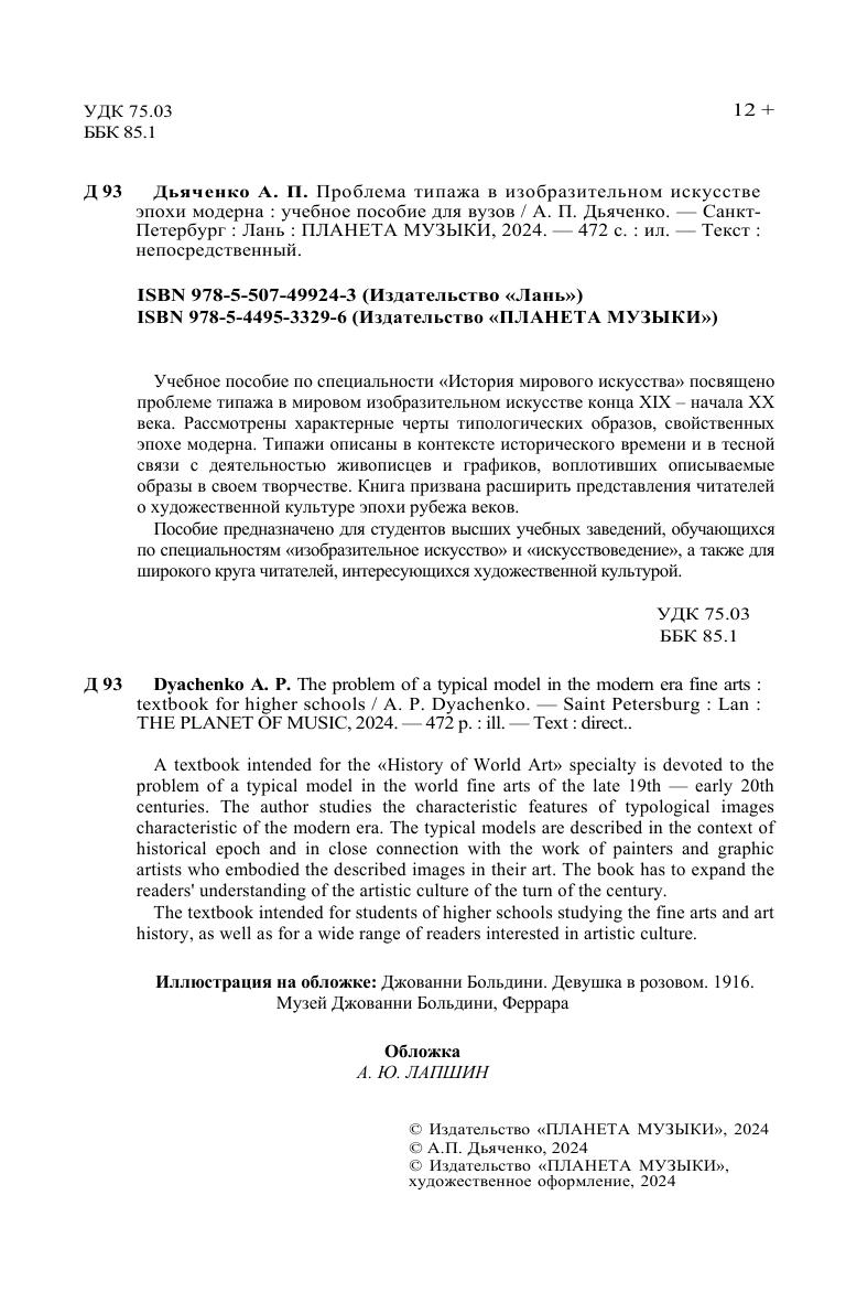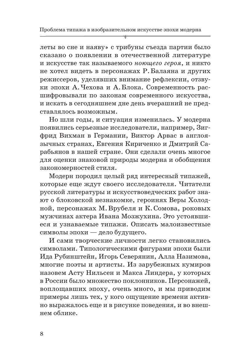 Учебное пособие по специальности “История мирового искусства” посвящено проблеме типажа в мировом изобразительном искусстве конца XIX – начала XX века. Рассмотрены характерные черты типологических образов, свойственных эпохе модерна. Типажи описаны в контексте исторического времени и в тесной связи с деятельностью живописцев и графиков, воплотивших описываемые образы в своем творчестве. Книга призвана расширить представления читателей о художественной культуре эпохи рубежа веков. Пособие предназначено для студентов высших учебных заведений, обучающихся по специальностям «изобразительное искусство» и «искусствоведение», а также для широкого круга читателей, интересующихся художественной культурой. A textbook intended for the «History of World Art» specialty is devoted to the problem of a typical model in the world fine arts of the late 19th — early 20th centuries. The author studies the characteristic features of typological images characteristic of the modern era. The typical models are described in the context of historical epoch and in close connection with the work of painters and graphic artists who embodied the described images in their art. The book has to expand the readers' understanding of the artistic culture of the turn of the century. The textbook intended for students of higher schools studying the fine arts and art history, as well as for a wide range of readers interested in artistic culture.