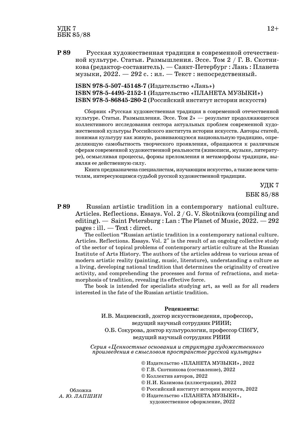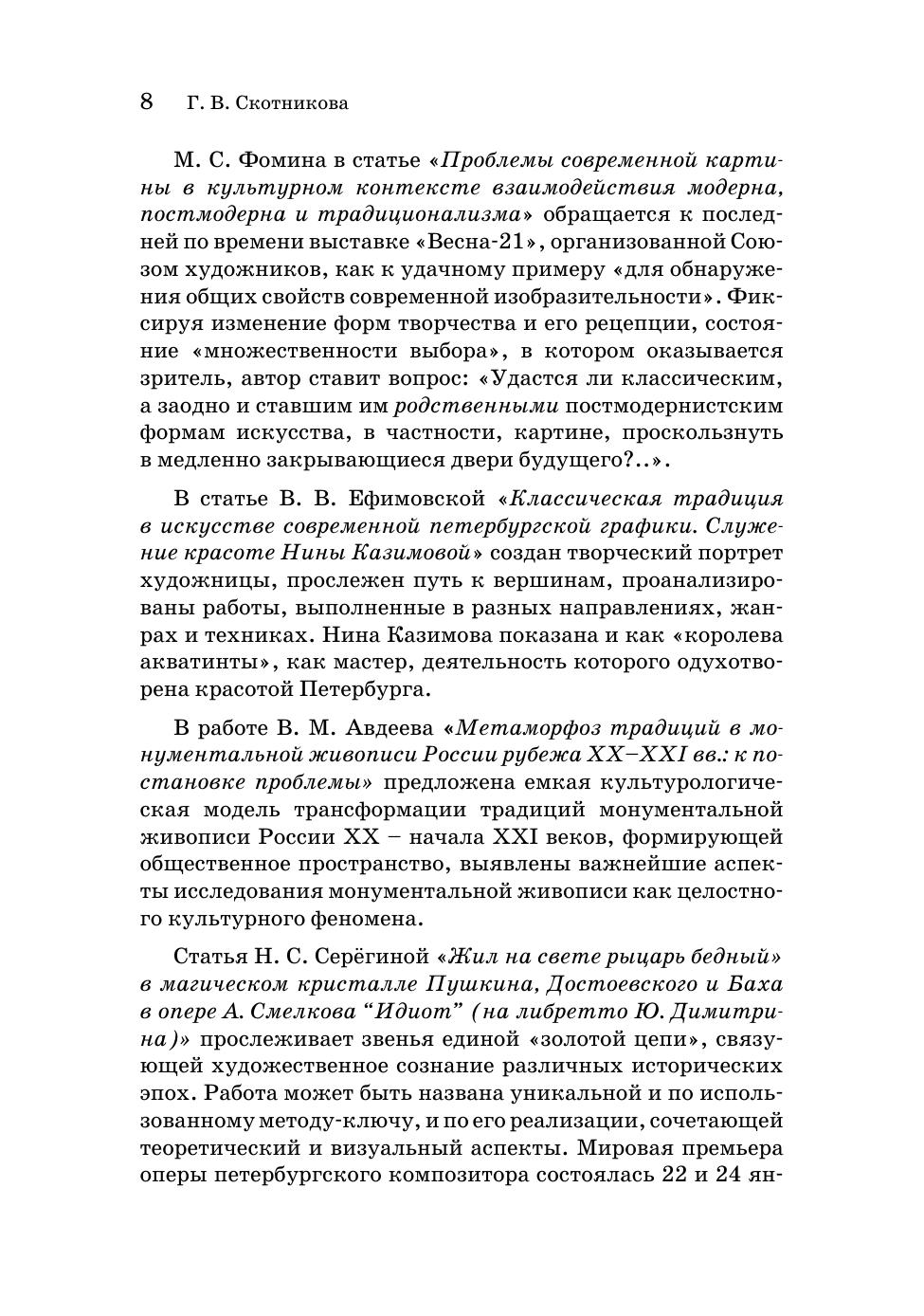 Сборник «Русская художественная традиция в современной отечественной культуре. Статьи. Размышления. Эссе» – результат продолжающегося коллективного исследования сектора актуальных проблем современной художественной культуры Российского института истории искусств. Авторы статей, понимая культуру как живую, развивающуюся национальную традицию, определяющую самобытность творческого проявления, обращаются к различным сферам современной художественной реальности (живописи, музыке, литературе), осмысливая процессы и формы преломления, метаморфозы традиции, выявляя ее действенную силу. Книга предназначена специалистам, изучающим искусство, а также всем читателям, интересующимся судьбой русской художественной традиции.