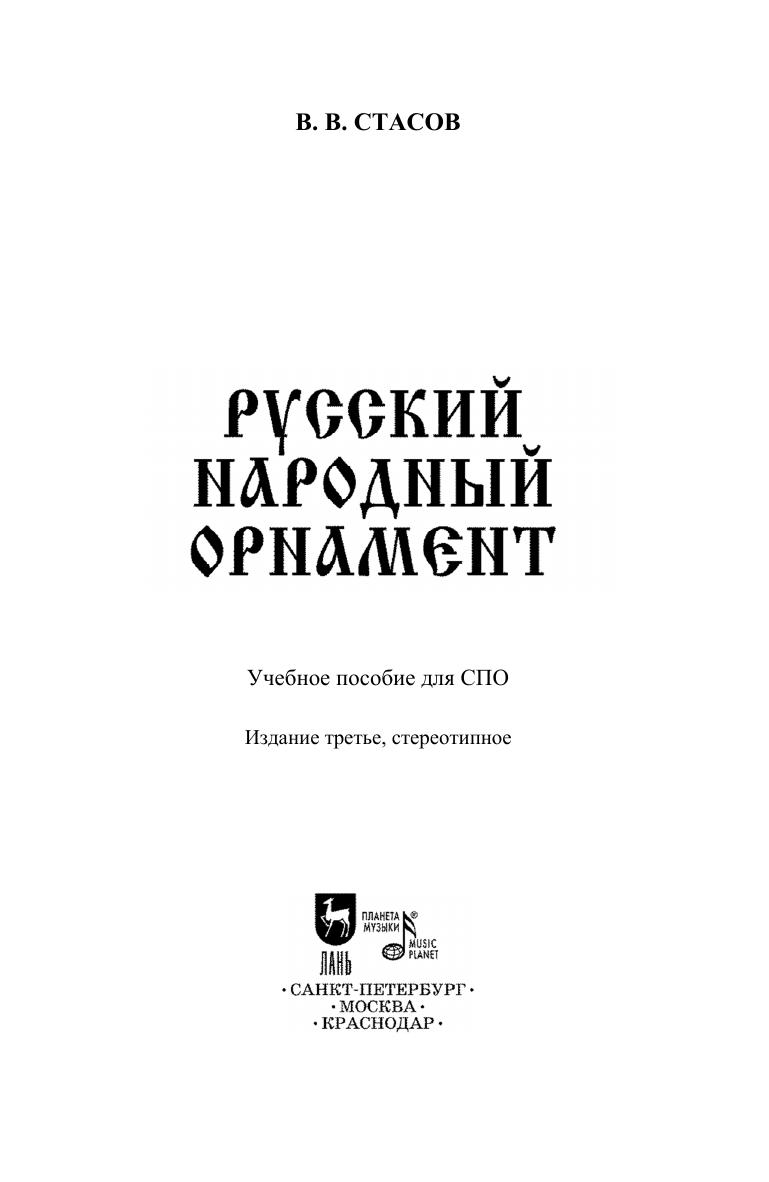 Владимир Васильевич Стасов (1824 – 1906) – видный художественный и музыкальный критик, историк искусств. Его книга «Русский народный орнамент» была издана в 1872 г. в С.-Петербурге. Книга знакомит с русским народным орнаментом в шитье, ткани и кружеве. В своей работе В.В.Стасов высказал мысль о значительности и глубине русского народного искусства, одним из первых обратив на него внимание. Книга адресована преподавателям и студентам средних специальных учебных заведений, изучающим декоративно-прикладное искусство. Vladimir Vassilievich Stasov (1824 – 1906) was a prominent art and music critic, art historian. His book "Russian folk ornament" was first published in 1872 in St. Petersburg. The book presents a Russian folk ornament in embroidery, fabrics and lace. In his work Stasov suggested the significance and depth of Russian folk art, being one of the first to draw attention to it. The textbook is destined for teachers and students of art colleges.