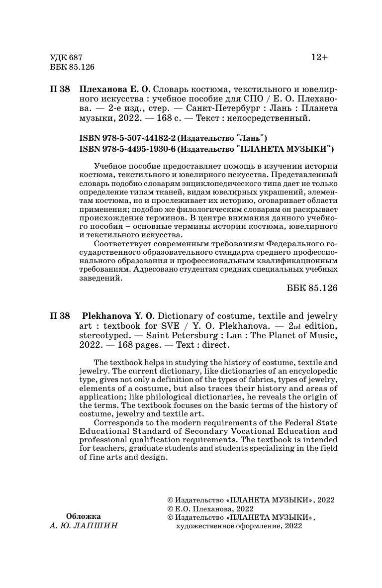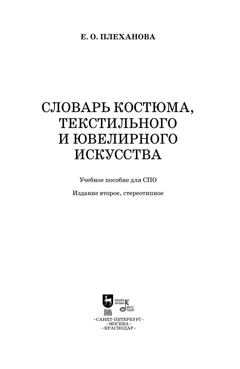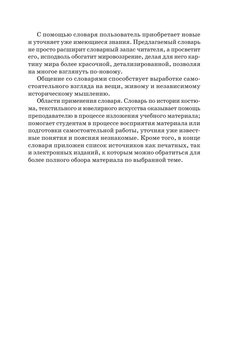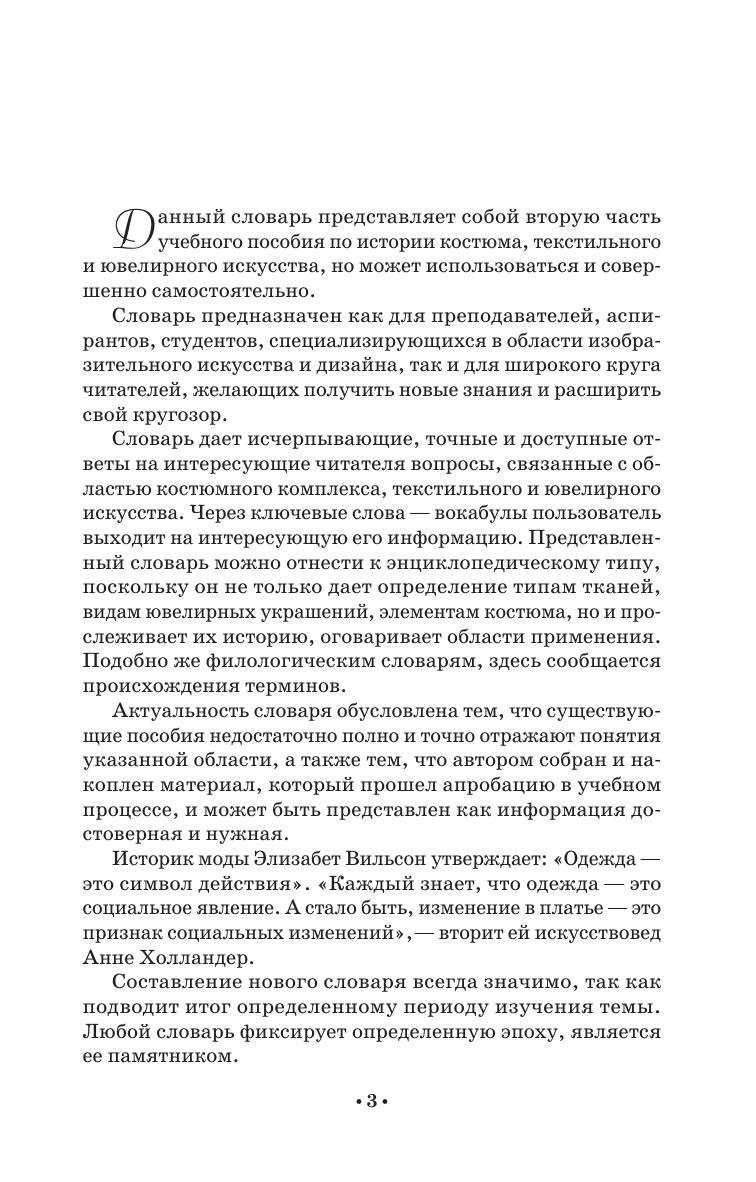 The textbook helps in studying the history of costume, textile and jewelry. The current dictionary, like dictionaries of an encyclopedic type, gives not only a definition of the types of fabrics, types of jewelry, elements of a costume, but also traces their history and areas of application; like philological dictionaries, he reveals the origin of the terms. The textbook focuses on the basic terms of the history of costume, jewelry and textile art.