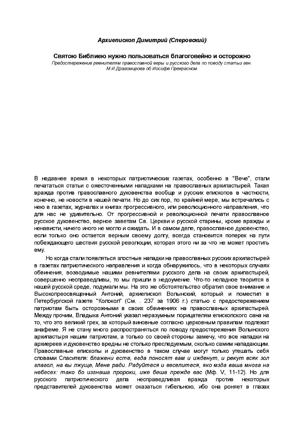 Святой Библиею нужно пользоваться благоговейно и осторожно. Предостережение ревнителям православной веры и русского дела по поводу статьи ген. М.И. Драгомирова об Иосифе Прекрасном