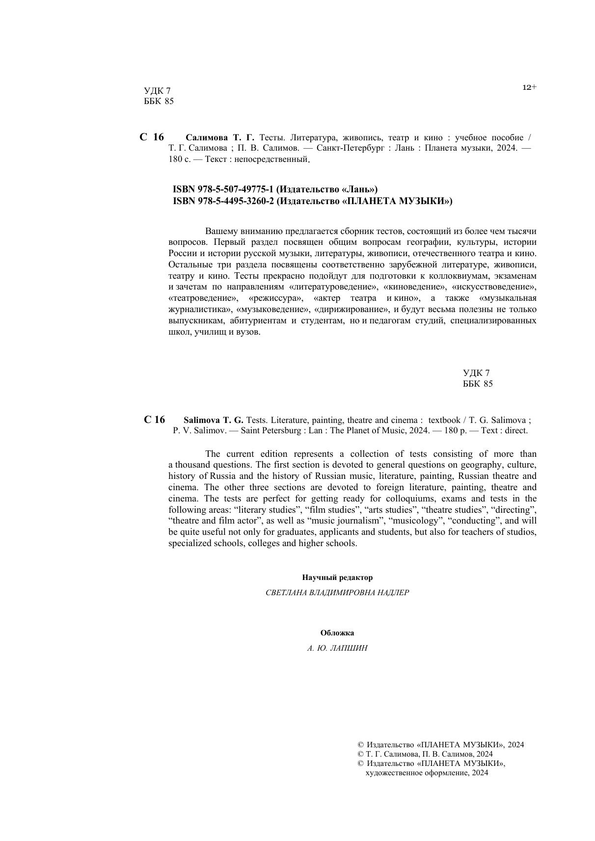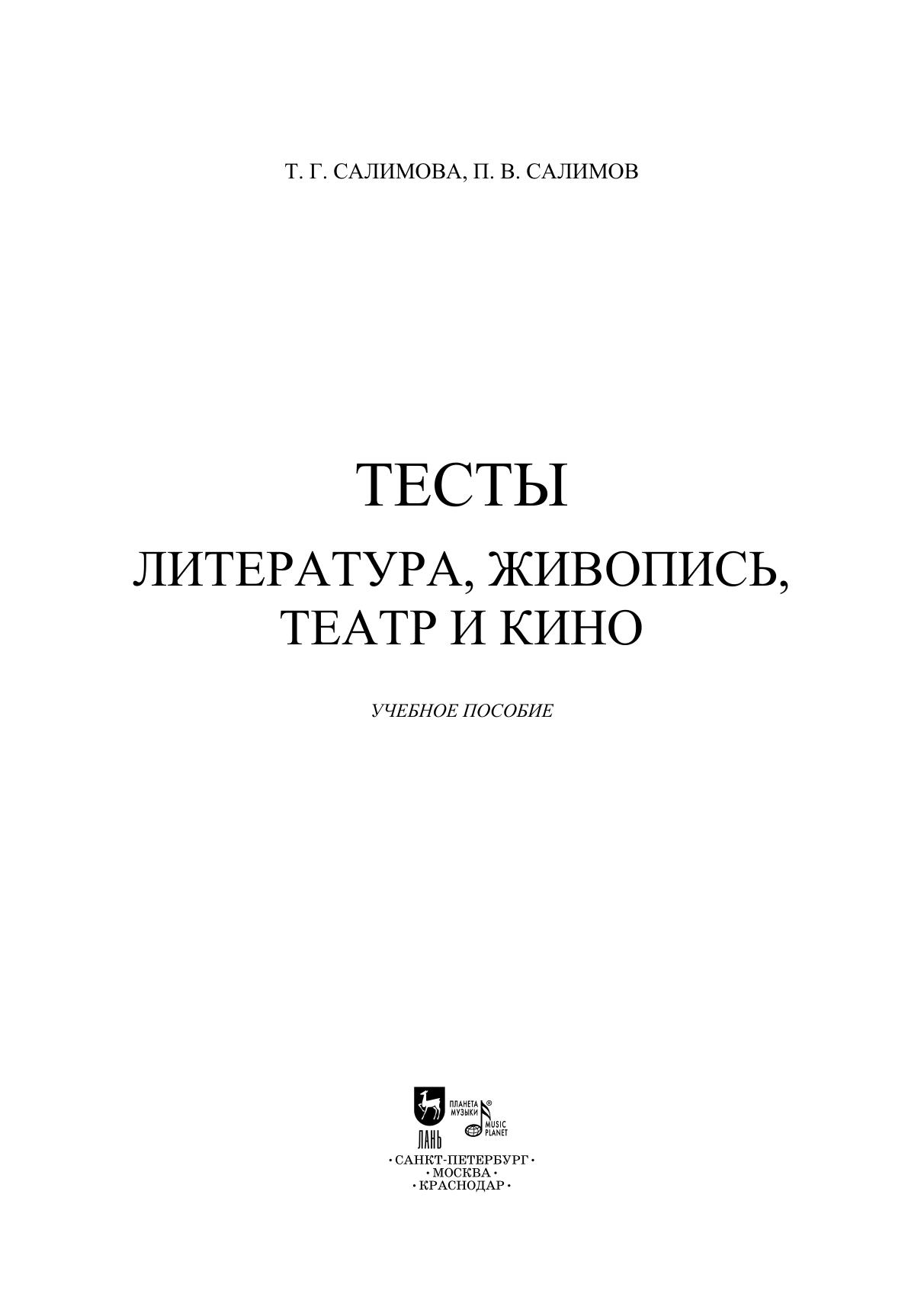 Вашему вниманию предлагается сборник тестов, состоящий из более чем тысячи вопросов. Первый раздел посвящен общим вопросам географии, культуры, истории России и истории русской музыки, литературы, живописи, отечественного театра и кино. Остальные три раздела посвящены соответственно зарубежной литературе, живописи, театру и кино. Тесты прекрасно подойдут для подготовки к коллоквиумам, экзаменам и зачетам по направлениям «литературоведение», «киноведение», «искусствоведение», «театроведение», «режиссура», «актер театра и кино», а также «музыкальная журналистика», «музыковедение», «дирижирование», и будут весьма полезны не только выпускникам, абитуриентам и студентам, но и педагогам студий, специализированных школ, училищ и вузов. The current edition represents a collection of tests consisting of more than a thousand questions. The first section is devoted to general questions on geography, culture, history of Russia and the history of Russian music, literature, painting, Russian theatre and cinema. The other three sections are devoted to foreign literature, painting, theatre and cinema. Thе tests are perfect for getting ready for colloquiums, exams and tests in the following areas: “literary studies”, “film studies”, “arts studies”, “theatre studies”, “directing”, “theatre and film actor”, as well as “music journalism”, “musicology”, “conducting”, and will be quite useful not only for graduates, applicants and students, but also for teachers of studios, specialized schools, colleges and higher schools.