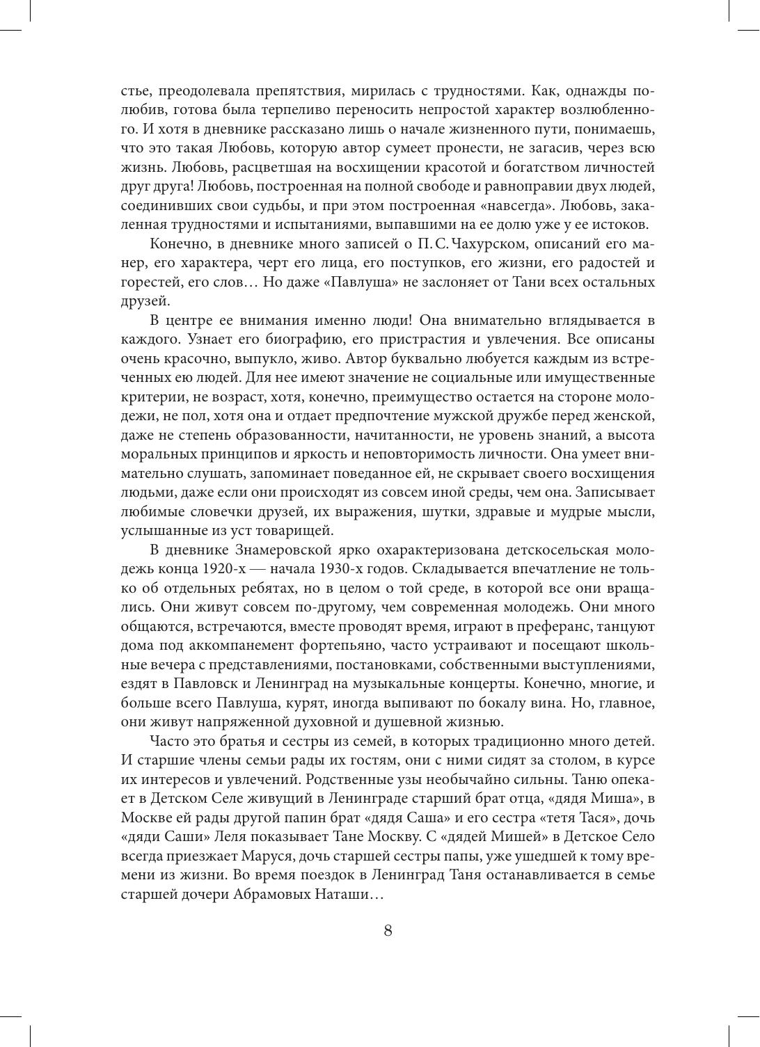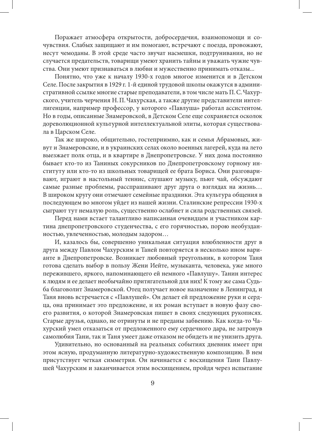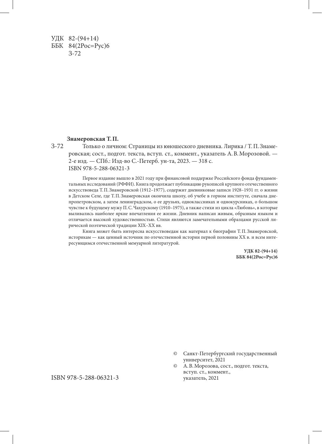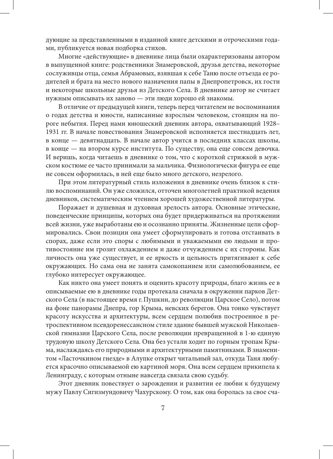 Первое издание вышло в свет в 2021 году при финансовой поддержке Российского фонда фундаментальных исследований (РФФИ). Книга продолжает публикацию рукописей крупного отечественного искусствоведа Т.П. Знамеровской (1912-1977), содержит дневниковые записи 1928-1931 гг. о жизни в Детском селе, где Т.П. Знамеровская окончила школу, об учебе в горном институте, сначала днепропетровском, а затем ленинградском, о ее друзьях, одноклассниках и однокурсниках, о большом чувстве к будущему мужу П.С. Чахурскому (1910 - 1975), а также стихи из цикла "Любовь", в которые выливались наиболее яркие впечатления ее жизни. Дневник написан живым, образным языком и отличается высокой художественностью. Стихи являются замечательными образцами русской лирической поэтической традиции XIX-XX вв. Книга может быть интересна искусствоведам как материал к биографии Т.П. Знамеровской, историкам- как ценный источник по отечественной истории первой половины XX в. и всем интересующимся отечественной мемуарной литературой.