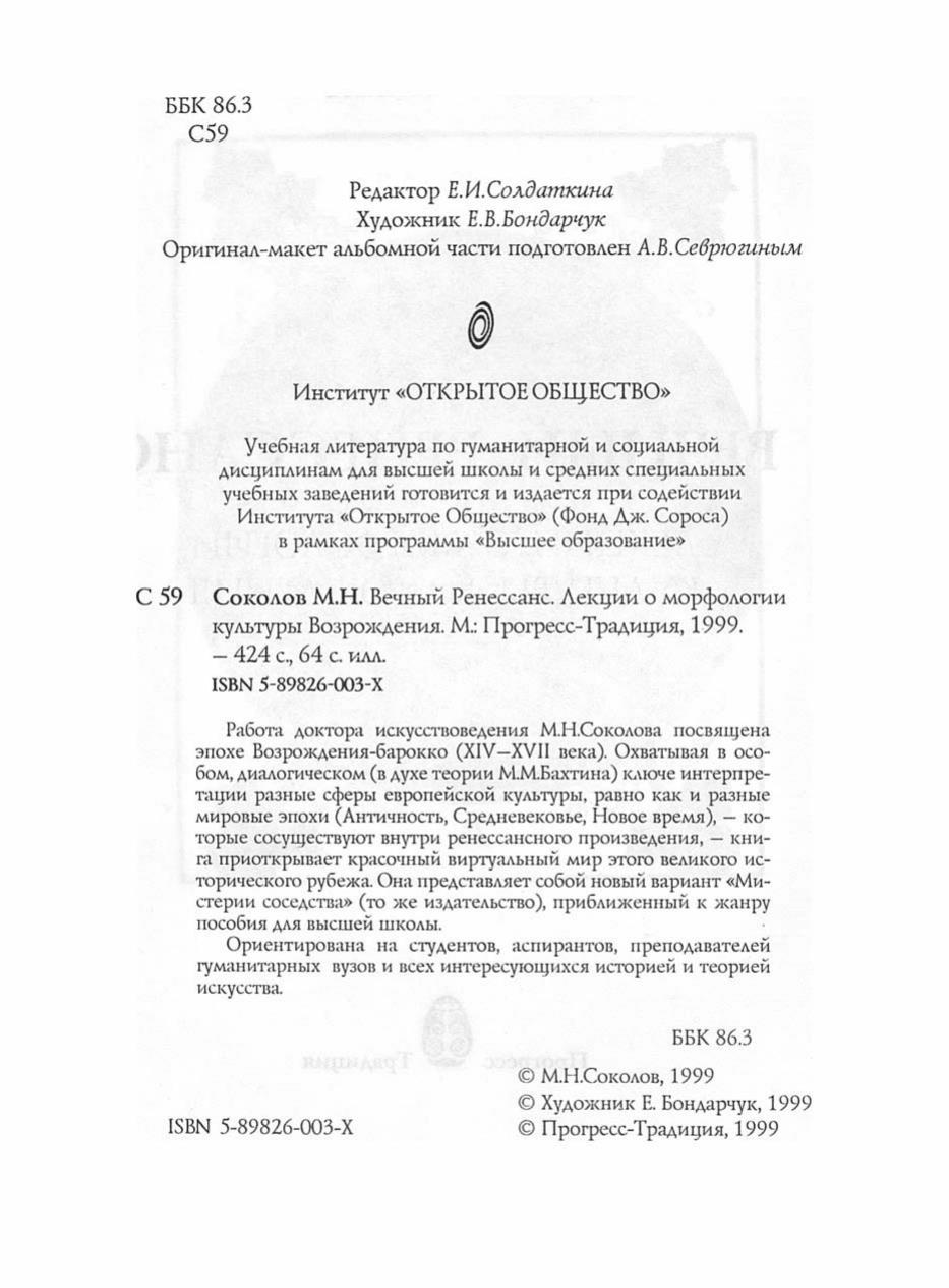 Работа доктора искусствоведения М.Н.Соколова посвящена эпохе Возрождения-барокко (XIV-XVII века). Охватывая в особом, диалогическом (в духе теории М.М.Бахтина) ключе интерпретации разные сферы европейской культуры, равно как и разные мировые эпохи (Античность, Средневековье, Новое время), - которые сосуществуют внутри ренессансного произведения, - книга приоткрывает красочный виртуальный мир этого великого исторического рубежа. Она представляет собой новый вариант "Мистерии соседства" (то же издательство), приближенный к жанру пособия для высшей школы.