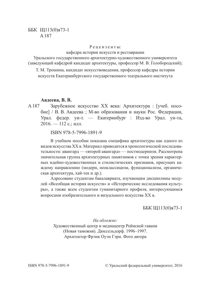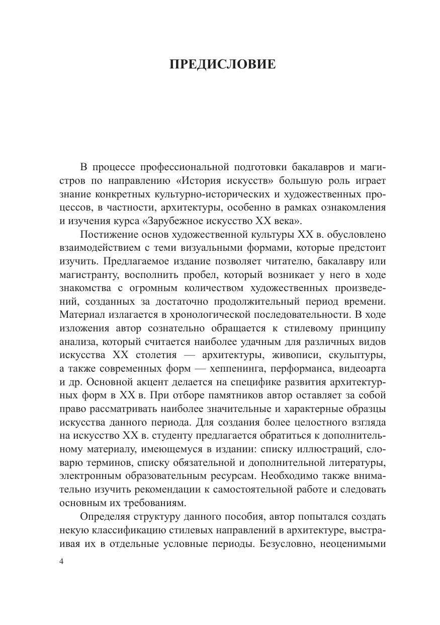 В учебном пособии показана специфика архитектуры как одного из видов искусства ХХ в. Материал приводится в хронологической последовательности: авангард — «второй авангард» — постмодернизм. Рассмотрена значительная группа архитектурных памятников с точки зрения характерных идейно-художественных и стилистических признаков, присущих каждому направлению (модерн, неоклассицизм, функционализм, органическая архитектура, хай-тек и др.). Адресовано студентам бакалавриата, изучающим дисциплины модулей «Всеобщая история искусств» и «Исторические исследования культуры», а также всем студентам гуманитарного профиля, интересующимся вопросами изобразительного и визуального искусства ХХ в.