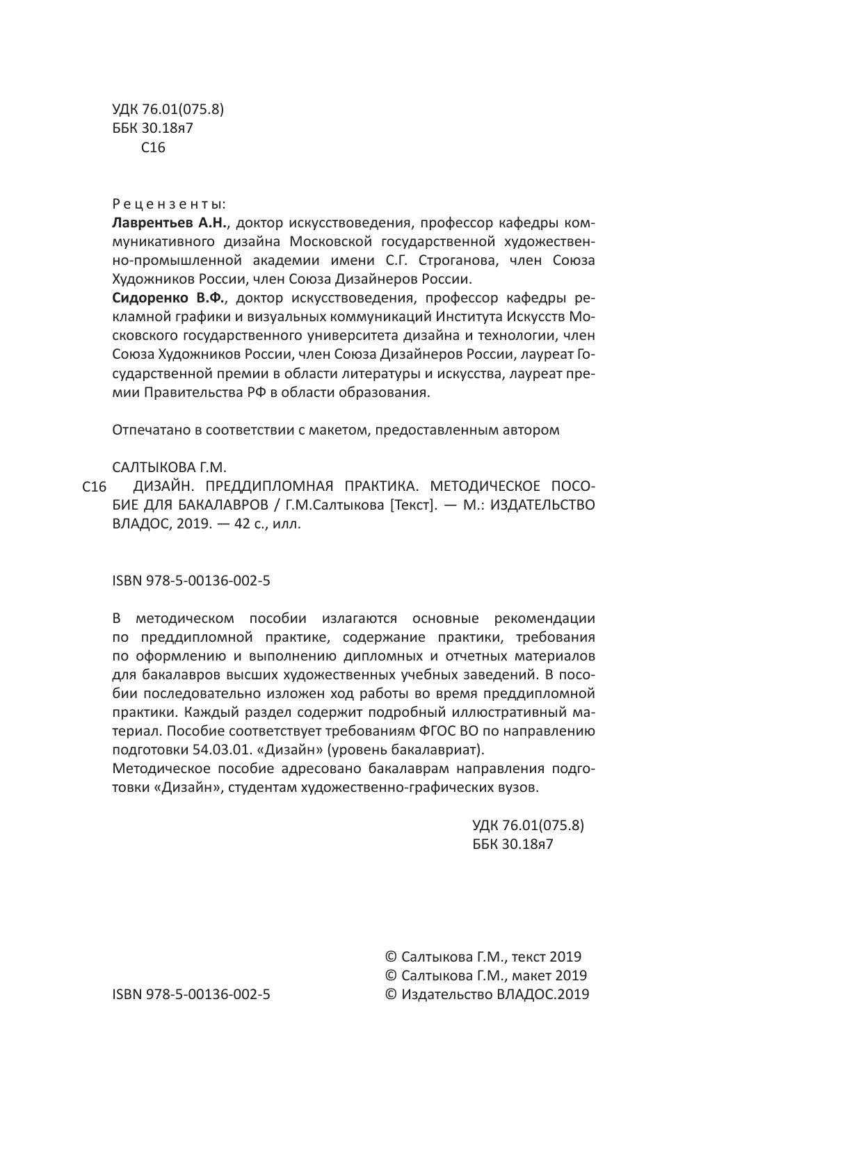 В методическом пособии излагаются основные рекомендации по преддипломной практике, содержание практики, требования по оформлению и выполнению дипломных и отчетных материалов для бакалавров высших художественных учебных заведений. В пособии последовательно изложен ход работы во время преддипломной практики. Каждый раздел содержит подробный иллюстративный материал. Пособие соответствует требованиям ФГОС ВО по направлению подготовки 54.03.01. «Дизайн» (уровень бакалавриат). Методическое пособие адресовано бакалаврам направления подготовки «Дизайн», студентам художественно графических вузов.