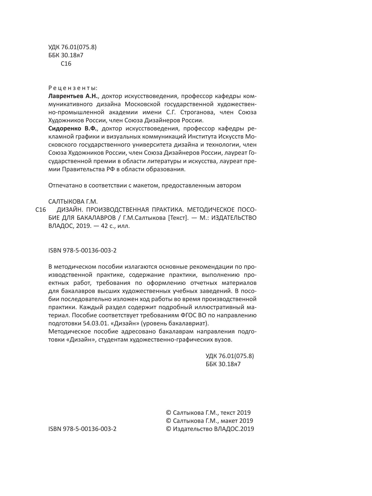 В методическом пособии излагаются основные рекомендации по производственной практике, содержание практики, выполнению проектных работ, требования по оформлению отчетных материалов для бакалавров высших художественных учебных заведений. В пособии последовательно изложен ход работы во время производственной практики. Каждый раздел содержит подробный иллюстративный материал. Пособие соответствует требованиям ФГОС ВО по направлению подготовки 54.03.01. «Дизайн» (уровень бакалавриат). Методическое пособие адресовано бакалаврам направления подготовки «Дизайн», студентам художественно-графических вузов.