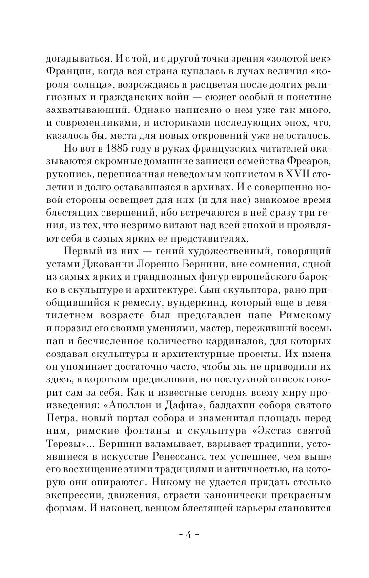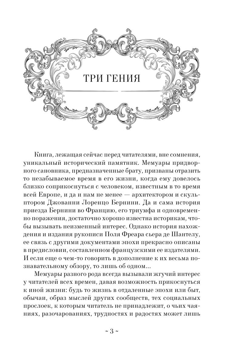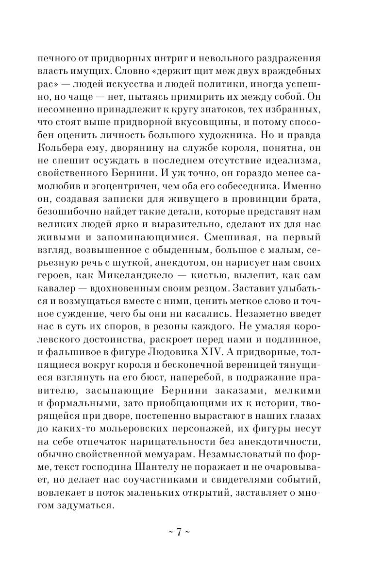 «Дневник путешествия кавалера Бернини во Францию» — уникальный исторический памятник. В мемуарах придворного сановника Поля Фреара де Шантелу (1609–1694) отражено время, когда автору довелось близко соприкоснуться с архитектором и скульптором Джованни Лоренцо Бернини, известным в то время всей Европе. С новой стороны освещается эпоха Людовика XIV — время блестящих свершений, ибо встречаются в ней сразу три гения. Первый — художественный гений самого Бернини. Второй — политический гений Жан-Батиста Кольбера (1619–1683), всесильного министра, стремившегося поднять Францию из разрухи, в которую бросили ее войны. Третий — «человеческий» гений самого Шантелу, наблюдательность и познания в искусствах которого равны его душевной зоркости, сочетающейся с незаурядным литературным даром. Мемуары будут интересны искусствоведам и студентам, изучающим изобразительное искусство и историю искусств, а также всем интересующимся архитектурой, скульптурой и искусством.