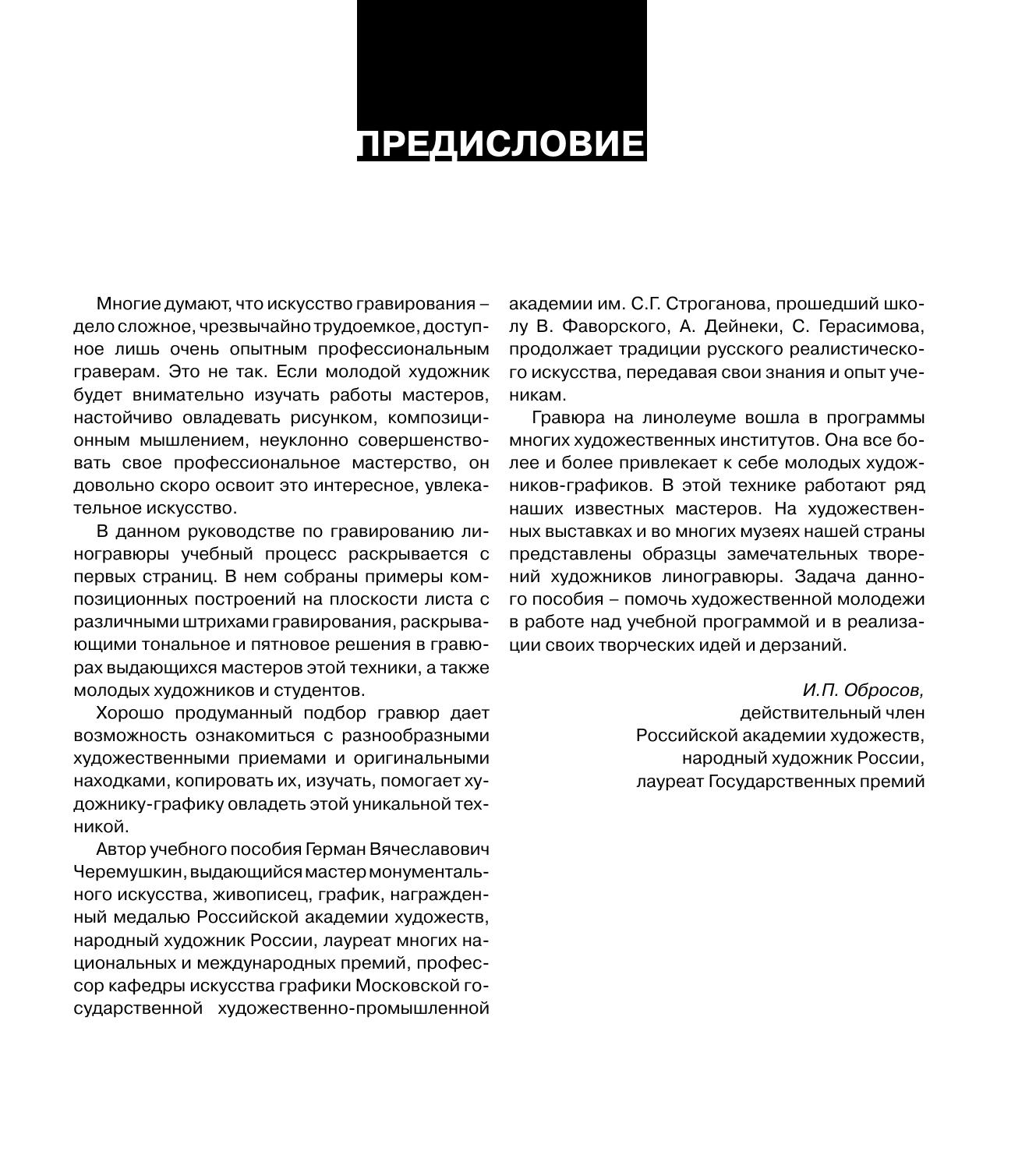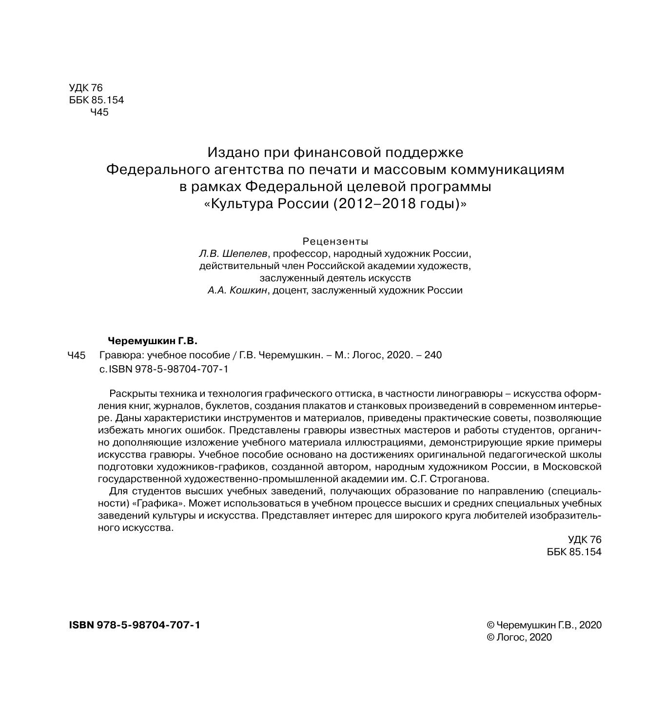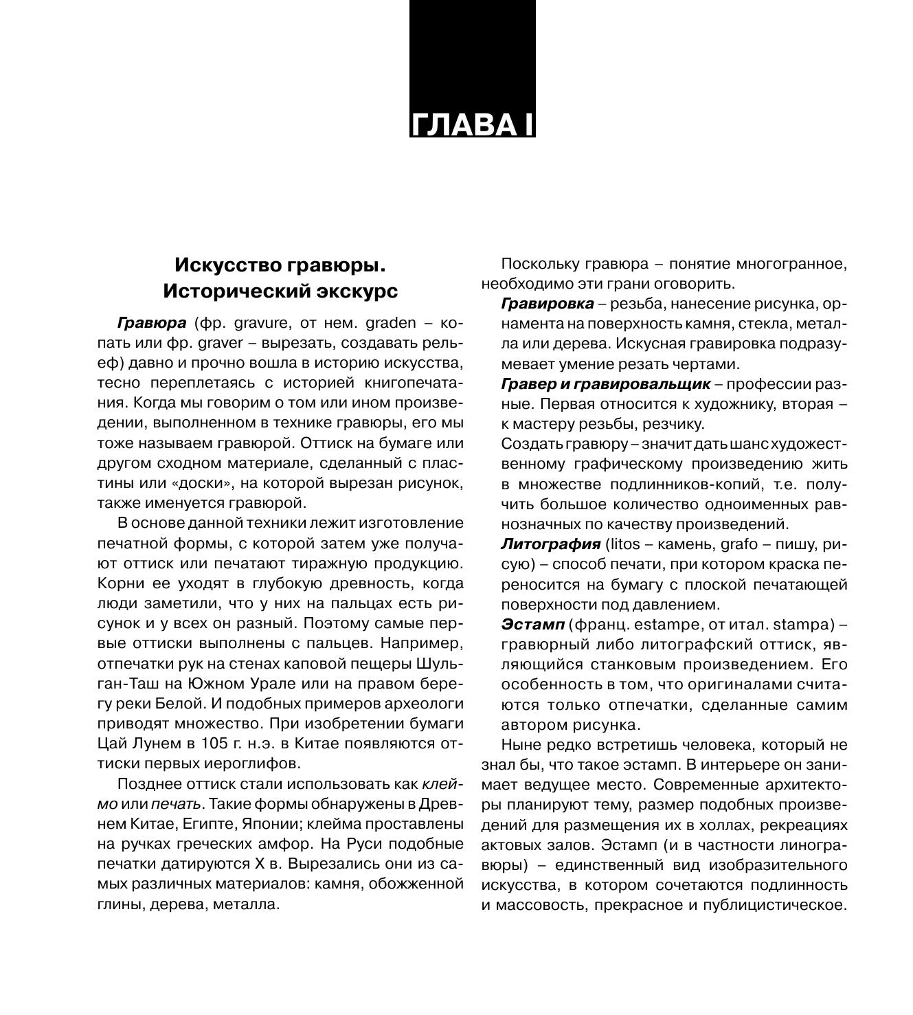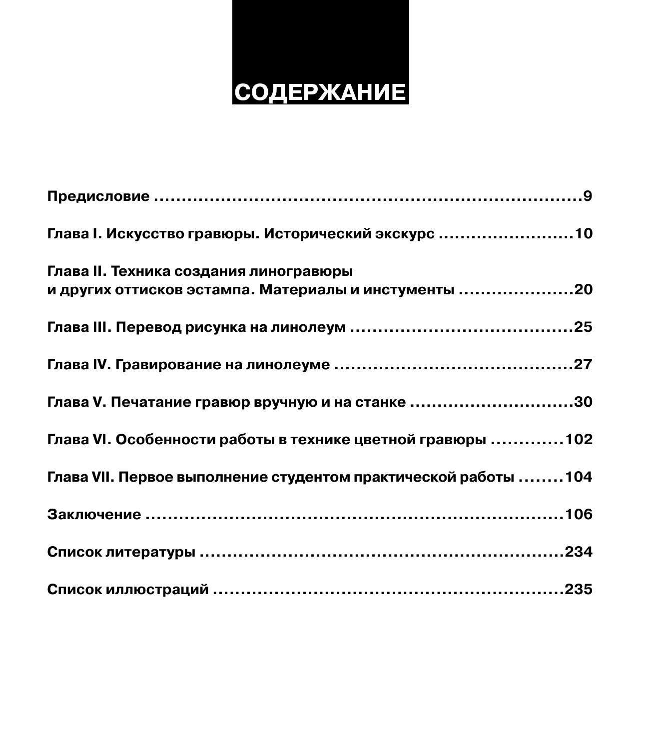 Раскрыты техника и технология графического оттиска, в частности линогравюры – искусства оформления книг, журналов, буклетов, создания плакатов и станковых произведений в современном интерьере. Даны характеристики инструментов и материалов, приведены практические советы, позволяющие избежать многих ошибок. Представлены гравюры известных мастеров и работы студентов, органично дополняющие изложение учебного материала иллюстрациями, демонстрирующие яркие примеры искусства гравюры. Учебное пособие основано на достижениях оригинальной педагогической школы подготовки художников-графиков, созданной автором, народным художником России, в Московской государственной художественно-промышленной академии им. С.Г. Строганова. Для студентов высших учебных заведений, получающих образование по направлению (специальности) «Графика». Может использоваться в учебном процессе высших и средних специальных учебных заведений культуры и искусства. Представляет интерес для широкого круга любителей изобразительного искусства.