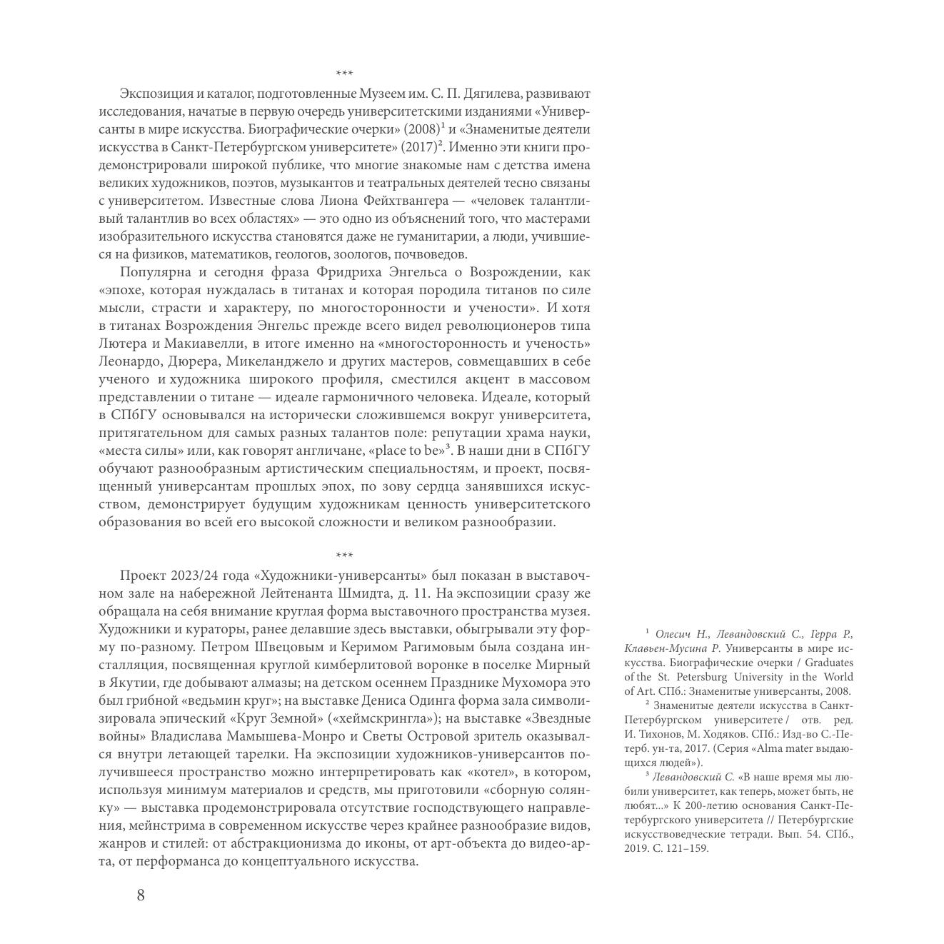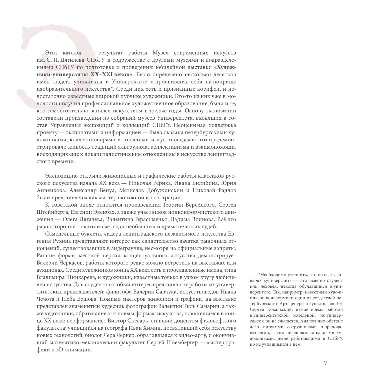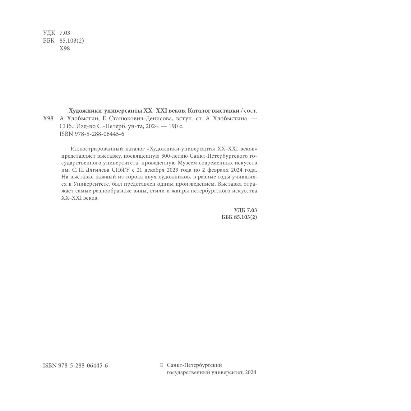 Иллюстрированный каталог "Художники-универсанты ХХ-ХХI веков" представляет выставку, посвященную 300-летию Санкт-Петербургского государственного университета, проведенную Музеем современных искусств им. С.П. Дягилева СПбГУ с 21 декабря 2023 года по 2 февраля 2024 года. На выставке каждый из сорока двух художников, в разные годы учившихся в Университете, был представлен одним произведением. Выставка отражает самые разнообразные виды, стили и жанры петербургского искусства ХХ-ХХI веков.