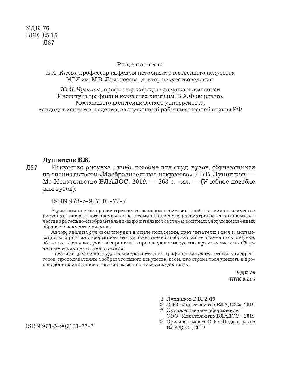 В учебном пособии рассматривается эволюция возможностей реализма в искусстве рисунка от наскального рисунка до полисемии. Полисемия рассматривается автором в качестве зрительно-изобразительно-выразительной системы восприятия художественных образов в искусстве рисунка. Автор, анализируя свои рисунки в стиле полисемии, дает читателю ключ к активизации восприятия и формирования художественного образа, запечатлённого в рисунке, обогащает сознание, учит воспринимать произведение искусства в рамках системы общечеловеческих ценностей и знаний. Пособие адресовано студентам художественно-графических факультетов университетов, преподавателям изобразительного искусства, всем, кто стремиться увидеть в произведениях живописи скрытый смысл и замысел художника.