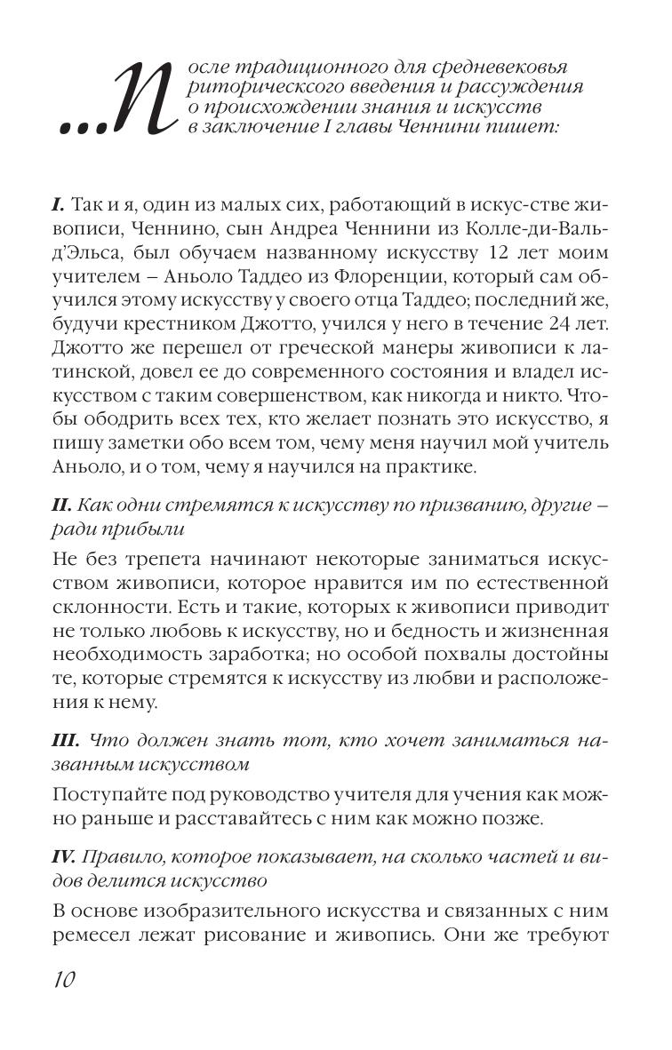 Почти все главы книги посвящены проблемам ремесла и их практическому решению. Автор рассказывает, как нужно подготавливать материалы; как делать подготовительные рисунки; как писать в разных техниках; как накладывать и полировать золото; как расписывать ткани и делать слепки и т. д.