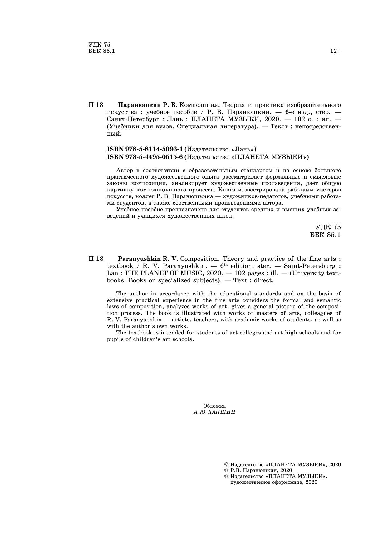 Автор в соответствии с образовательным стандартом и на основе большого практического художественного опыта рассматривает формальные и смысловые законы композиции, анализирует художественные произведения, даёт общую картинку композиционного процесса. Книга иллюстрирована работами мастеров искусств, коллег Р. В. Паранюшкина — художников-педагогов, учебными работами студентов, а также собственными произведениями автора.Учебное пособие предназначено для студентов средних и высших учебных заведений и учащихся художественных школ.