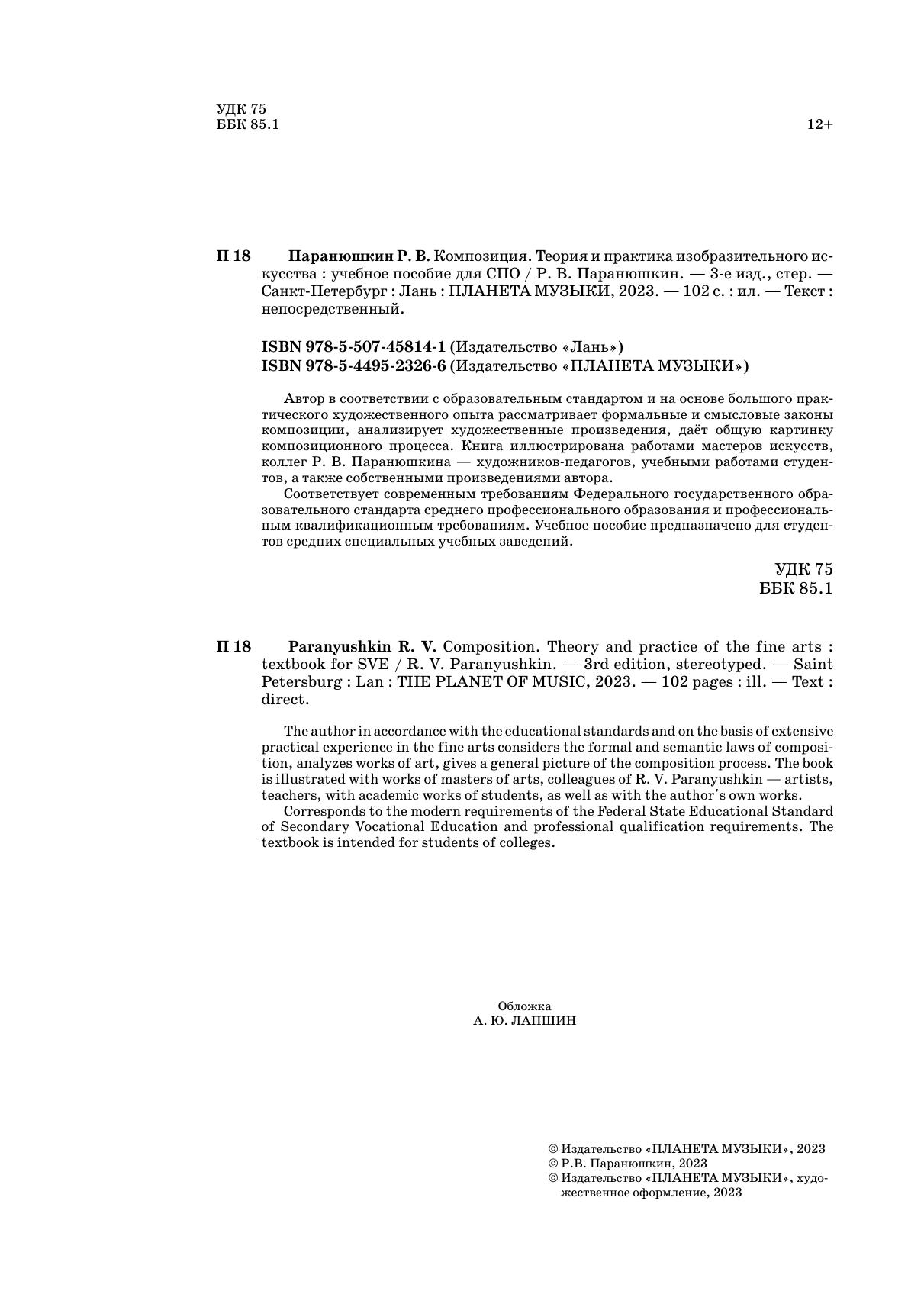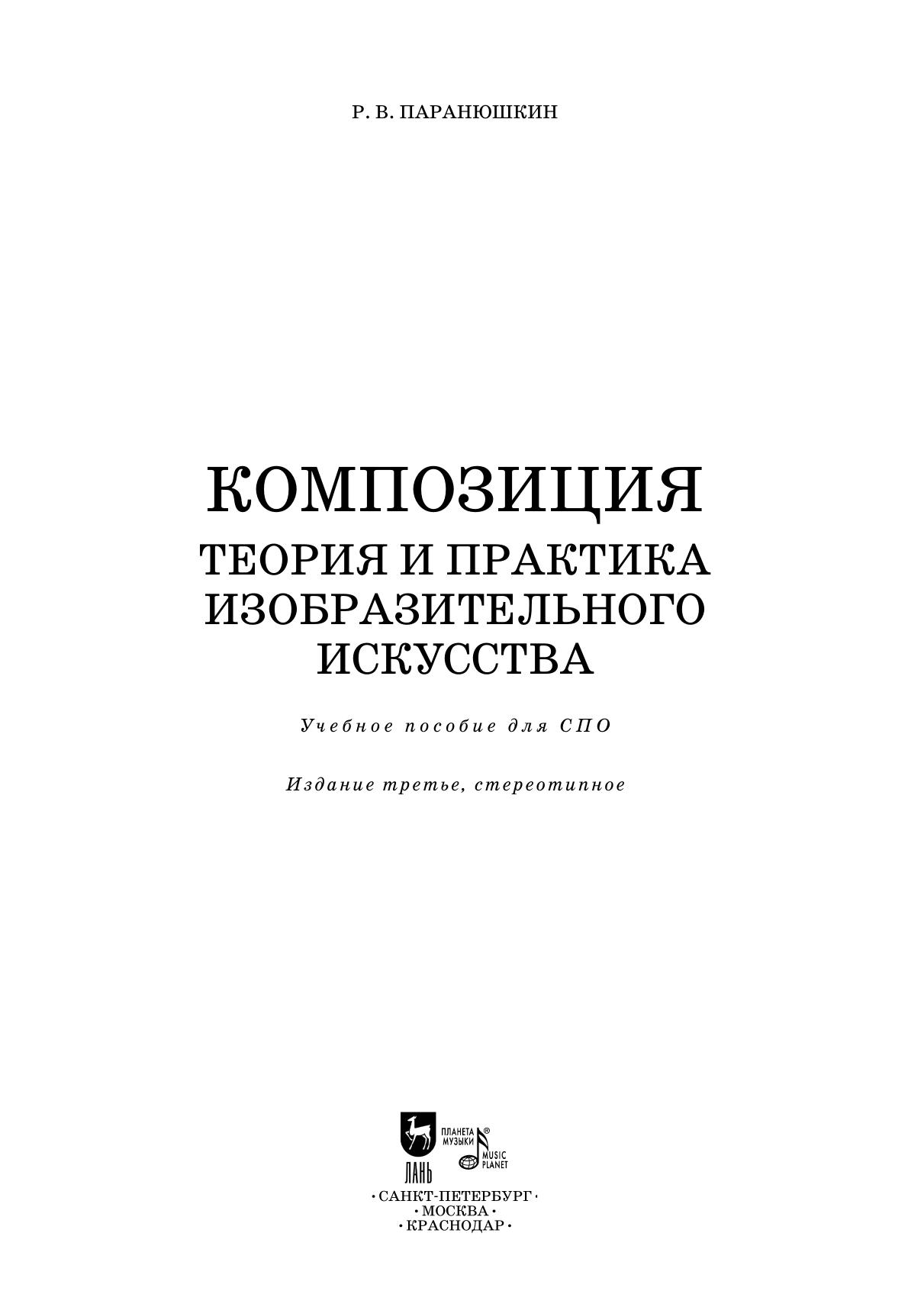 The author in accordance with the educational standards and on the basis of extensive practical experience in the fine arts considers the formal and semantic laws of composition, analyzes works of art, gives a general picture of the composition process. The book is illustrated with works of masters of arts, colleagues of R.V. Paranyushkin – artists, teachers, with academic works of students, as well as with the author's own works.