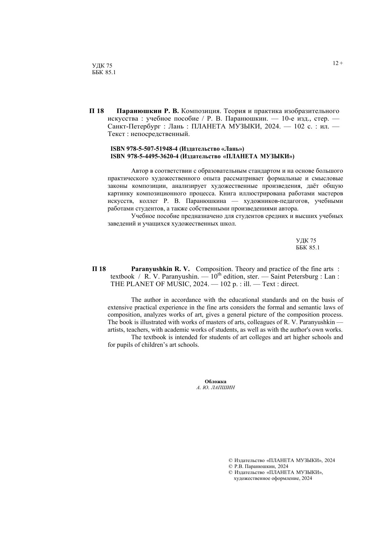 Автор в соответствии с образовательным стандартом и на основе большого практического художественного опыта рассматривает формальные и смысловые законы композиции, анализирует художественные произведения, даёт общую картинку композиционного процесса. Книга иллюстрирована работами мастеров искусств, коллег Р. В. Паранюшкина — художников-педагогов, учебными работами студентов, а также собственными произведениями автора. Учебное пособие предназначено для студентов средних и высших учебных заведений и учащихся художественных школ. The author in accordance with the educational standards and on the basis of extensive practical experience in the fine arts considers the formal and semantic laws of composition, analyzes works of art, gives a general picture of the composition process. The book is illustrated with works of masters of arts, colleagues of R.V. Paranyushkin – artists, teachers, with academic works of students, as well as with the author's own works. The textbook is intended for students of art colleges and art high schools and for pupils of children’s art schools.