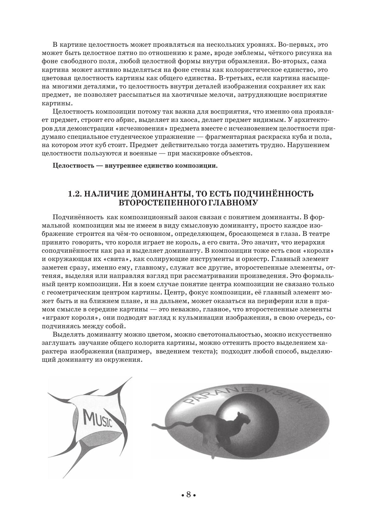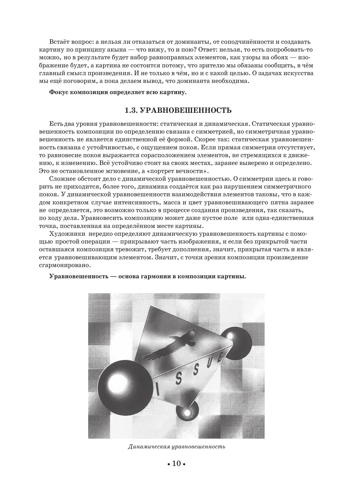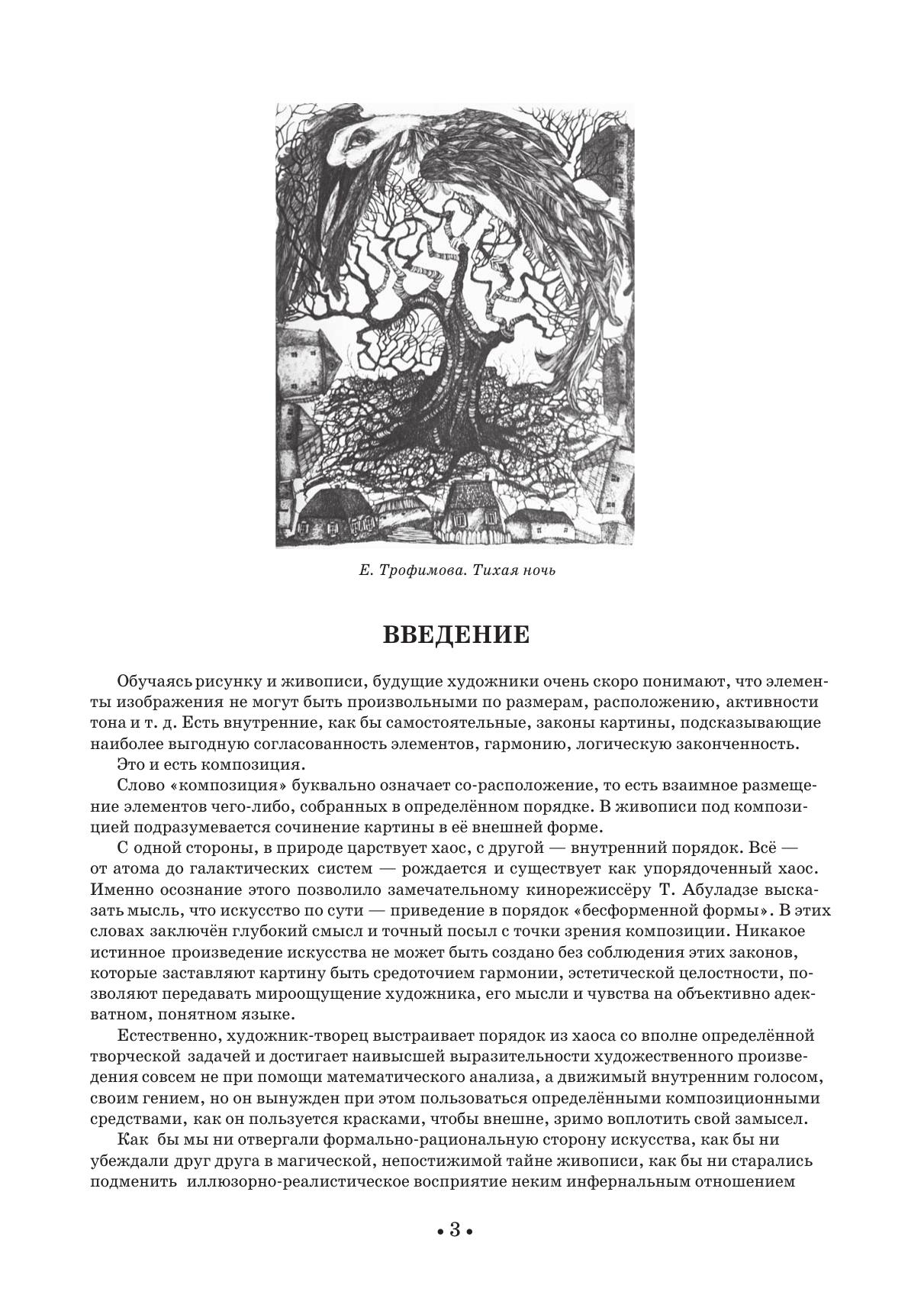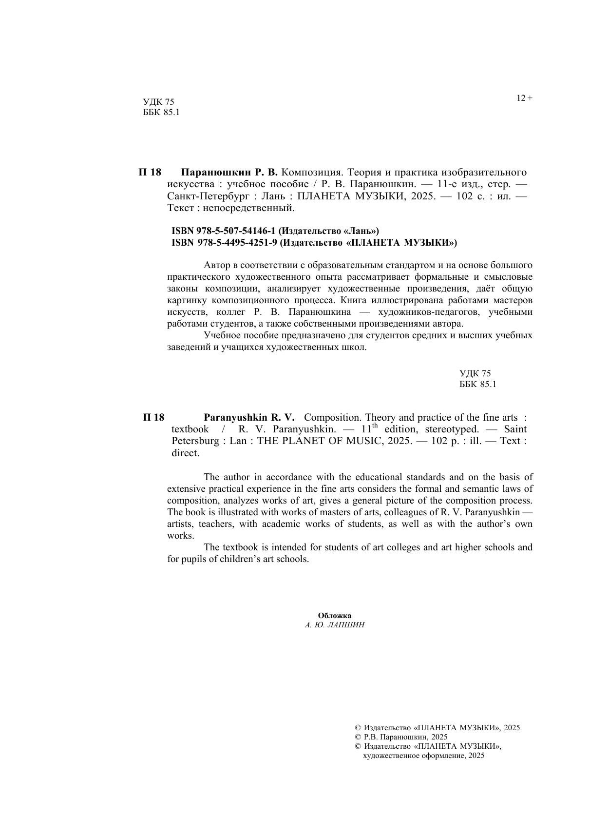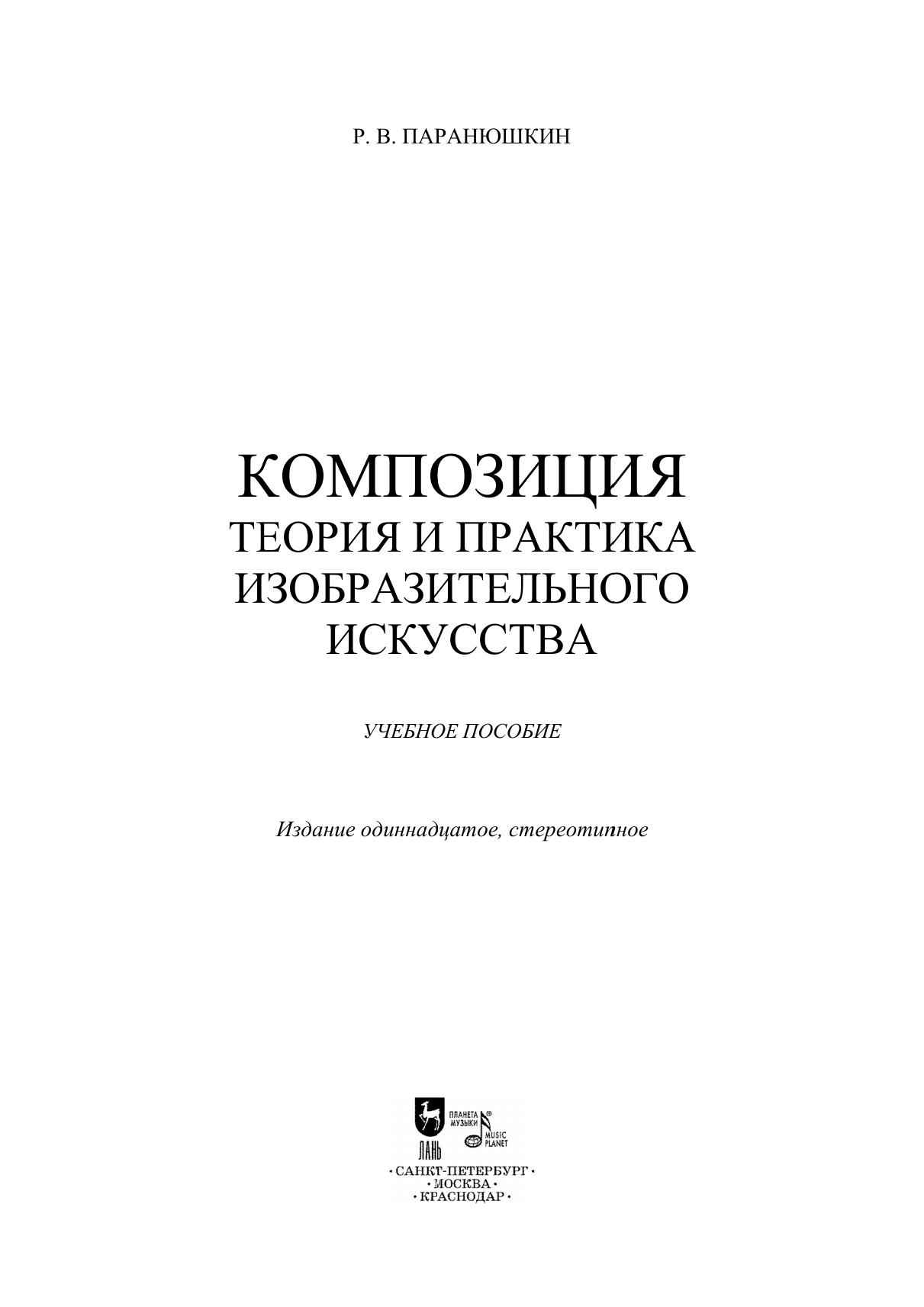 Автор в соответствии с образовательным стандартом и на основе большого практического художественного опыта рассматривает формальные и смысловые законы композиции, анализирует художественные произведения, даёт общую картинку композиционного процесса. Книга иллюстрирована работами мастеров искусств, коллег Р. В. Паранюшкина — художников-педагогов, учебными работами студентов, а также собственными произведениями автора. Учебное пособие предназначено для студентов средних и высших учебных заведений и учащихся художественных школ. The author in accordance with the educational standards and on the basis of extensive practical experience in the fine arts considers the formal and semantic laws of composition, analyzes works of art, gives a general picture of the composition process. The book is illustrated with works of masters of arts, colleagues of R.V. Paranyushkin – artists, teachers, with academic works of students, as well as with the author's own works. The textbook is intended for students of art colleges and art high schools and for pupils of children’s art schools.