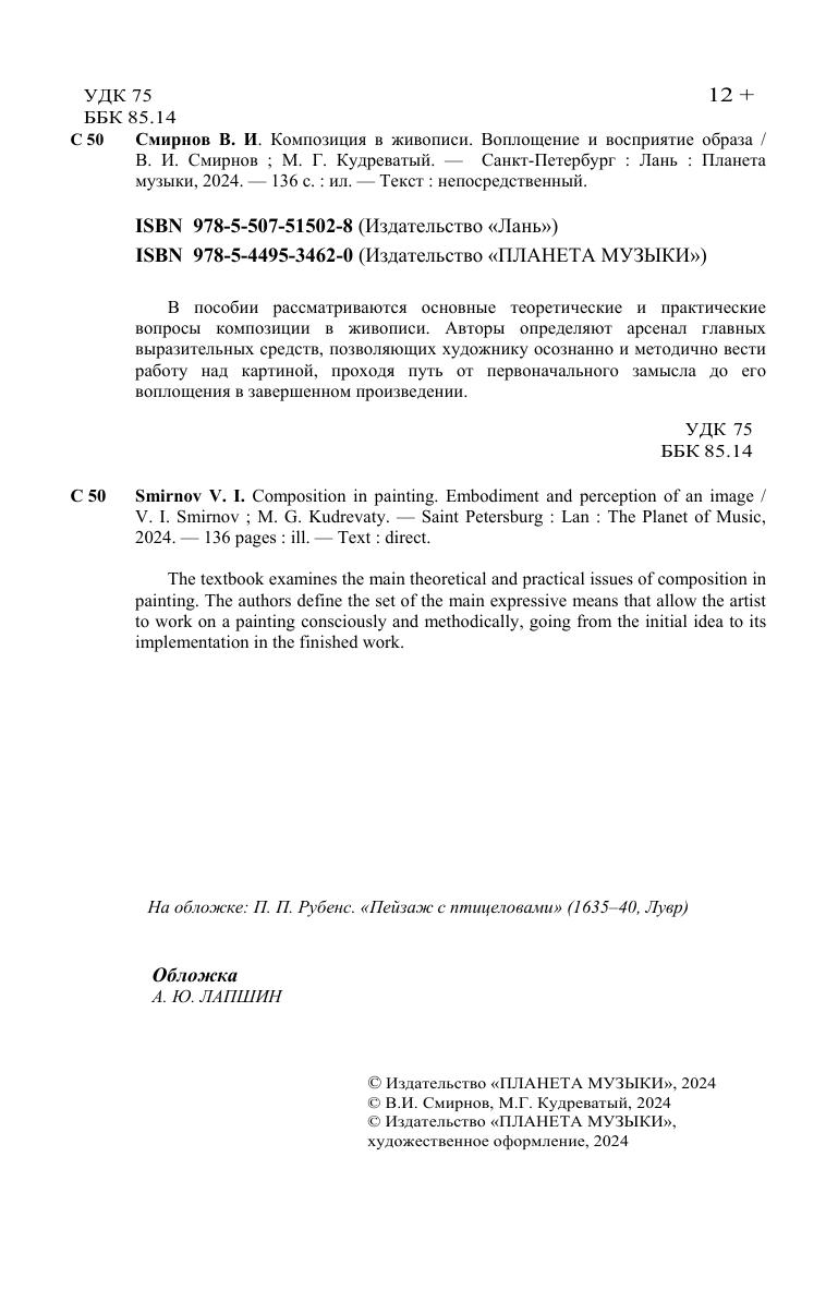 В пособии рассматриваются основные теоретические и практические вопросы композиции в живописи. Авторы определяют арсенал главных выразительных средств, позволяющих художнику осознанно и методично вести работу над картиной, проходя путь от первоначального замысла до его воплощения в завершенном произведении. The textbook examines the main theoretical and practical issues of composition in painting. The authors define the set of the main expressive means that allow the artist to work on a painting consciously and methodically, going from the initial idea to its implementation in the finished work.