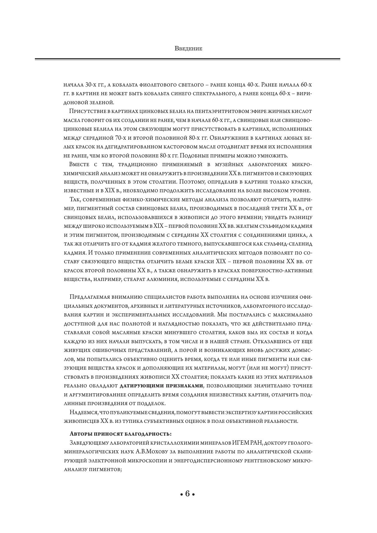 Изучение официальных, литературных и архивных источников, лабораторное исследование картин позволило авторам получить наиболее полное на сегодняшний день представление о пигментах и связующих веществах художественных масляных красок, используемых в живописи ХХ в. Впервые публикуемый в таком объеме материал открывает новые возможности в проведении объективной, научно обоснованной атрибуции и экспертизе неизвестных произведений русской живописи ХХ столетия.