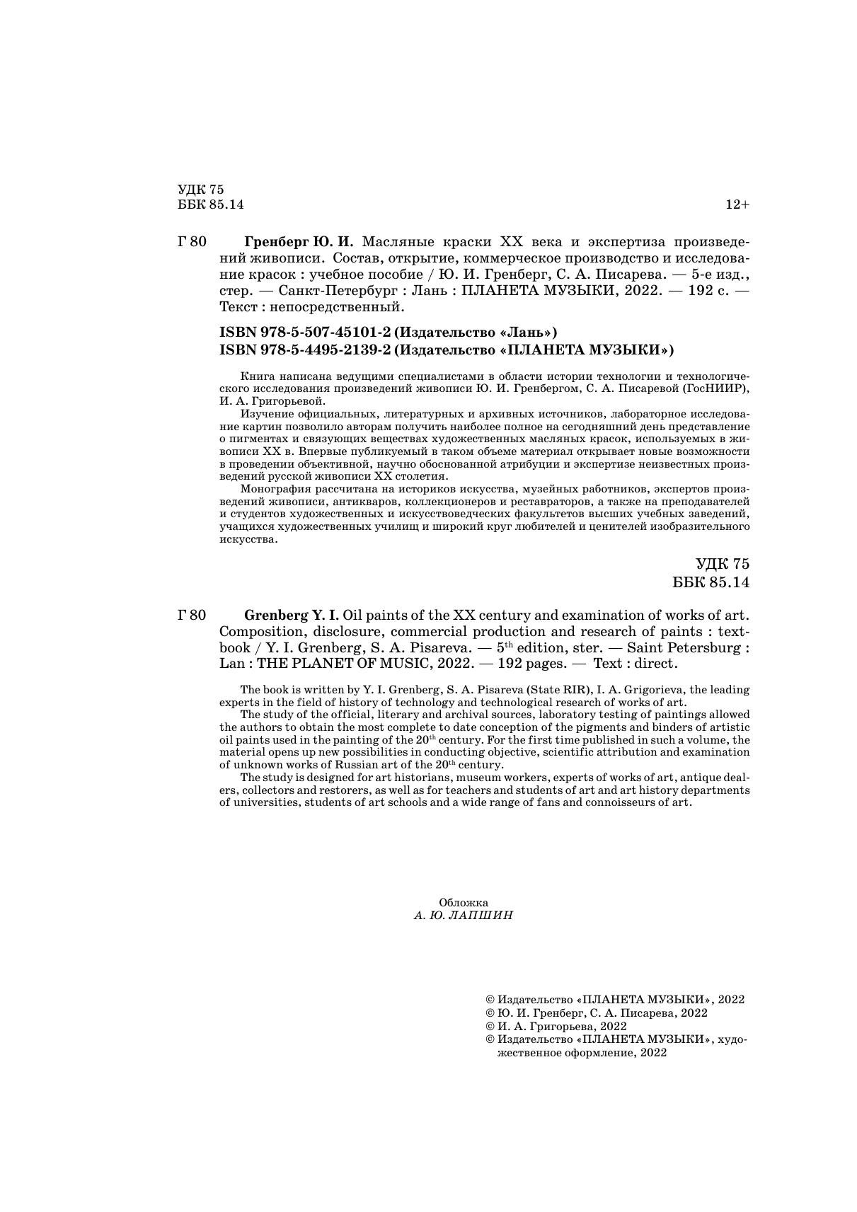 Книга написана ведущими специалистами в области истории технологии и технологического исследования произведений живописи Ю.И.Гренбергом, С.А.Писаревой (ГосНИИР), И.А.Григорьевой.