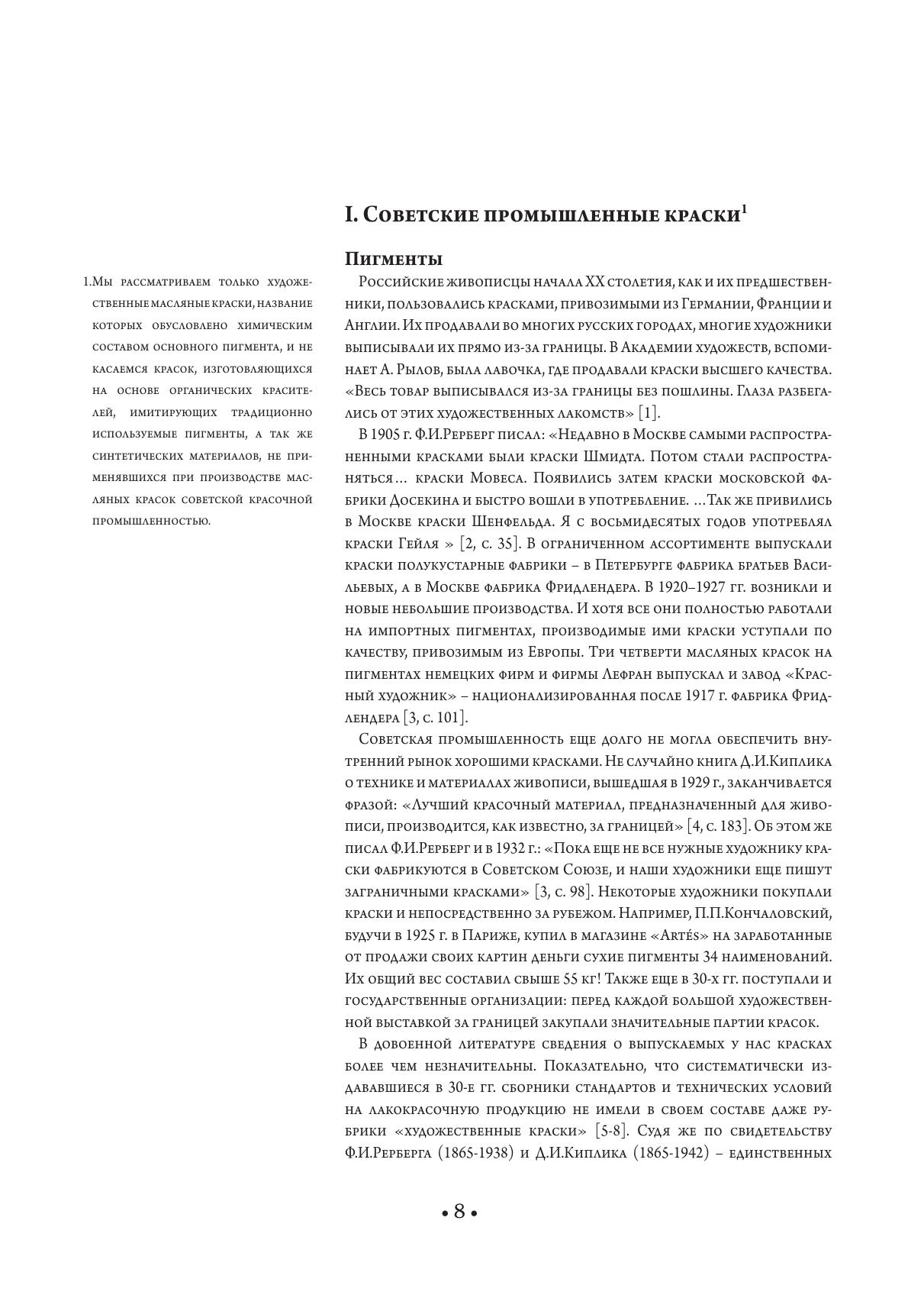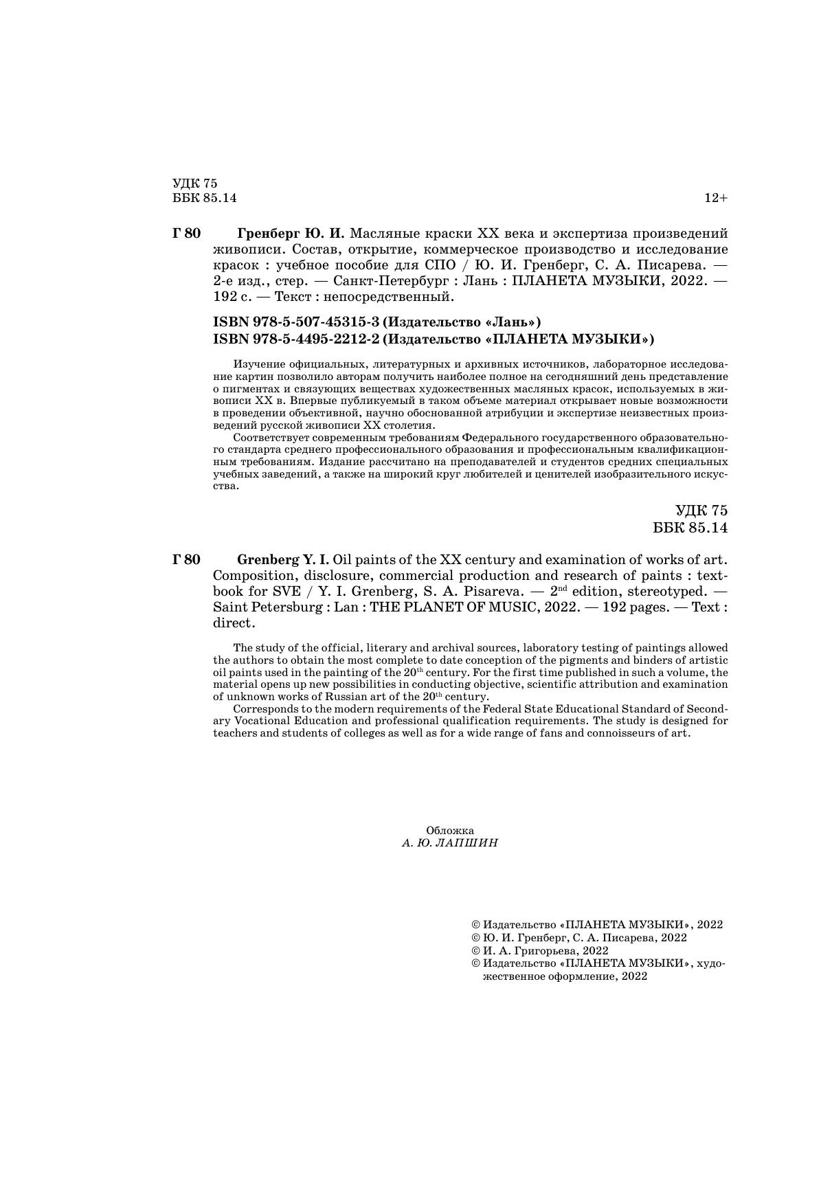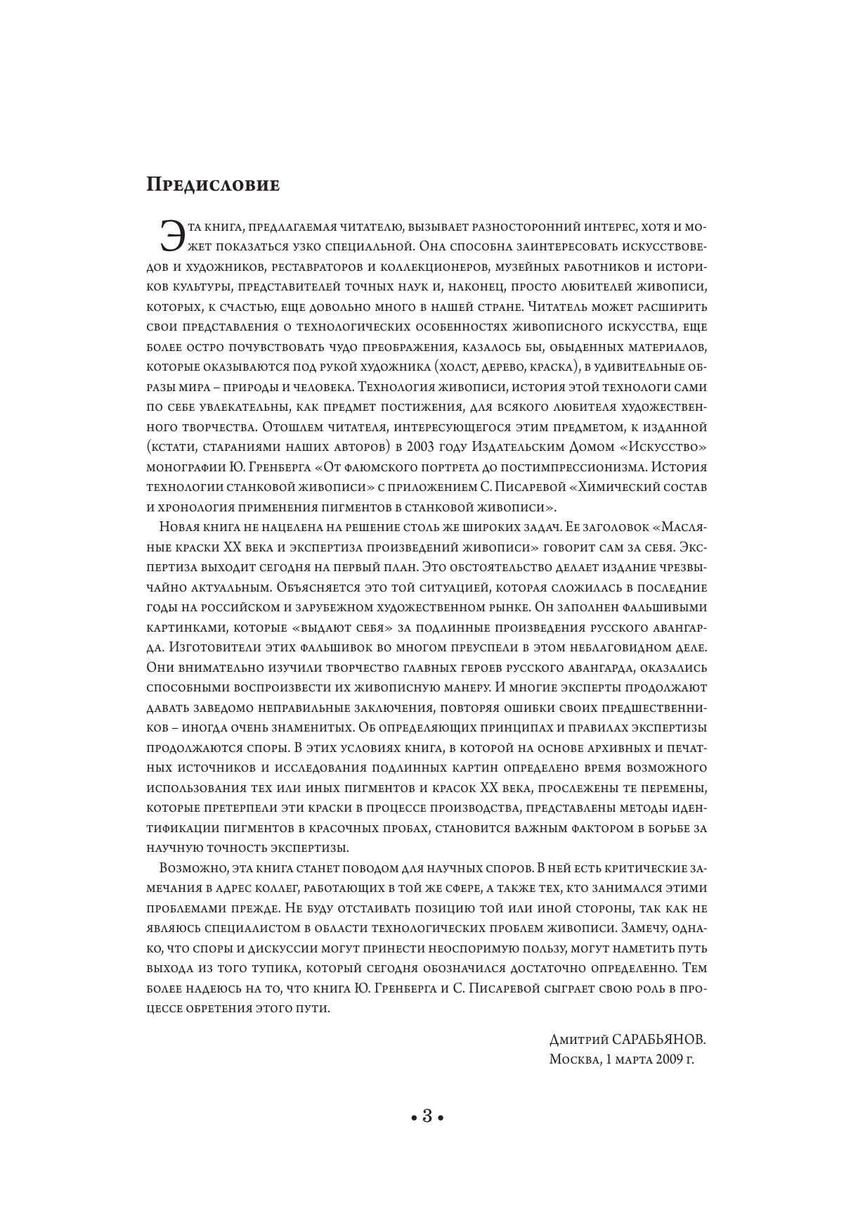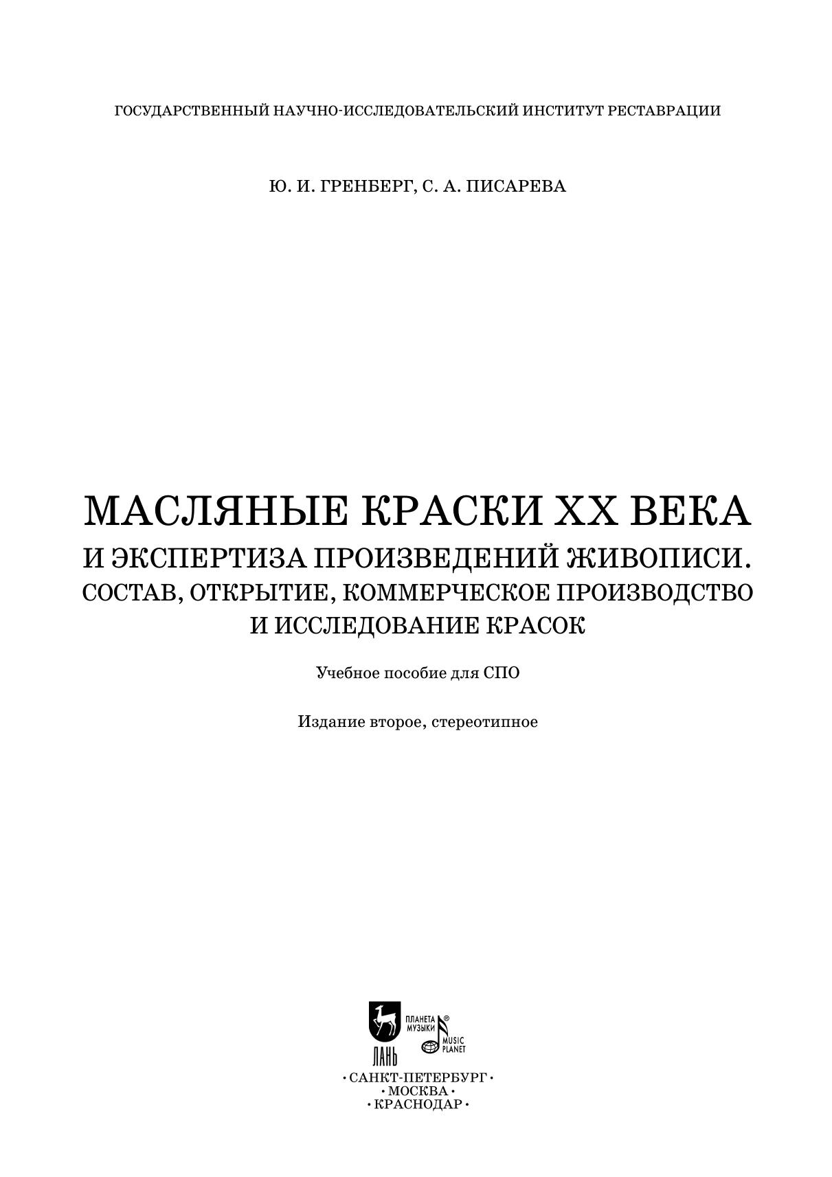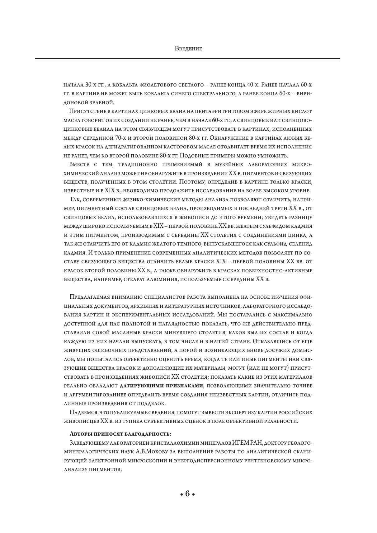 The study of the official, literary and archival sources, laboratory testing of paintings allowed the authors to obtain the most complete to date conception of the pigments and binders of artistic oil paints used in the painting of the 20th century. For the first time published in such a volume the material opens up new possibilities in conducting objective, scientific attribution and examination of unknown works of Russian art of the 20th century.