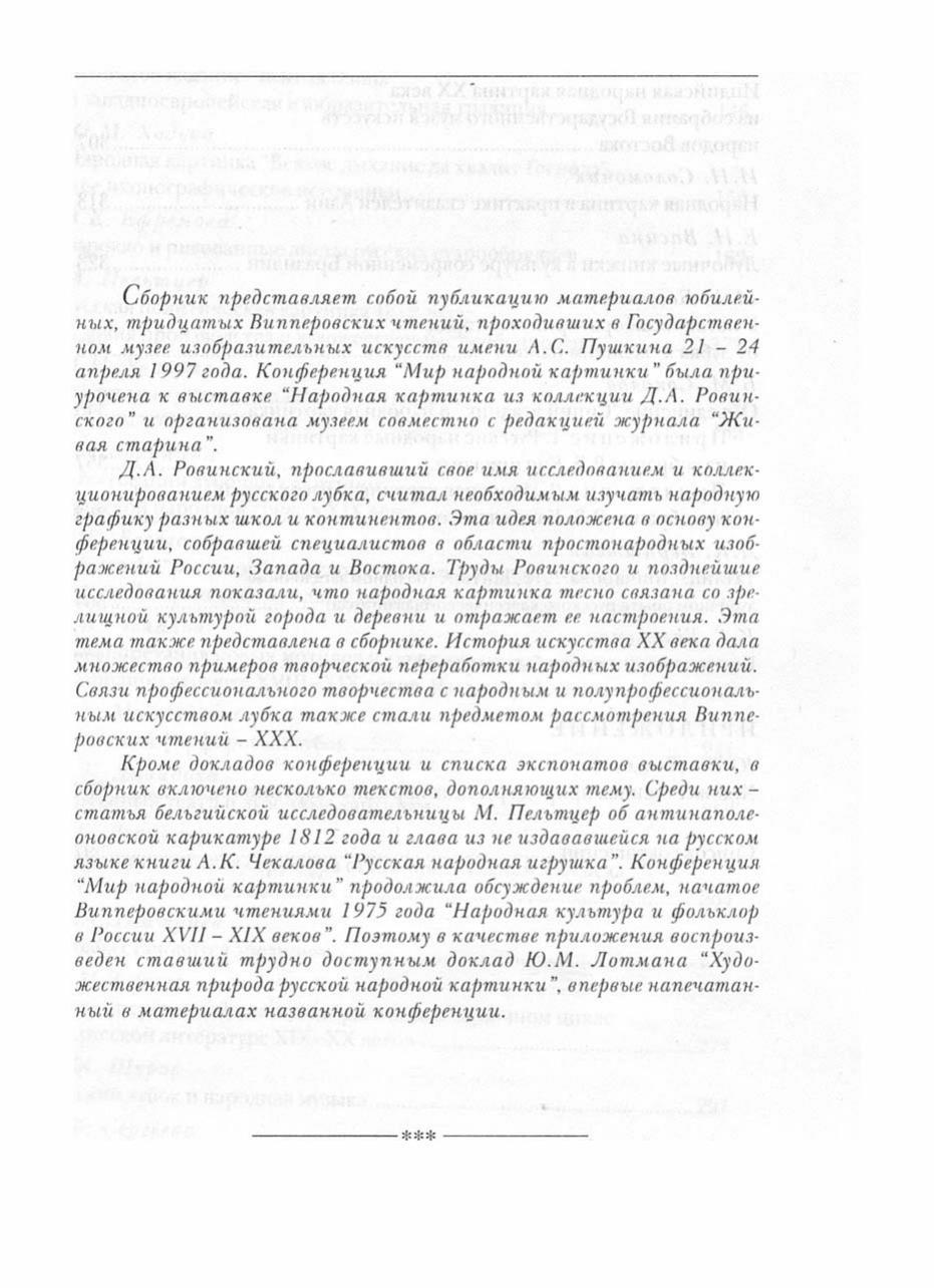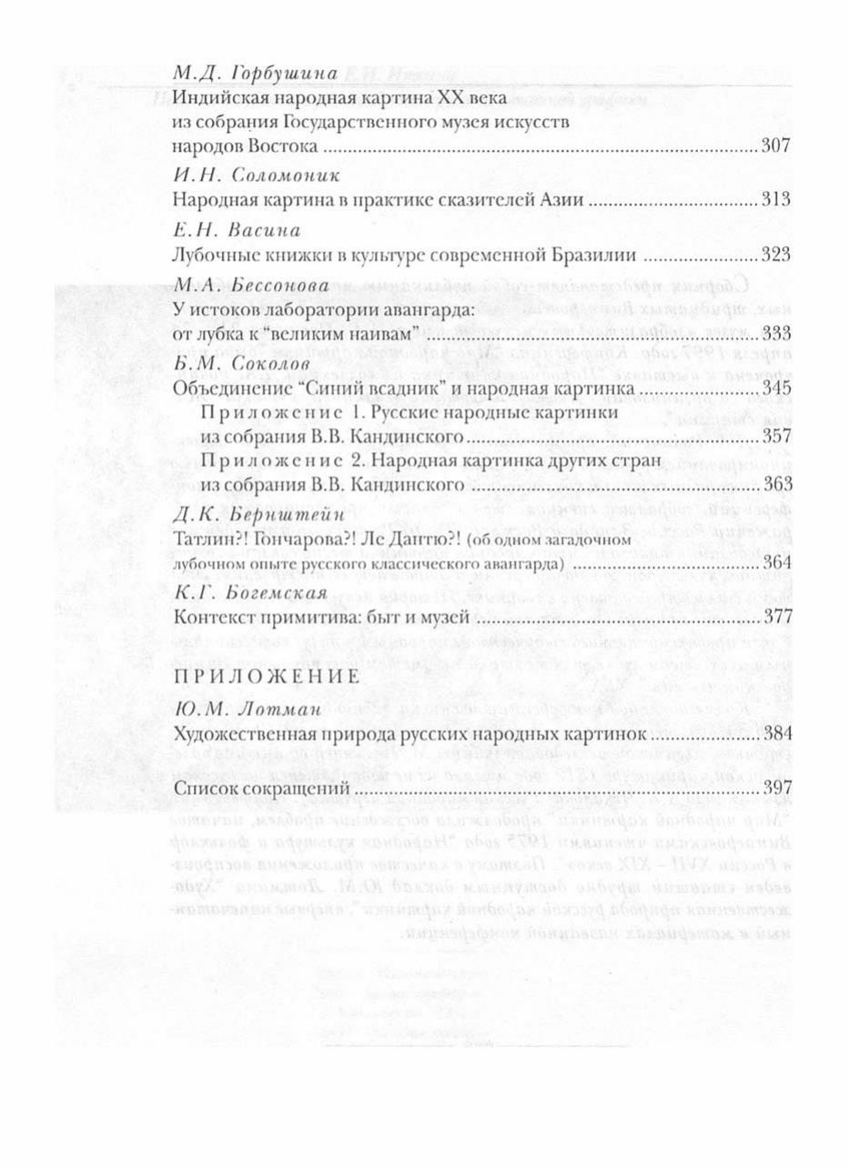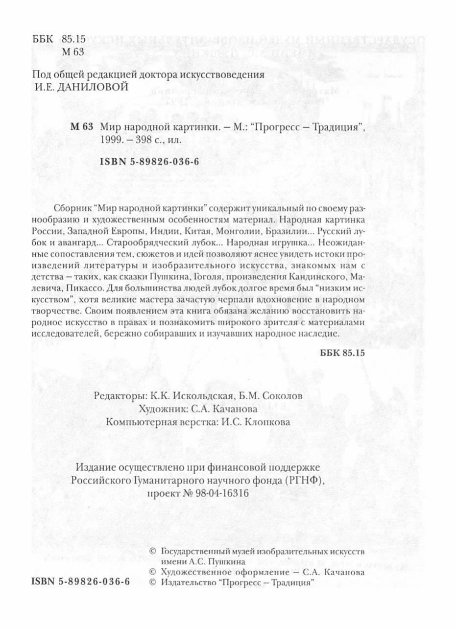 Сборник "Мир народной картинки" содержит уникальный по своему разнообразию и художественным особенностям материал. Народная картинка России, Западной Европы, Индии, Китая, Монголии, Бразилии... Русский лубок и авангард... Старообрядческий лубок... Народная игрушка... Неожиданные сопоставления тем, сюжетов и идей позволяют яснее увидеть истоки произведений литературы и изобразительного искусства, знакомых нам с детства - таких, как сказки Пушкина, Гоголя, произведения Кандинского, Малевича, Пикассо. Для большинства людей лубок долгое время был "низким искусством", хотя великие мастера зачастую черпали вдохновение в народном творчестве. Своим появлением эта книга обязана желанию восстановить народное искусство в правах и познакомить широкого зрителя с материалами исследователей, бережно собиравших и изучавших народное наследие.