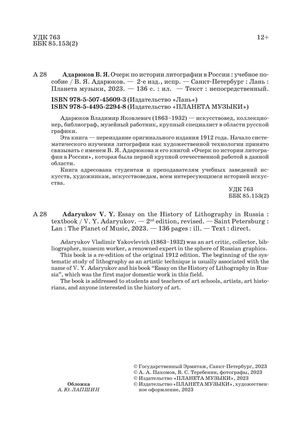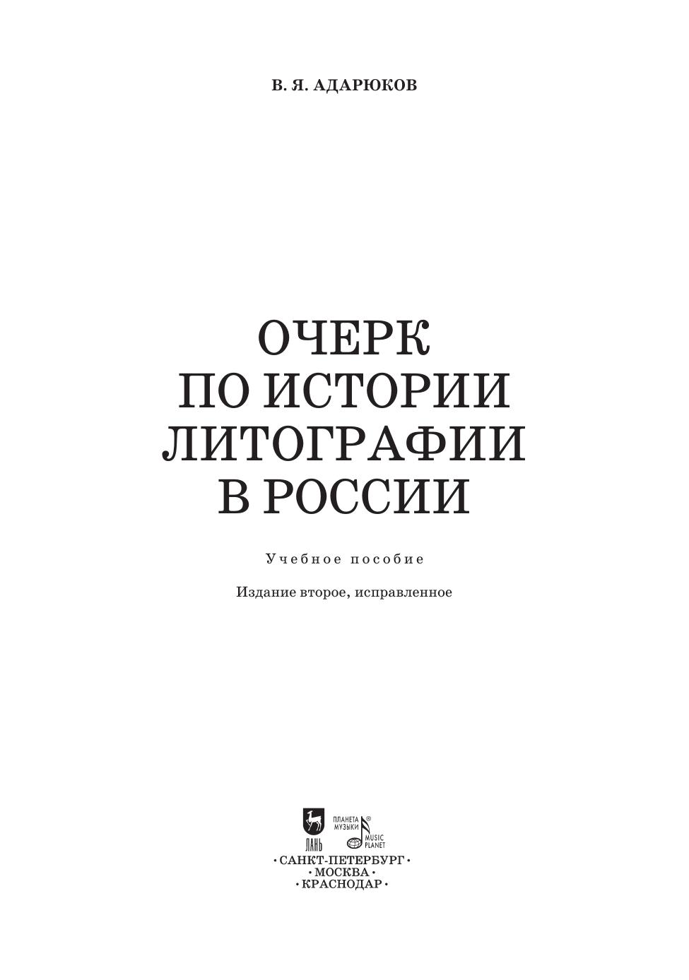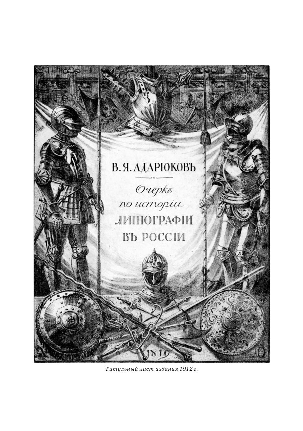 Эта книга — репринт оригинального издания 1912 года. Начало систематического изучения литографии как художественной технологии принято связывать с именем В.Я. Адарюкова и его книгой «Очерки по истории литографии в России», которая была первой крупной отечественной работой в данной области.