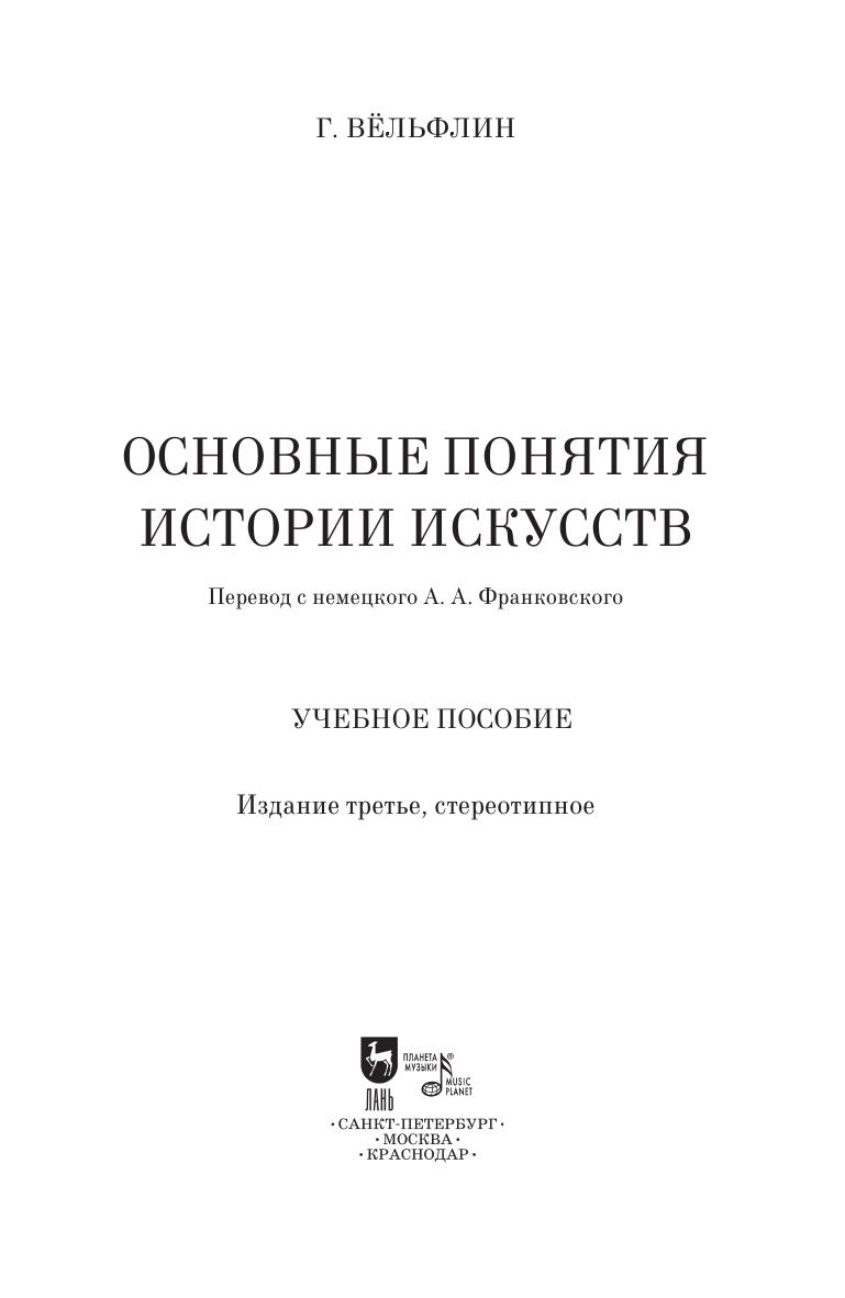 В книге Г. Вельфлина «Основные понятия истории искусств» (1915) автор занимается, как сам он пишет, не проблемами истории художников, а внутренней, естественной историей искусства – так называемой «историей искусства без имен». В работе шаг за шагом прослеживается возникновение и эволюция видения, зрительного восприятия в контексте истории искусств; в систематической последовательности показывается, как из одного стиля возникает другой, дается конкретная характеристика этих стилей.