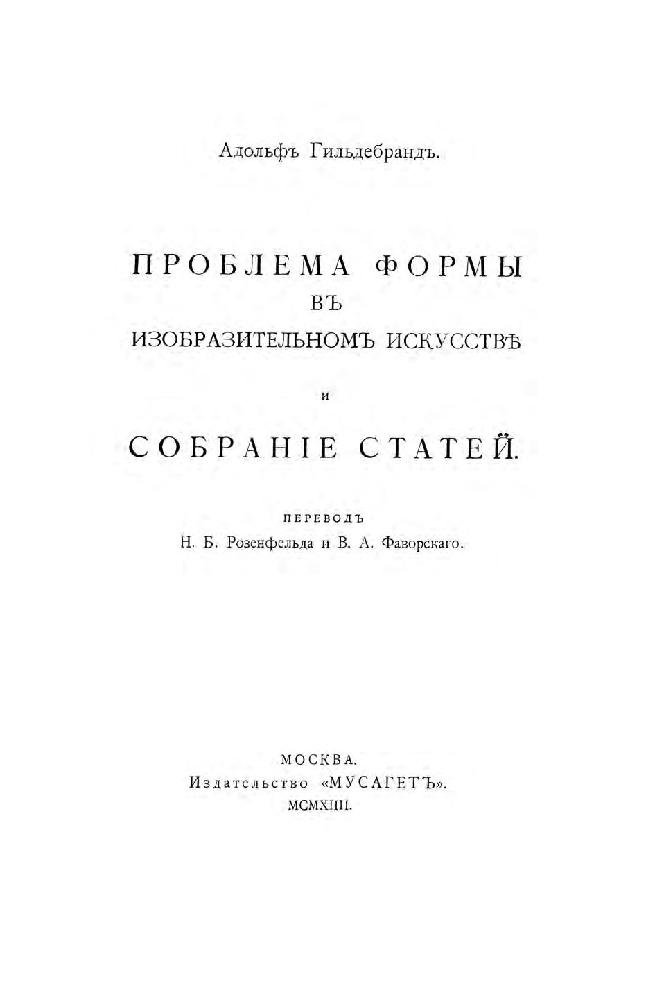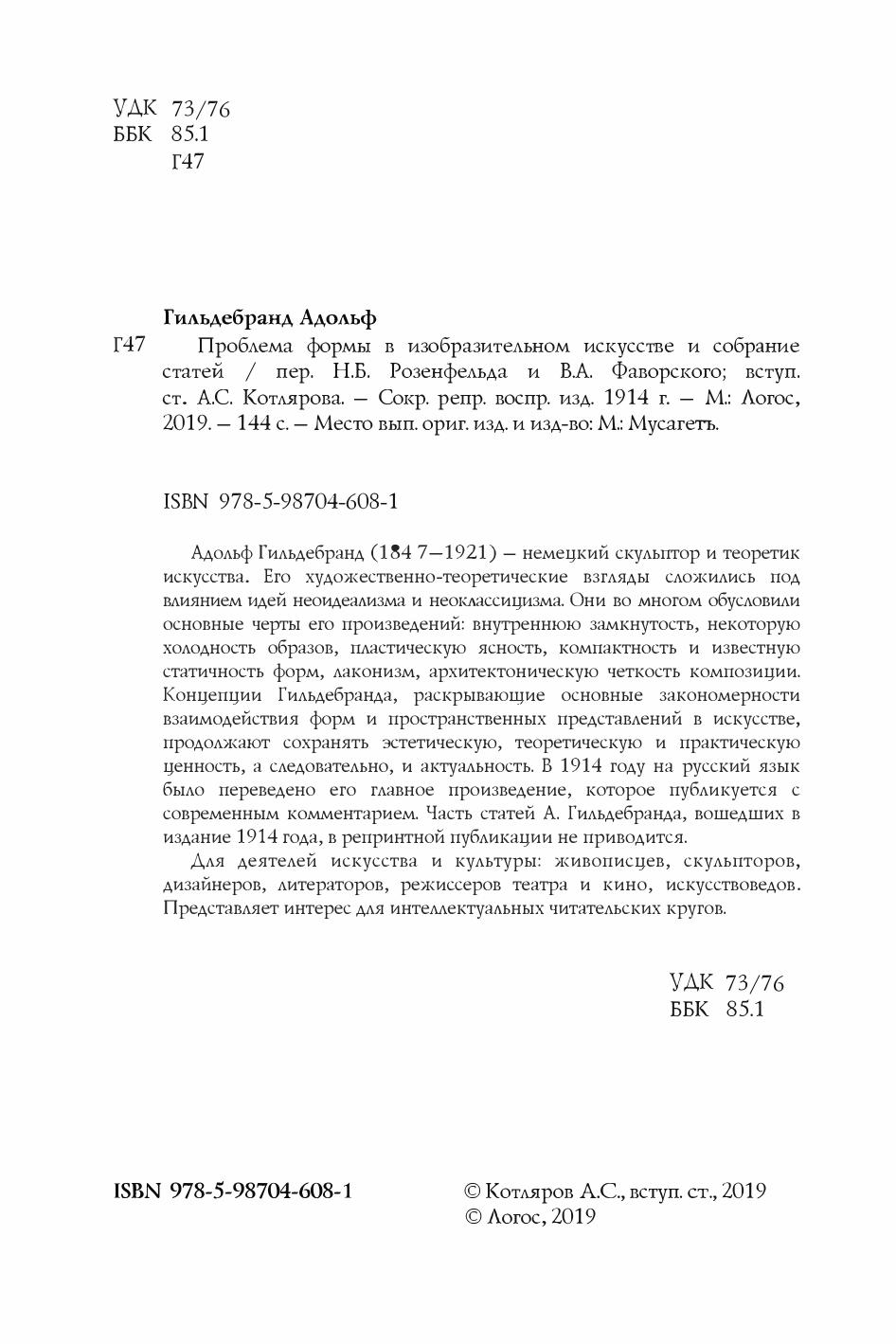 Адольф Гильдебранд (184 7-1921) - немечкий скульптор и теоретик искусства. Его художественно-теоретические взгляды сложились под влиянием идей неоидеализма и неоклассичизма. Они во многом обусловили основные черты его произведений: внутреннюю замкнутость, некоторую холодность образов, пластическую ясность, компактность и известную статичность форм, лаконизм, архитектоническую четкость композичии. Кончепчии Гильдебранда, раскрывающие основные закономерности взаимодействия форм и пространственных представлений в искусстве, продолжают сохранять эстетическую, теоретическую и практическую ченность, а следовательно, и актуальность. В 1914 году на русский язык было переведено его главное произведение, которое публикуется с современным комментарием. Часть статей А. Гильдебранда, вошедших в издание 1914 года, в репринтной публикачии не приводится. Для деятелей искусства и культуры: живописчев, скульпторов, дизайнеров, литераторов, режиссеров театра и кино, искусствоведов. Представляет интерес для интеллектуальных читательских круго