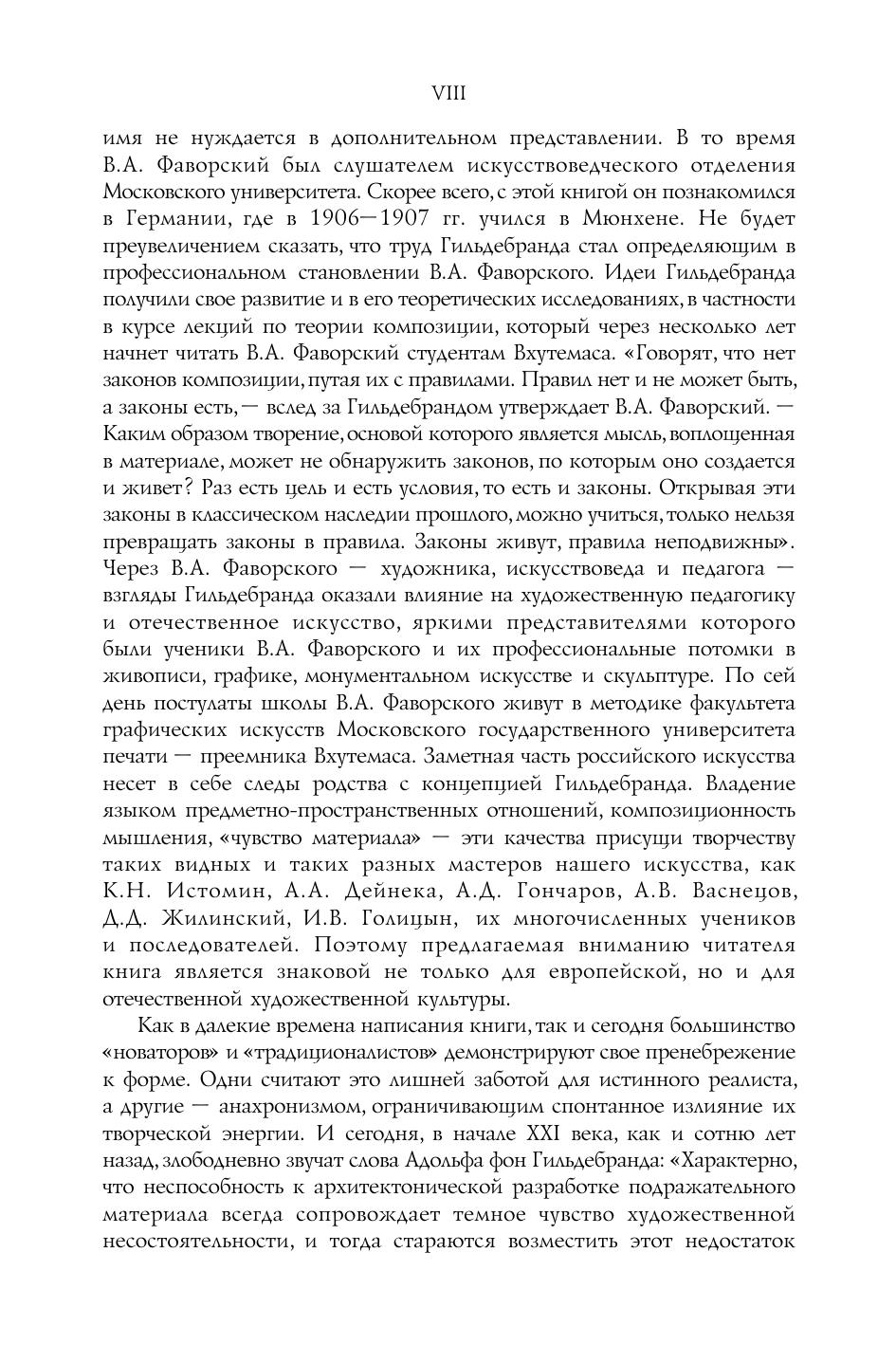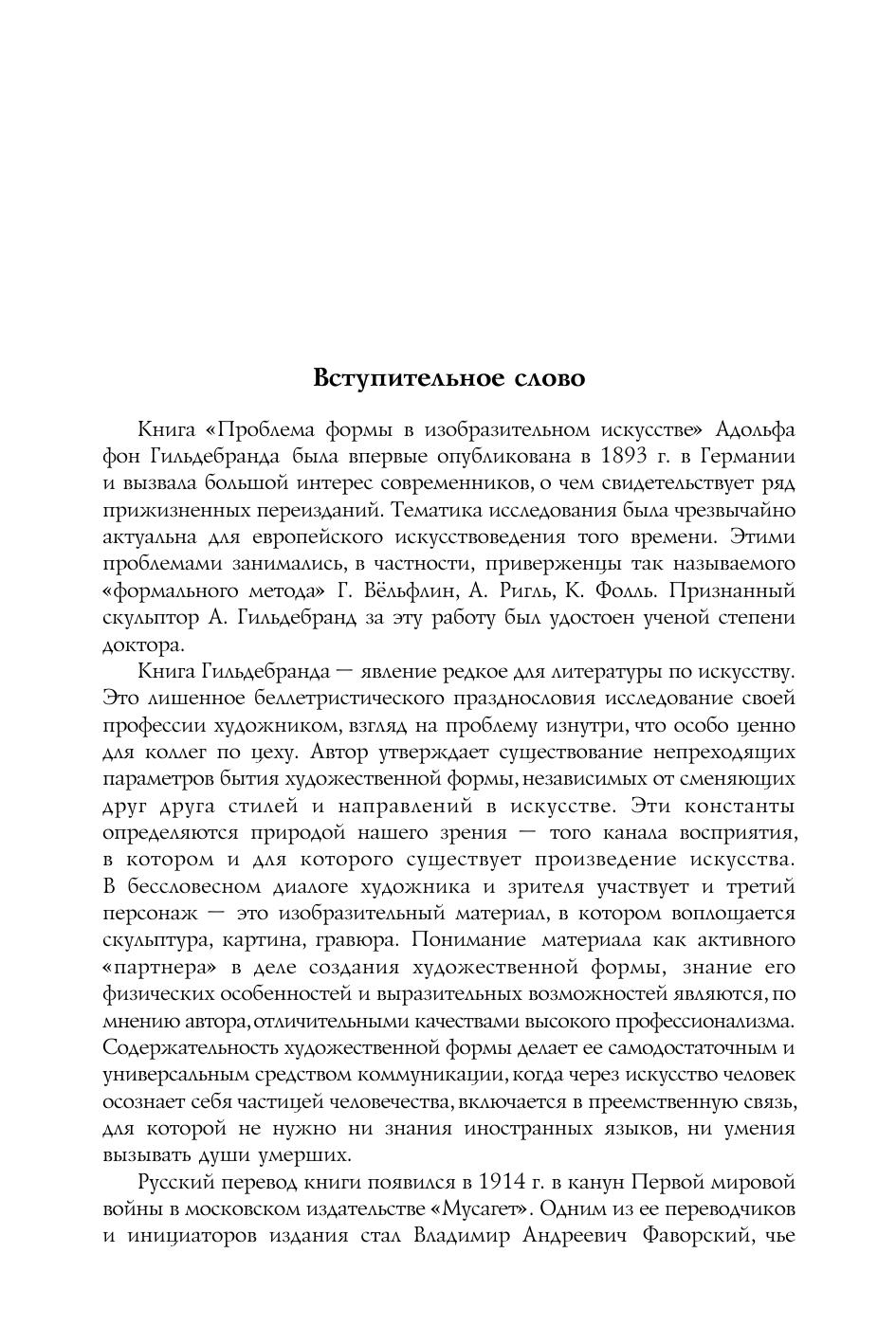 Адольф Гильдебранд (184 7-1921) - немечкий скульптор и теоретик искусства. Его художественно-теоретические взгляды сложились под влиянием идей неоидеализма и неоклассичизма. Они во многом обусловили основные черты его произведений: внутреннюю замкнутость, некоторую холодность образов, пластическую ясность, компактность и известную статичность форм, лаконизм, архитектоническую четкость композичии. Кончепчии Гильдебранда, раскрывающие основные закономерности взаимодействия форм и пространственных представлений в искусстве, продолжают сохранять эстетическую, теоретическую и практическую ченность, а следовательно, и актуальность. В 1914 году на русский язык было переведено его главное произведение, которое публикуется с современным комментарием. Часть статей А. Гильдебранда, вошедших в издание 1914 года, в репринтной публикачии не приводится. Для деятелей искусства и культуры: живописчев, скульпторов, дизайнеров, литераторов, режиссеров театра и кино, искусствоведов . Представляет интерес для интеллектуальных читательских кругов.
